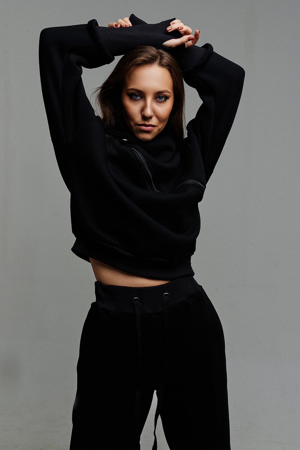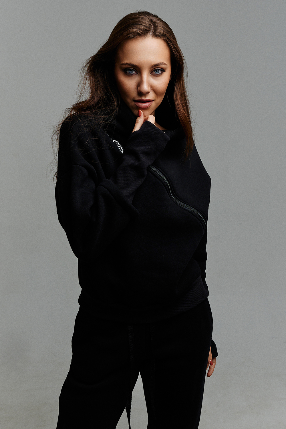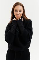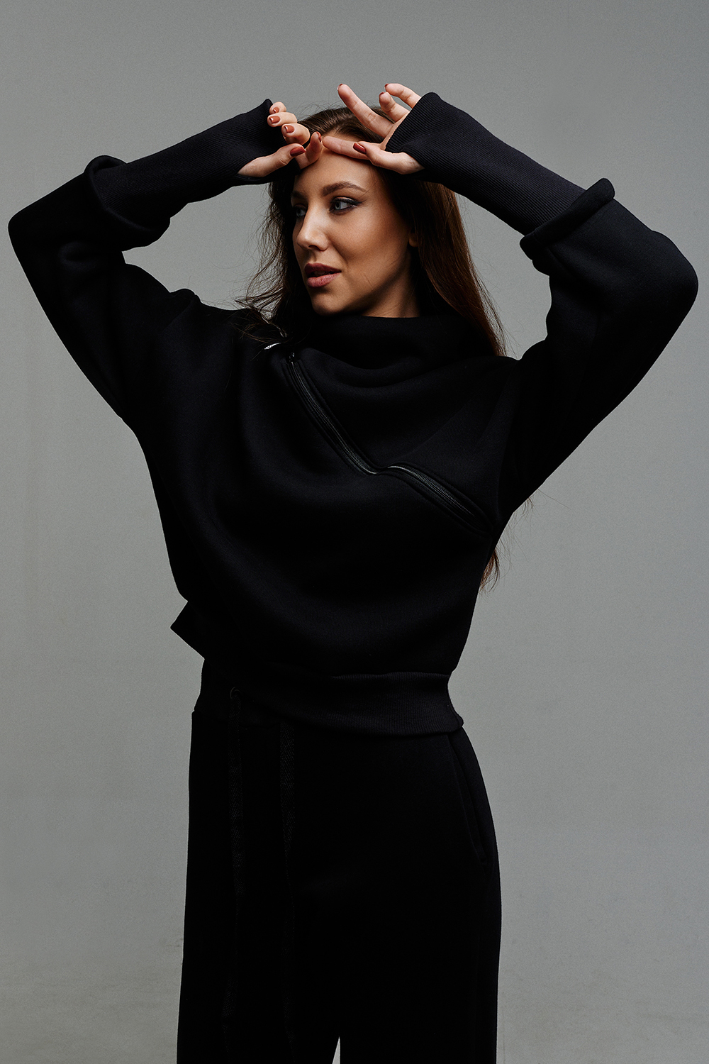 Удобный и стильный женский спортивный костюм. Состоит из свитшота и брюк-" джогеров". Толстовка и брюки оформлены функциональными, декоративными молниями. Толстовка с удобным воротником-стойкой, низ рукавов обработан высокой манжетой-перчаткойиз кашкорсе. Джогеры с высокой посадкой и широкой эластичной резинкой на поясе со шнурком. Низки брюк обработаны манжетами, что очень удобно при носке и отлично смотрятся с грубыми ботинками в стиле "челси". Спортивный костюм подходит как для зимних видов спорта, лыж, коньков, так и в холодную погоду осенью, весной. Расцветки "хаки" и "хаки с разрезом" отличаются отсутствием/наличием разреза на воротнике-стойке.