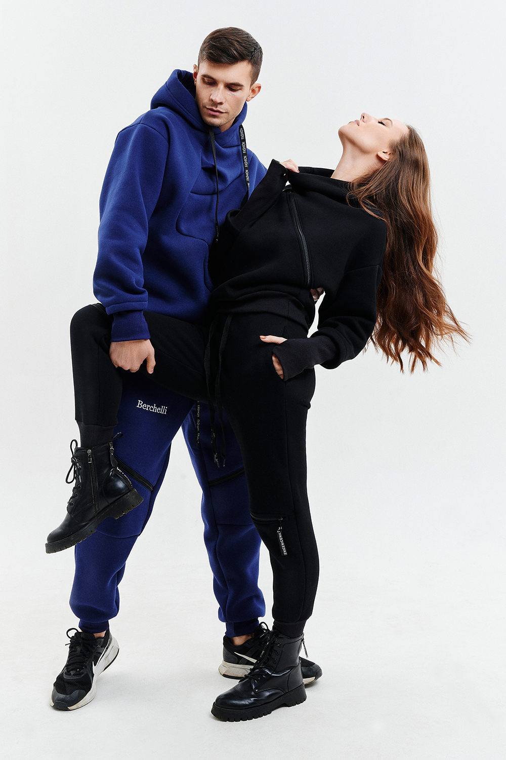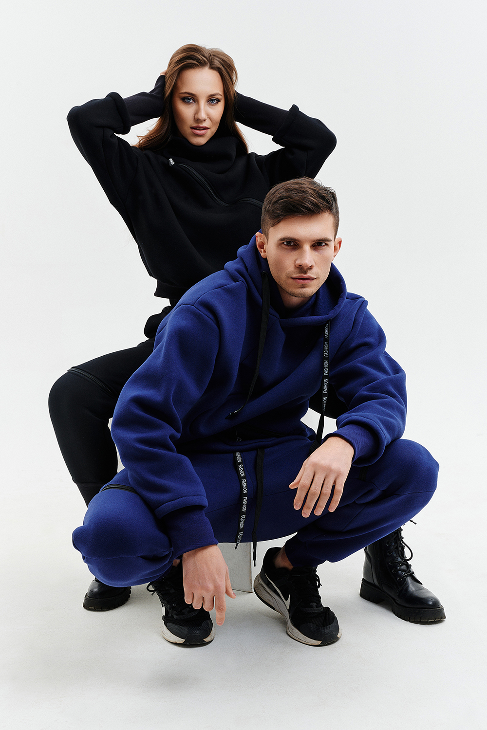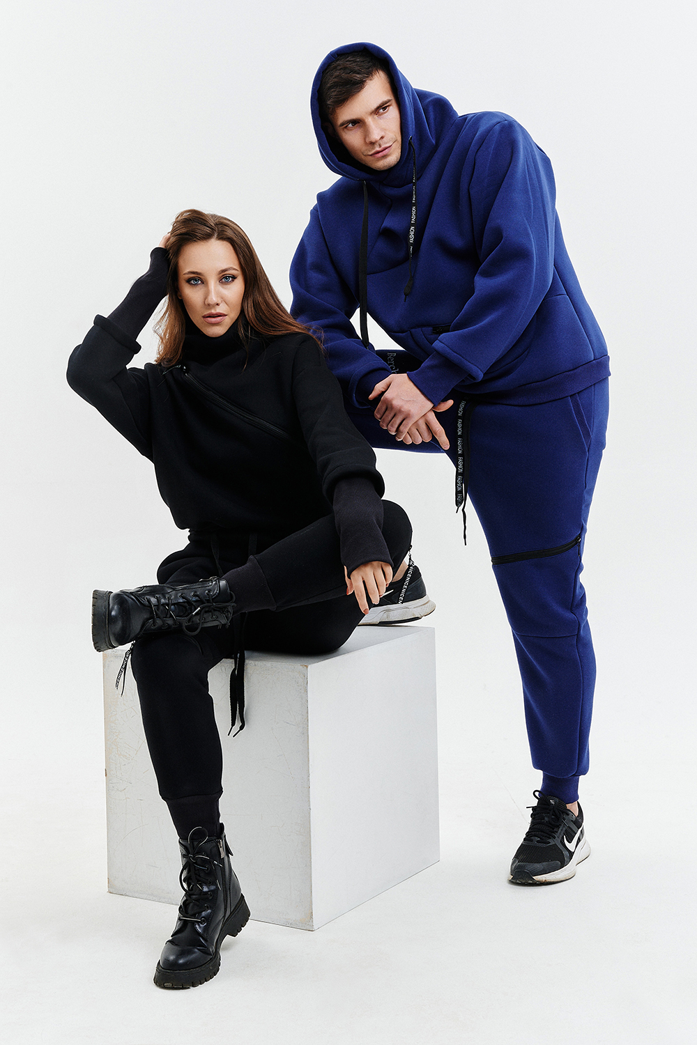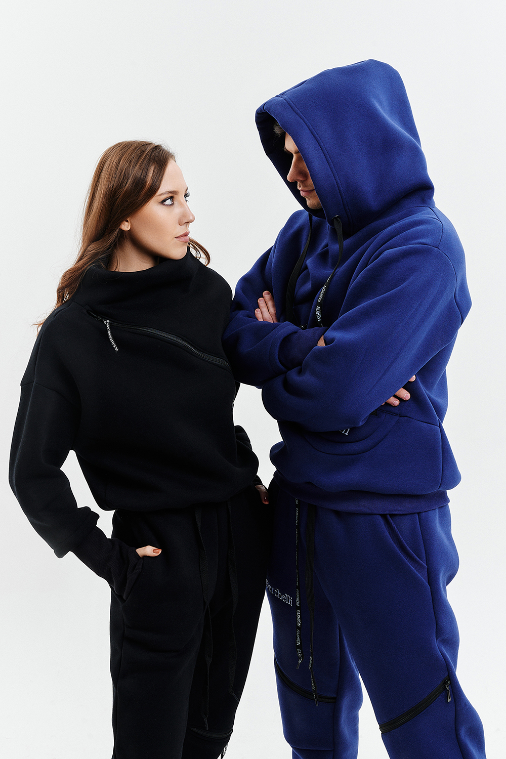 Удобный и стильный женский спортивный костюм. Состоит из свитшота и брюк-" джогеров". Толстовка и брюки оформлены функциональными, декоративными молниями. Толстовка с удобным воротником-стойкой, низ рукавов обработан высокой манжетой-перчаткойиз кашкорсе. Джогеры с высокой посадкой и широкой эластичной резинкой на поясе со шнурком. Низки брюк обработаны манжетами, что очень удобно при носке и отлично смотрятся с грубыми ботинками в стиле "челси". Спортивный костюм подходит как для зимних видов спорта, лыж, коньков, так и в холодную погоду осенью, весной. Расцветки "хаки" и "хаки с разрезом" отличаются отсутствием/наличием разреза на воротнике-стойке.