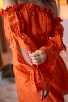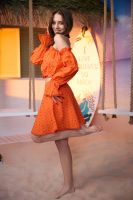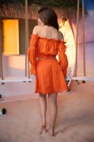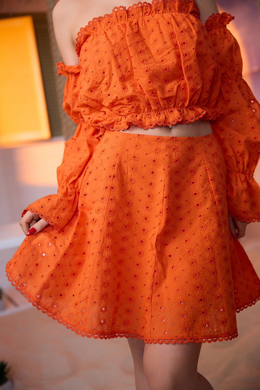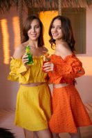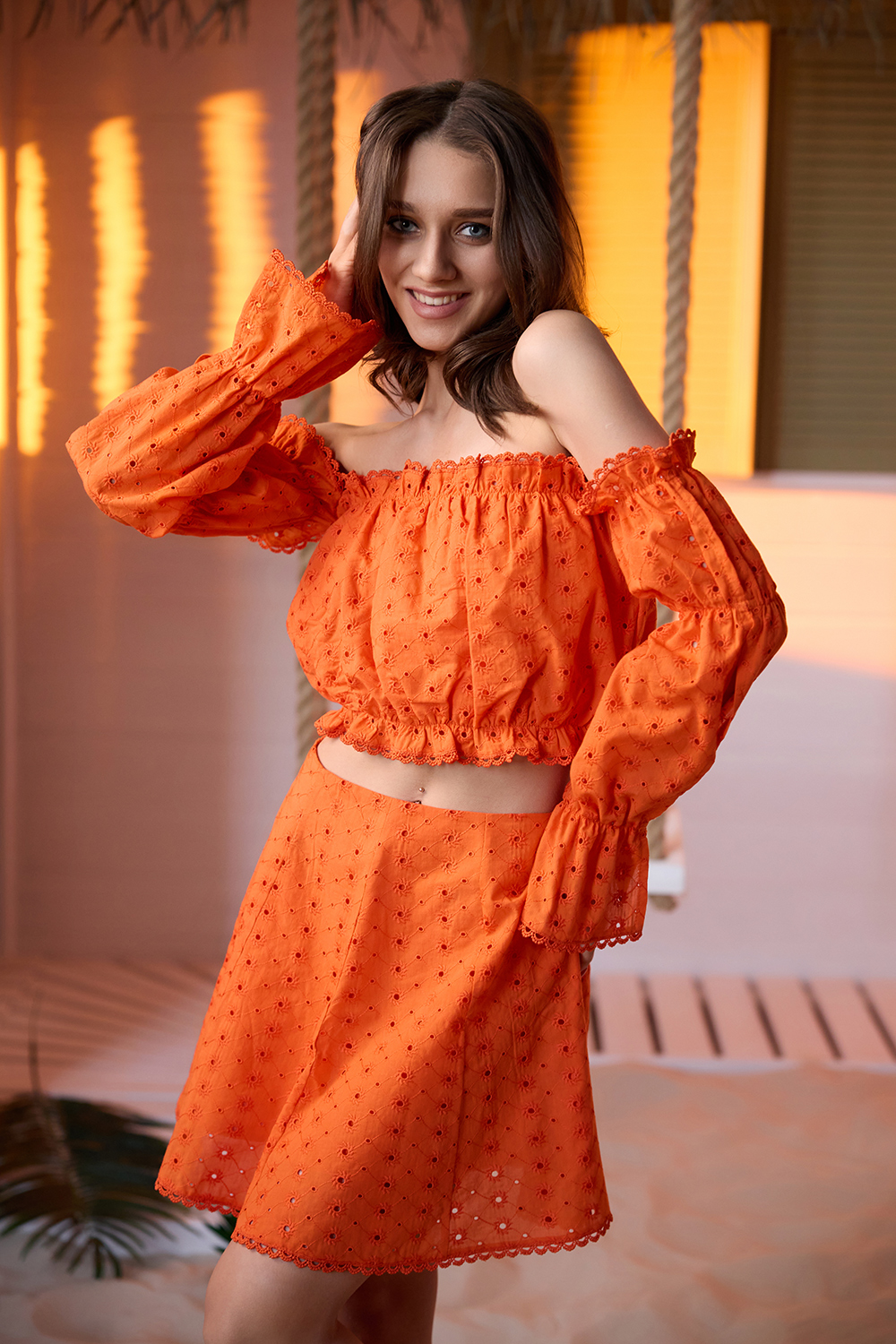 Молодежный костюм состоит из топа с открытыми плечами и с длинными рукавами, и мини юбки.