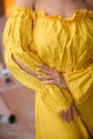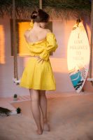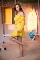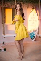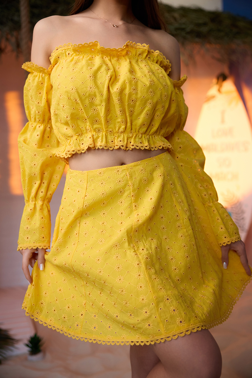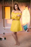 Молодежный костюм состоит из топа с открытыми плечами и с длинными рукавами, и мини юбки.