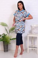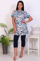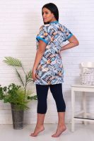 Костюм женский состоит из туники из кулирки и вискозных бриджей. Туника удлиненная на молнии, по линии талии проходит кулиска со шнуром, горловина с контрастной окантовкой. Рукав спущенный с контрастной окантовкой. Ткань с оригинальным принтом. Костюм подойдет для дома, отдыха и прогулок.