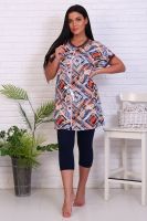 Костюм женский состоит из туники из кулирки и вискозных бриджей. Туника удлиненная на молнии, по линии талии проходит кулиска со шнуром, горловина с контрастной окантовкой. Рукав спущенный с контрастной окантовкой. Ткань с оригинальным принтом. Костюм подойдет для дома, отдыха и прогулок.