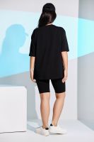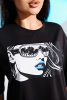 Костюм женский - футболка свободного кроя и облегающие бриджи выполнен из хлопка с лайкрой. Спереди на футболке оригинальный принт. Горловина обработана бейкой, низ изделия и рукав подшиты. Костюм очень удобный и приятный к телу, идеально подойдет как для дома, так и для прогулок и отдыха.