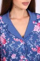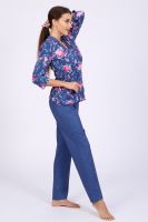 Женский костюм-пижама, состоящий из рубашки и брюк. Комплект сшит из трикотажного полотна нового поколения с цифровой печатью, которая не меняет цвет рисунка в процессе стирки. Содержание полиэстера в ткани позволяет изделию не менять свою форму в процессе носки и практически не мнется. Усадка костюма минимальна. Жакет-рубашка на пуговицах, воротник в английском стиле из ткани компаньона. Рукав 3/4, низ с имитацией манжета. Брюки на широкой резинке, низ брюк выполнен с имитацией манжета. Широкий размерный ряд с 44 по 56, большой ассортимент ярких расцветок на любой вкус. Можно носить, как домашний костюм и как пижаму. Рубашка свободного кроя для удобства домашнего ношения. Любителям носить в обтяжку рекомендуется брать на размер меньше (см. параметры в сантиметрах). Рекомендована стирка при 30-40 градусах в стиральной машине. Отличный подарок любимым женщинам.