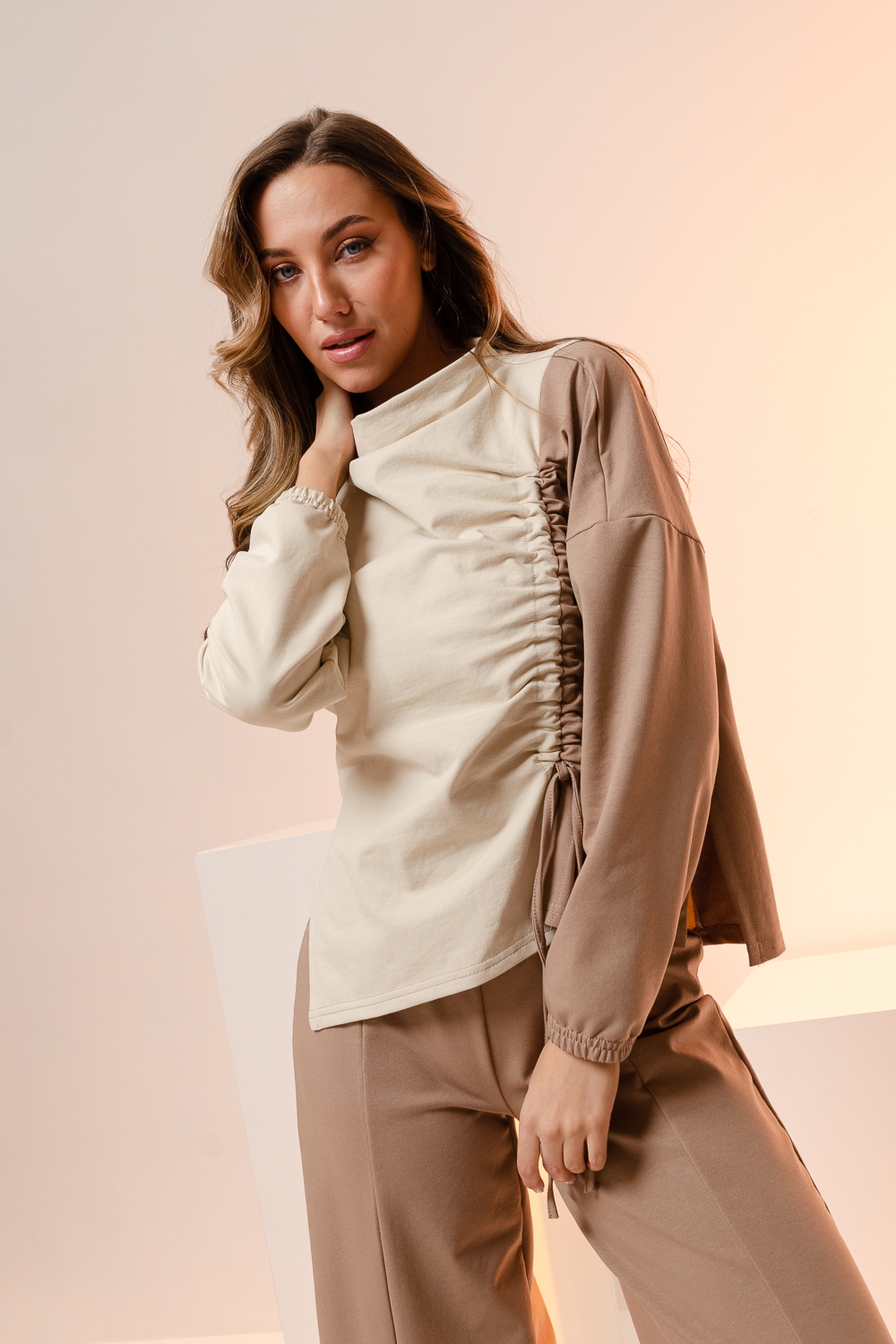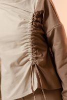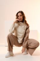 Костюм женский из хлопкового трикотажа - тонкий футер без утеплителя. Подойдет для повседневной носки и для вечерних выходов. Очень выгодный фасон и комбинация тканей, корректируют фигуру и вытягивают силуэт, скрывают недостатки и подчеркивают достоинства фигуры. Туника удлиненная по спинке, рукав полной длины, воротник-лодочка-стойка, крайне оригинальная ассиметричная драпировка с возможностью регулирования степени складок или полного их отсутствия. Брюки свободные широкие на креативном двойном поясе. Палаццо брюки добавляют образу элегантность и дополнительные вертикали, за счет которых силуэт вытягивается и становится стройнее. Брюки офисные или вечерние на резинке это комфорт и удобство в течении всего дня. Брюки на весну на прохладное лето и осень подойдут как для худеньких, так и для полных женщин.