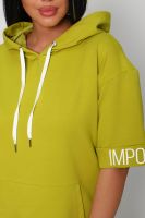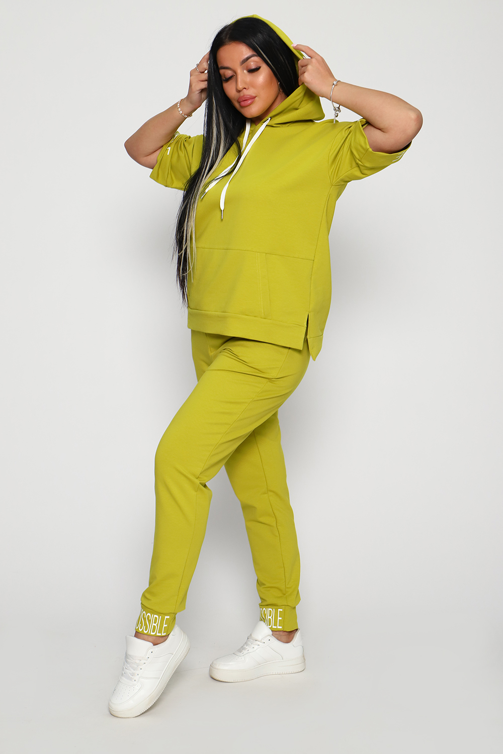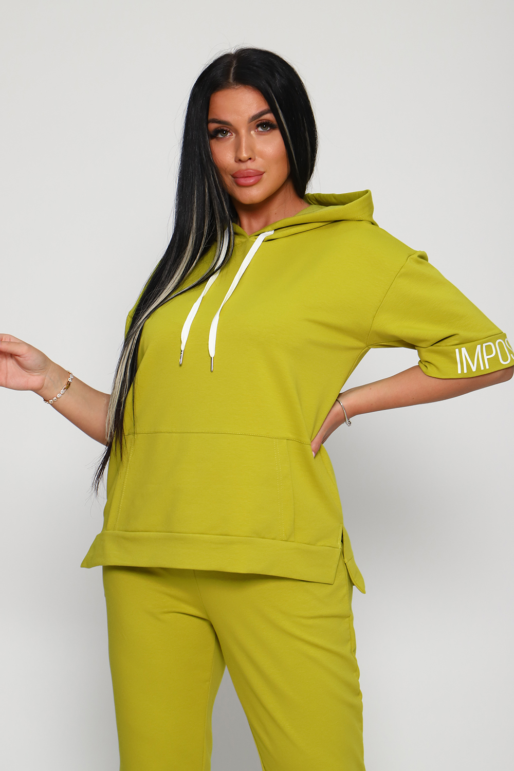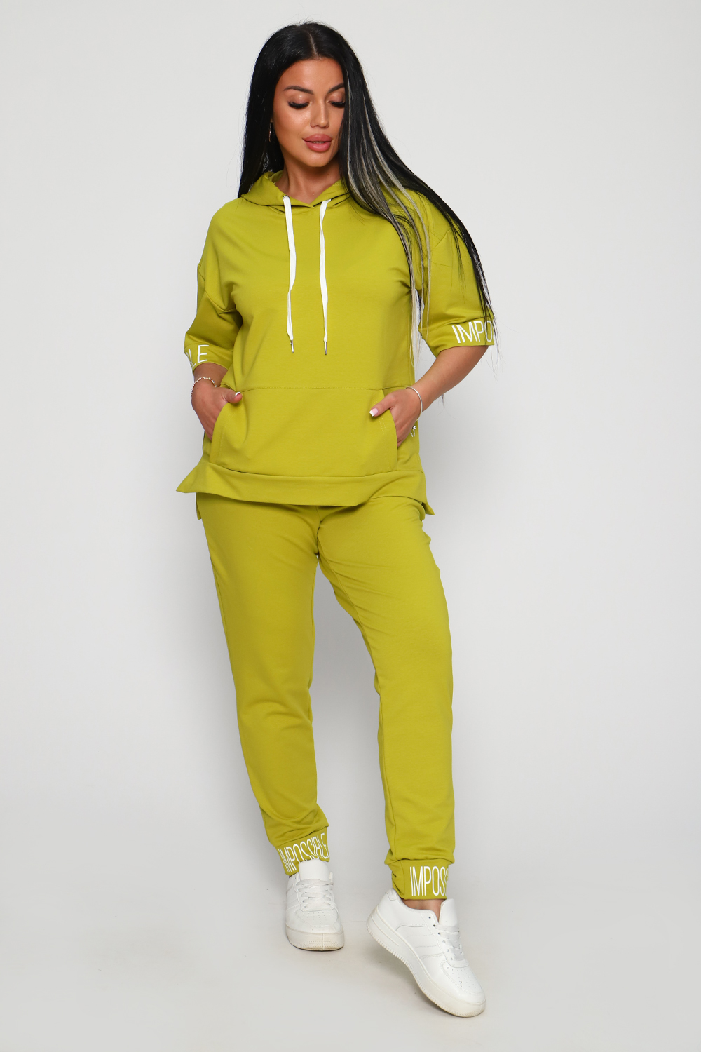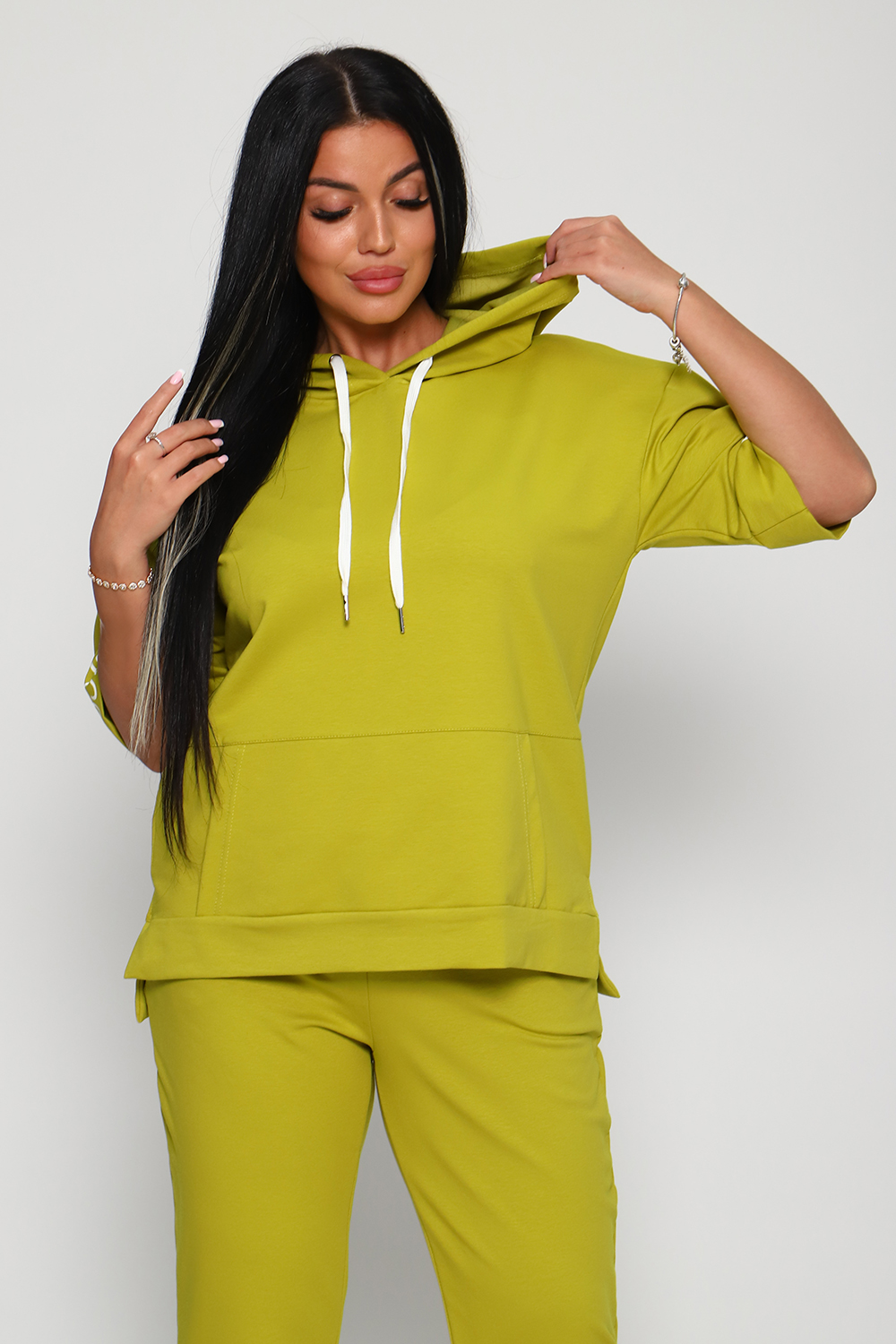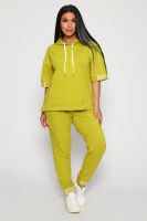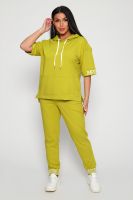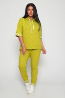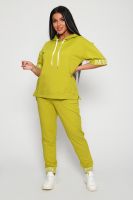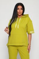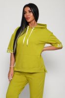 Костюм женский их футера 2?х нитки с лайкрой. Очень интересная модель, кофта удлинённая по бокам разрезы, рукава до локтя, на манжетах принт, карман кенгуру, брюки с карманами прямой посадки снизу на манжетах. На модели 48-50 размер.