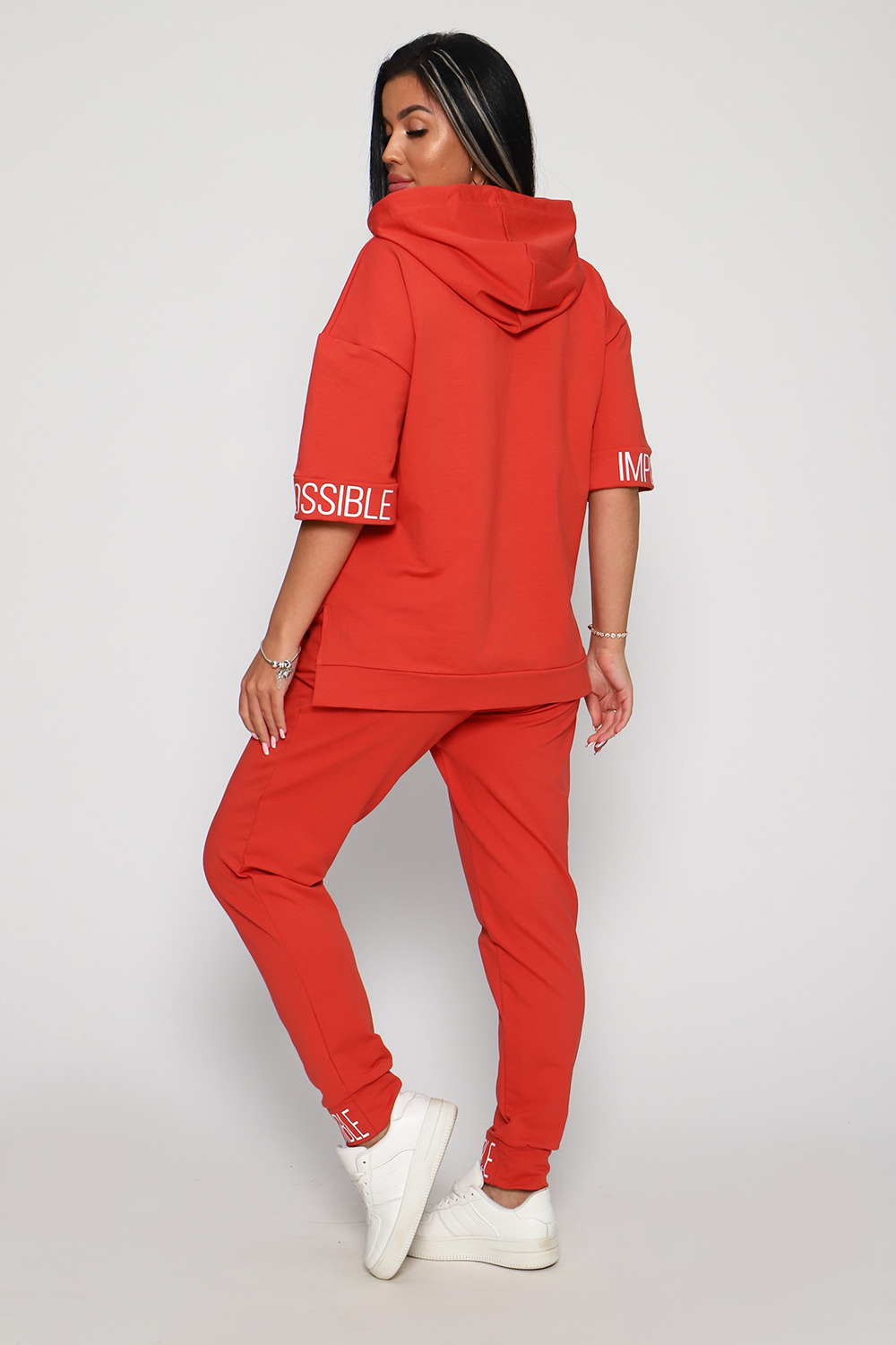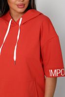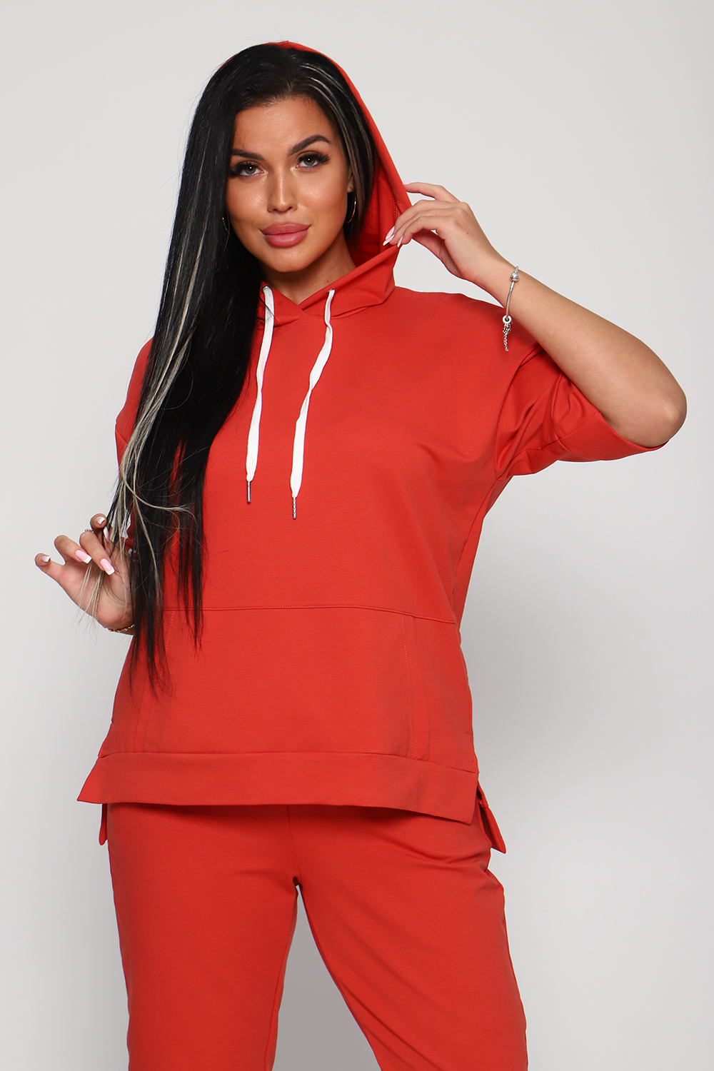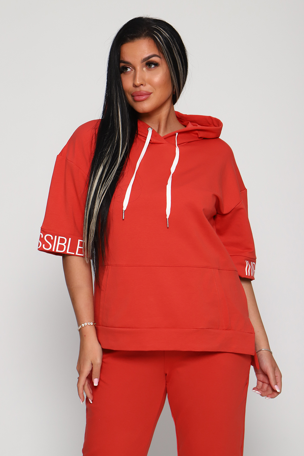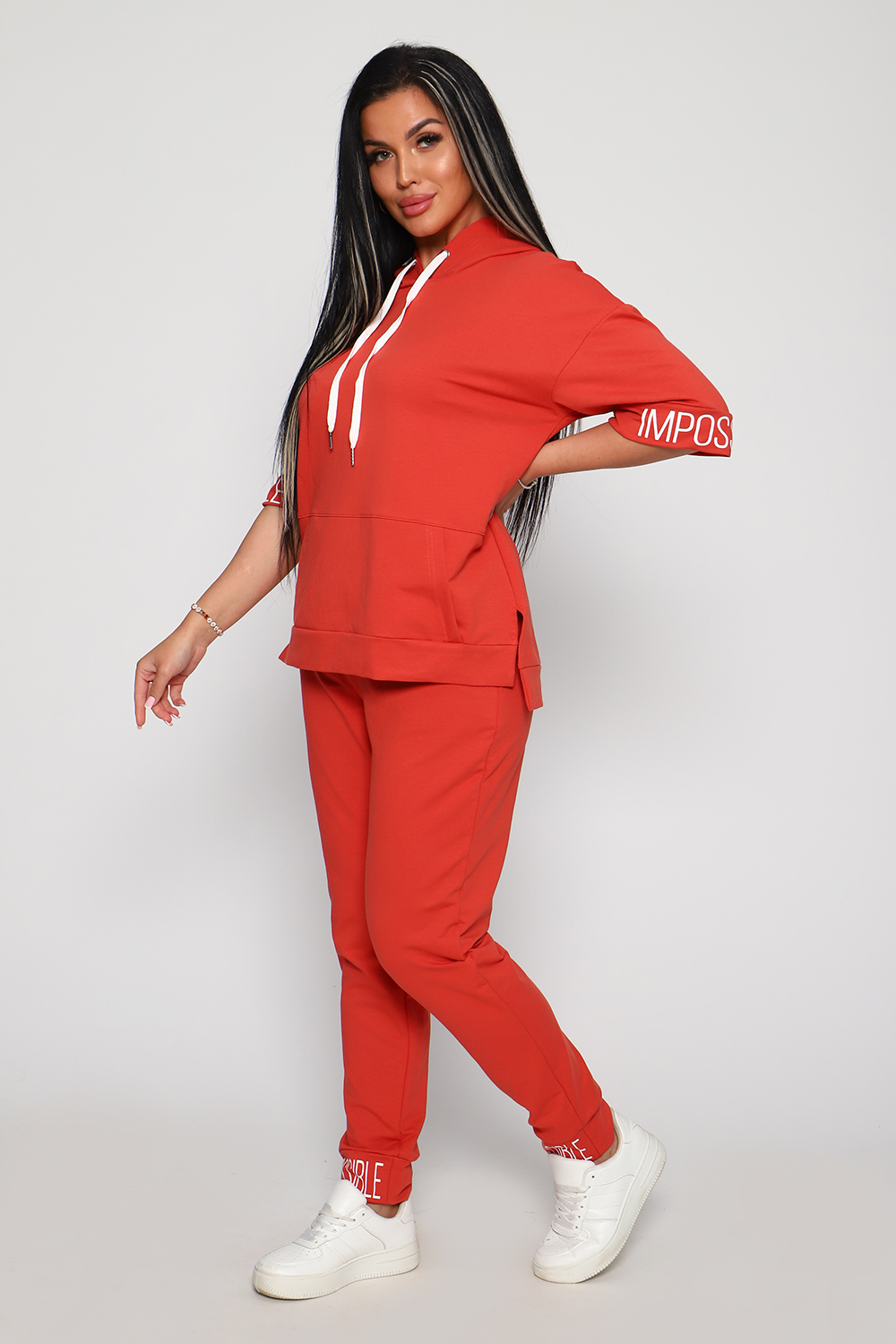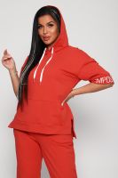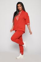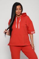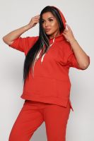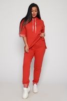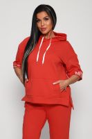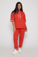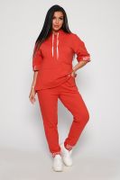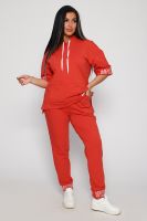 Костюм женский их футера 2?х нитки с лайкрой. Очень интересная модель, кофта удлинённая по бокам разрезы, рукава до локтя, на манжетах принт, карман кенгуру, брюки с карманами прямой посадки снизу на манжетах. На модели 48-50 размер.