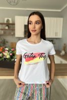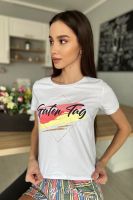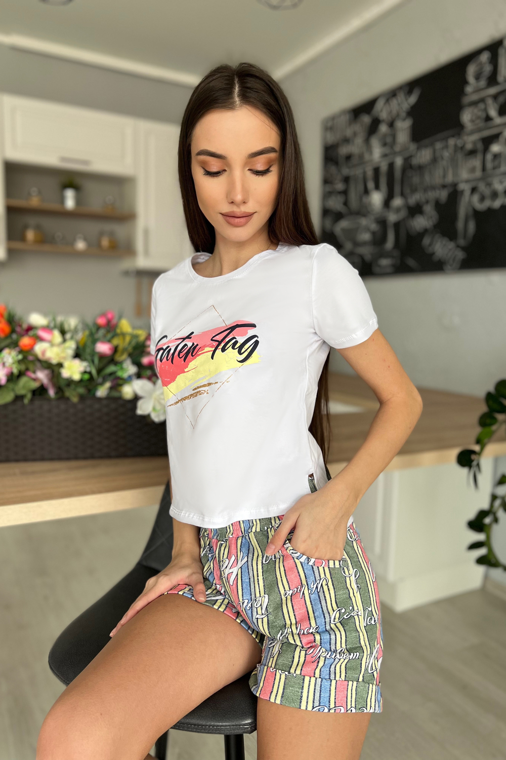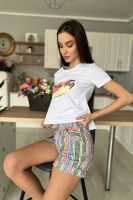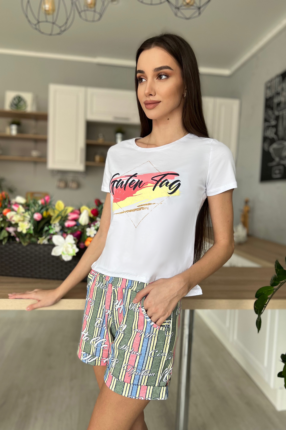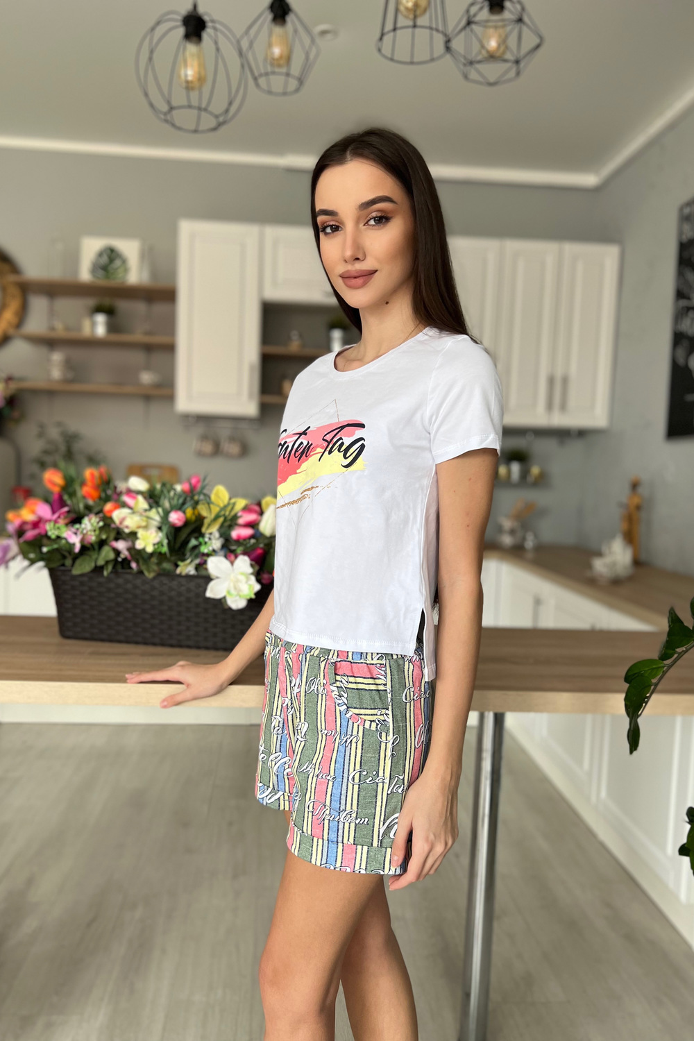 Костюм состоит из футболки и шорт. Футболка прямого силуэта, с удлиненной спинкой, с округлой горловиной. Рукав втачной, короткий. В нижней части боковых швов обработаны разрезы. Горловина обработана обтачкой из основного полотна. Шорты прямые, на поясе, с карманами, с манжетом по низу.