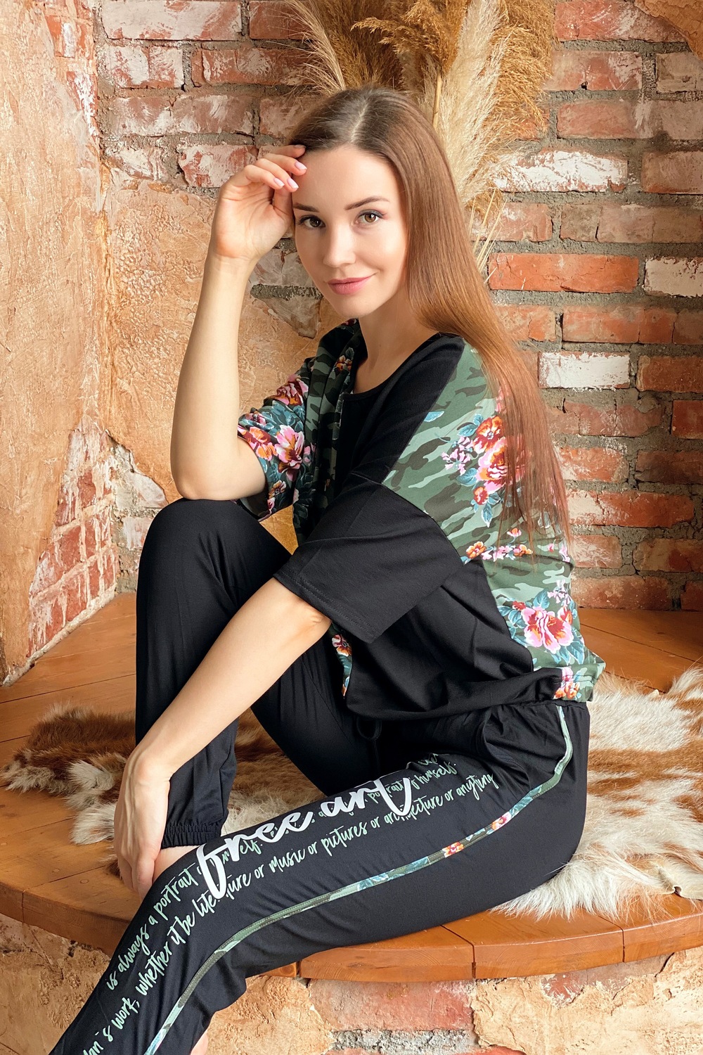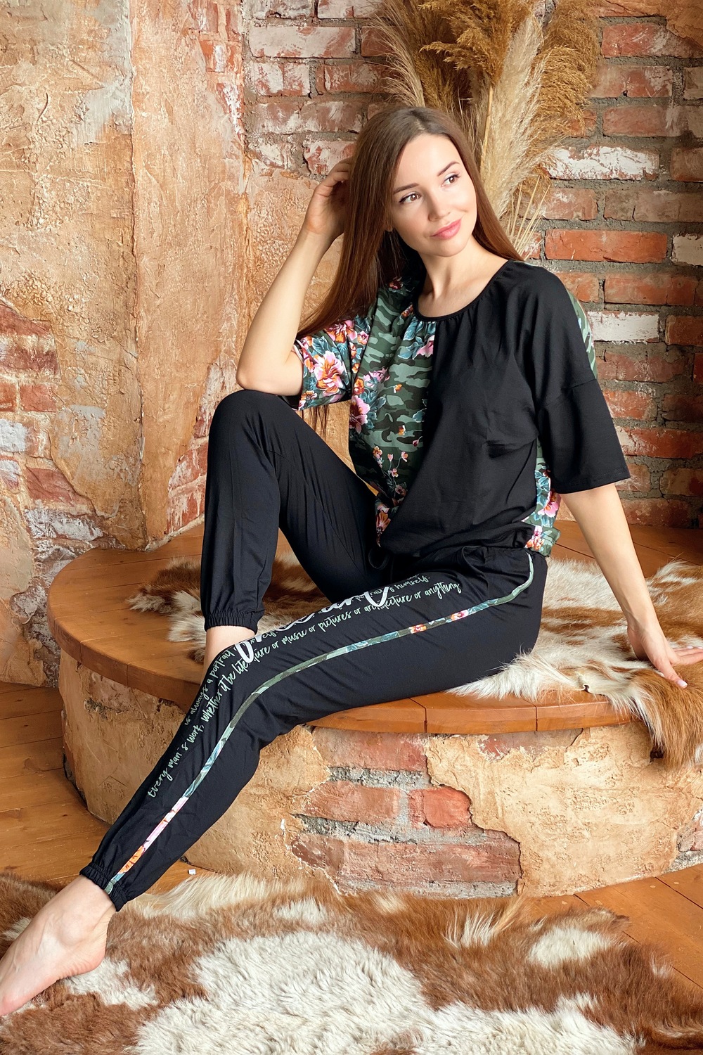 Костюм состоит из футболки и брюк. Футболка прямая, с округлой горловиной. Половина полочки выполнена из отделочного полотна. По низу обработана кулиса со шнуром-стяжкой. Шнур и горловина обработаны бейкой из отделочного полотна. Брюки выполнены из отделочного полотна. Брюки свободные, длинные, с карманами, на эластичном поясе, с резинкой по низу. Вдоль боковых швов расположен лампас из основного полотна.