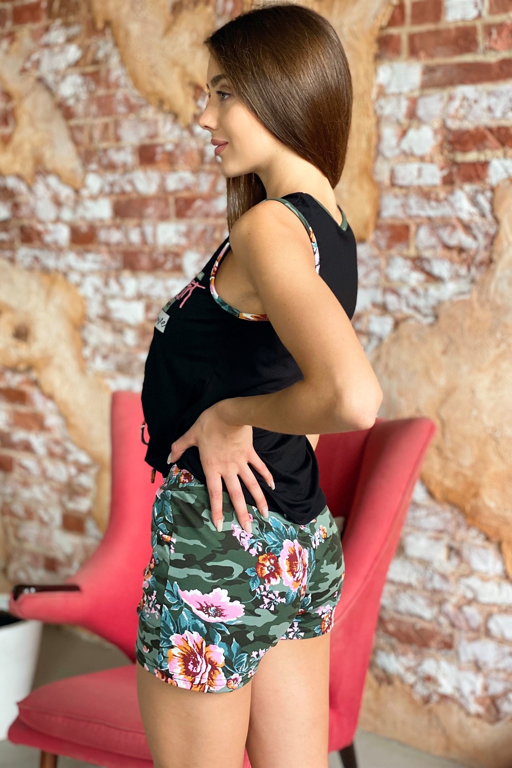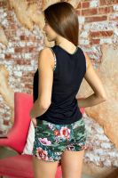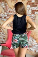 Комплект состоит из майки и шорт. Шорты полуприлегающие, короткие, с карманами, на поясе. Майка прилегающего силуэта, с округлой горловиной. Центр полочки собран на кулису со шнуром. Горловина, проймы и карманы на шортах обработаны бейкой из отделочного полотна.
