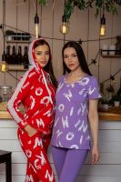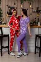 Комплект состоит из футболки и леггинсов. Леггинсы облегающие, на резинке. Футболка полуприлегающего силуэта, с V-образной горловиной, с удлиненной спинкой. В нижней части боковых швов обработаны разрезы. Рукав втачной, короткий, с фигурным разрезом. Горловина обработана бейкой из основного полотна.