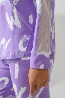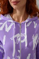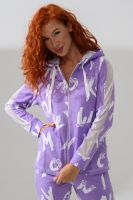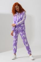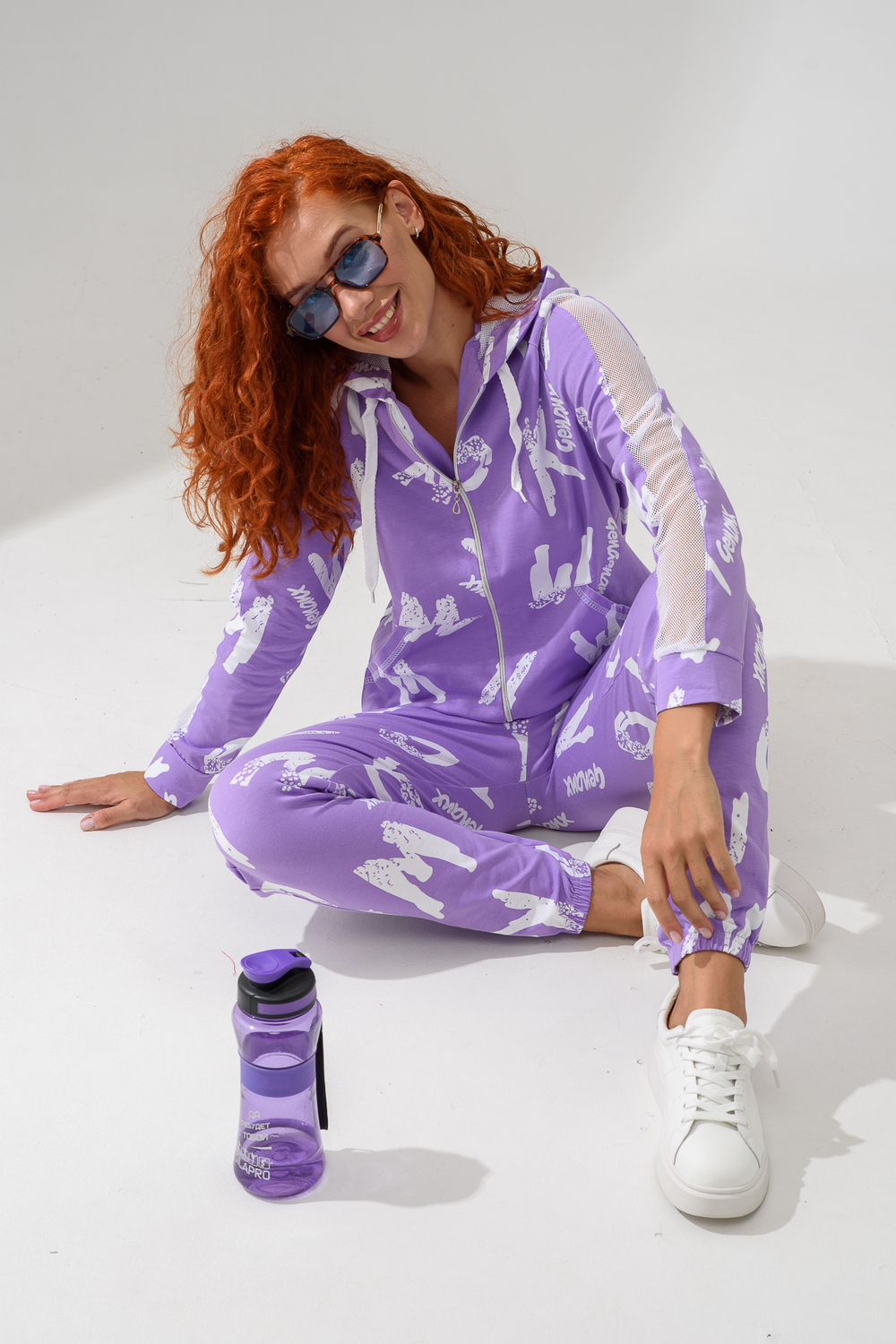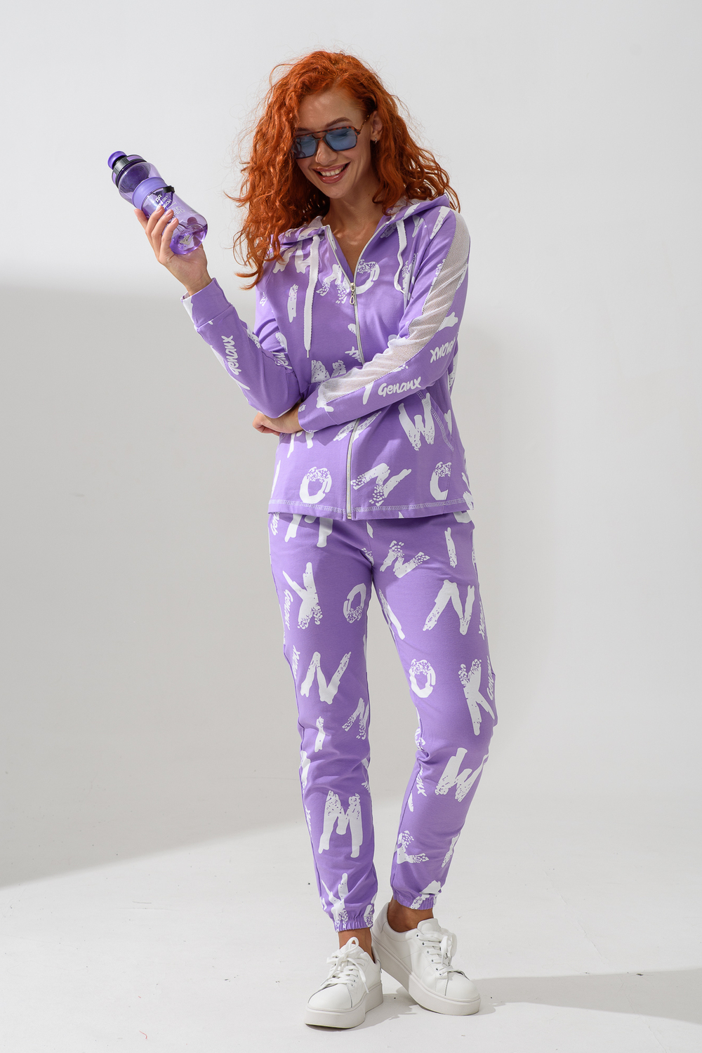 Костюм состоит из толстовки и брюк. Брюки на поясе, с боковыми карманами, на резинке по низу. Толстовка прямая, на молнии, с капюшоном из сетки, с карманами "кенгуру", длиной до середины бедра. Рукав реглан, длинный, с лампасами из сетки вдоль рукава, на манжете.