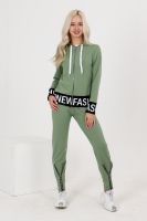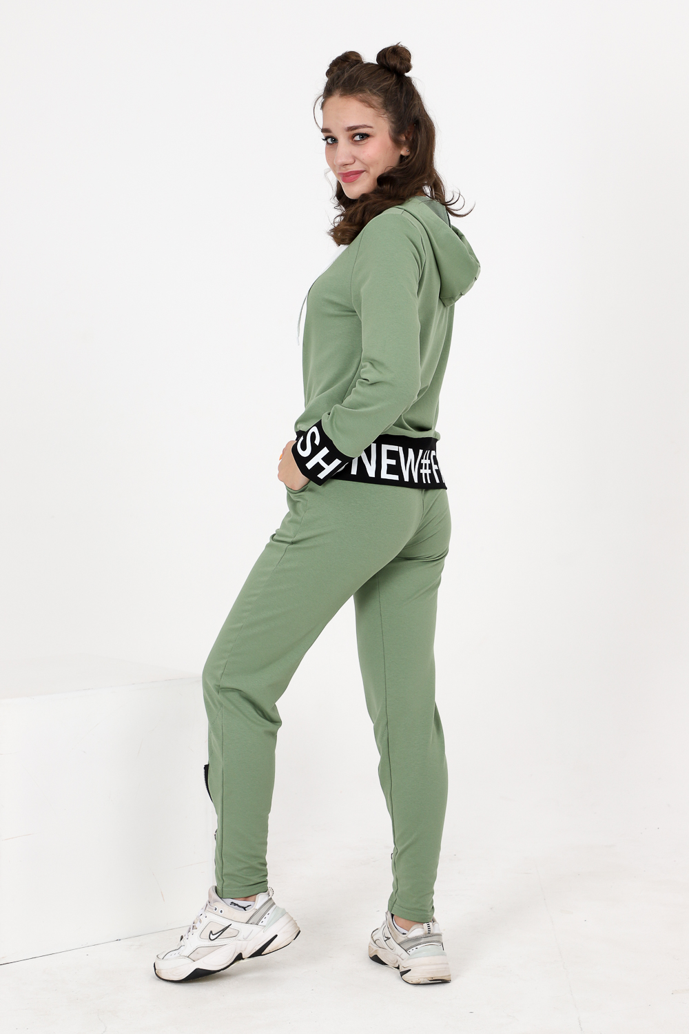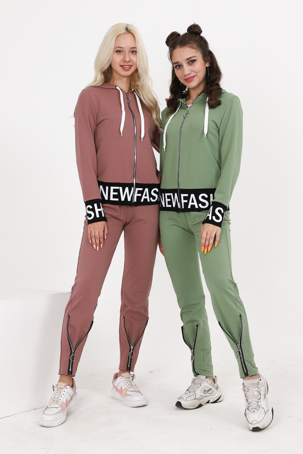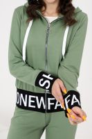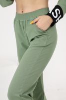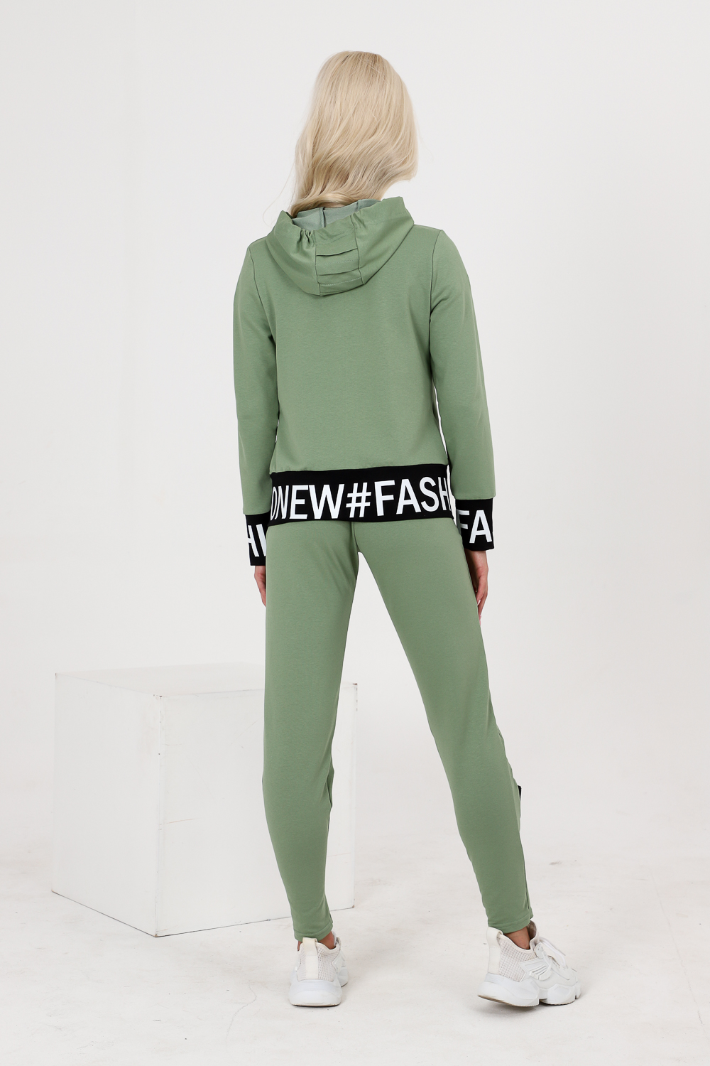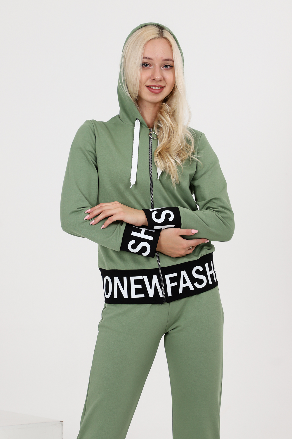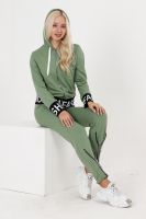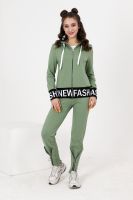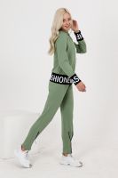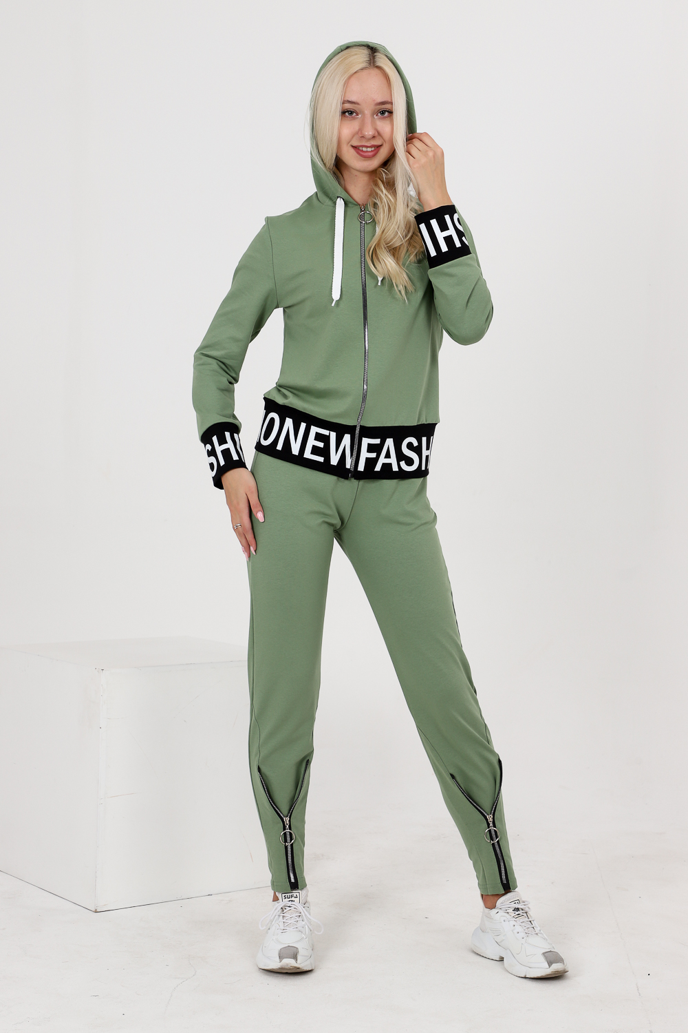 Костюм состоит из толстовки и брюк. Толстовка прямая, полуприталенная, с капюшоном, на молнии, на поясе. Рукав втачной, длинный, на манжете. Пояс куртки и манжеты рукавов выполнены из контрастного полотна с принтом. Брюки полуприлегающего силуэта, с боковыми карманами, на эластичном поясе. В нижней части передних половинок обработаны декоративные элементы с молниями.