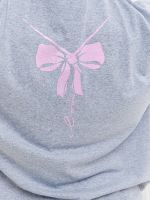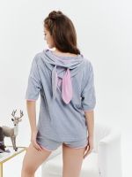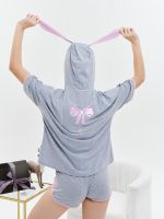 Костюм состоит из футболки и шорт. Футболка прямая, свободная, с ушками на капюшоне, с удлиненной спинкой. Рукав короткий. Шорты полуприлегающие, короткие, на поясе, с фигурным низом. Вдоль боковых швов расположены вставки из отделочного полотна. Лицевой край капюшона, низ рукавов и шорт обработаны бейкой из отделочного полотна.