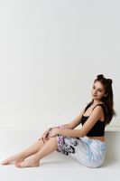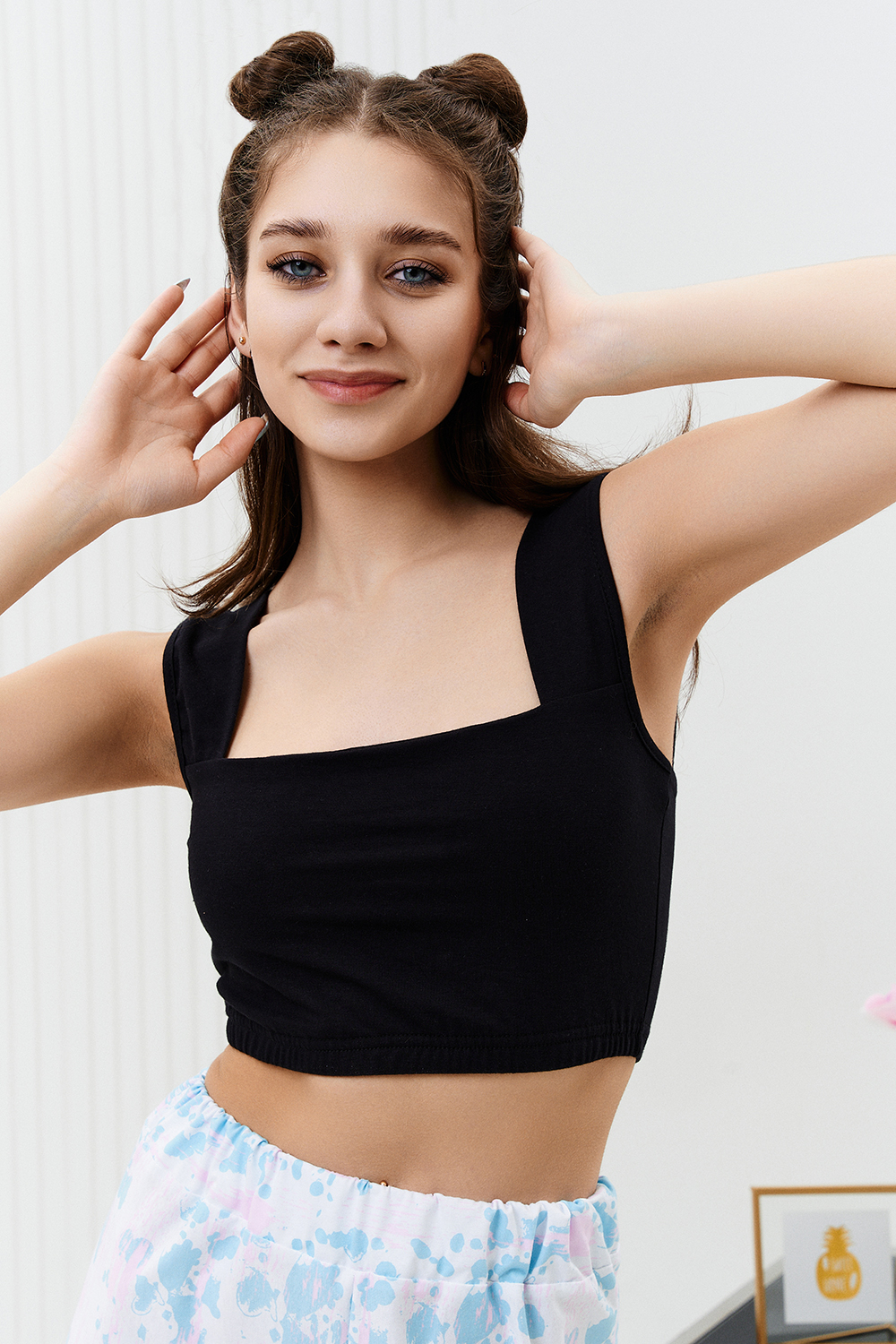 Комплект состоит из топа и укороченных брюк "кюлот". Топ из кулирки с лайкрой на широких бретелях, с квадратной горловиной, длиной выше линии талии. Верх спинки и низ топа собраны на резинке. Проймы обработаны бейкой из основного полотна. Брюки из кулирки прямые, свободные, укороченные, на поясе.