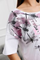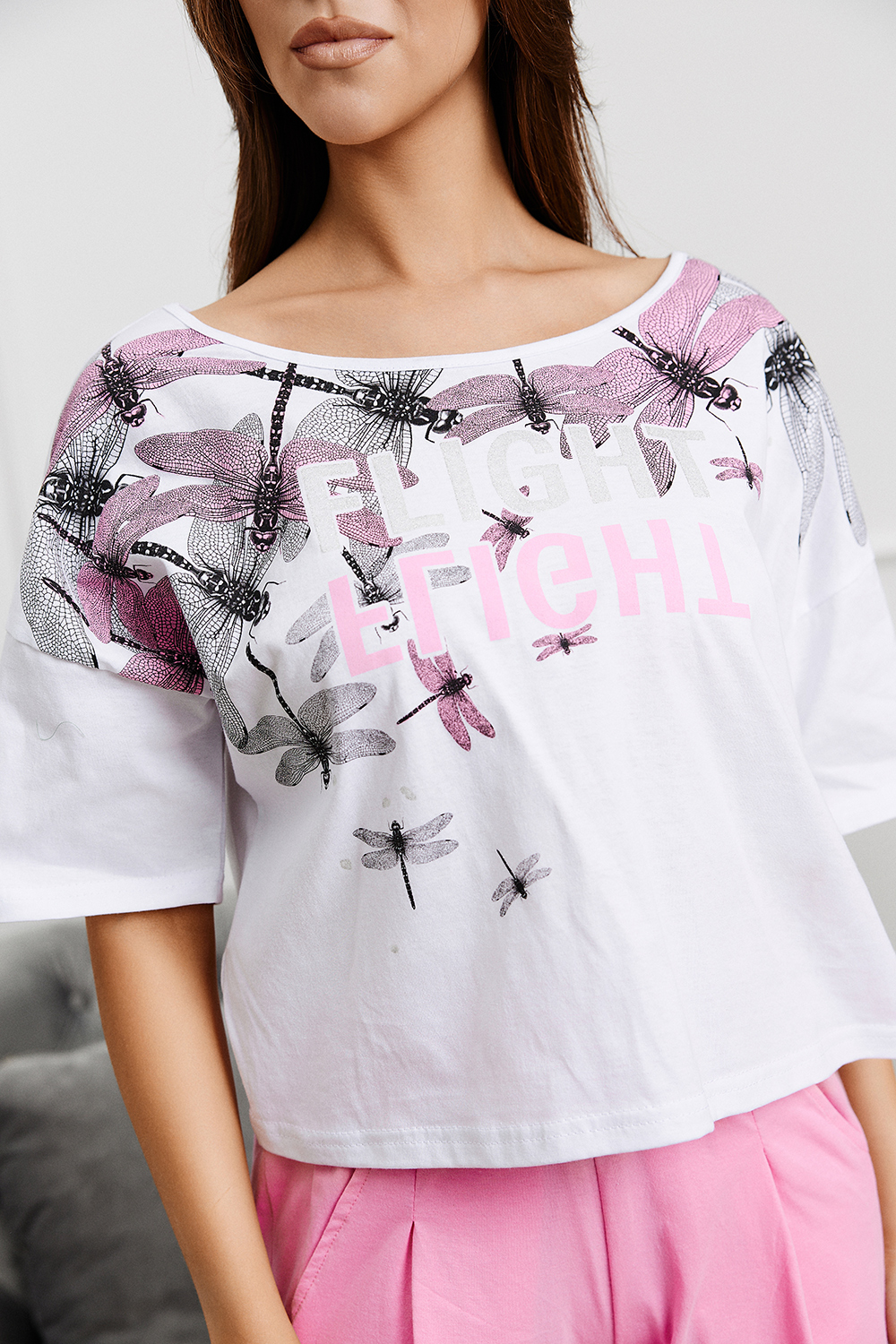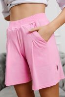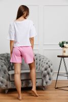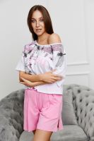 Костюм состоит из укороченной футболки "оверсайз" и шорт. Футболка с округлой горловиной. Рукав короткий. Горловина обработана бейкой из основного полотна. Шорты на поясе, с боковыми карманами и лампасами. В верхней части передних половинок по шву притачивания пояса расположены складки. В нижней части боковых швов обработаны разрезы.