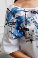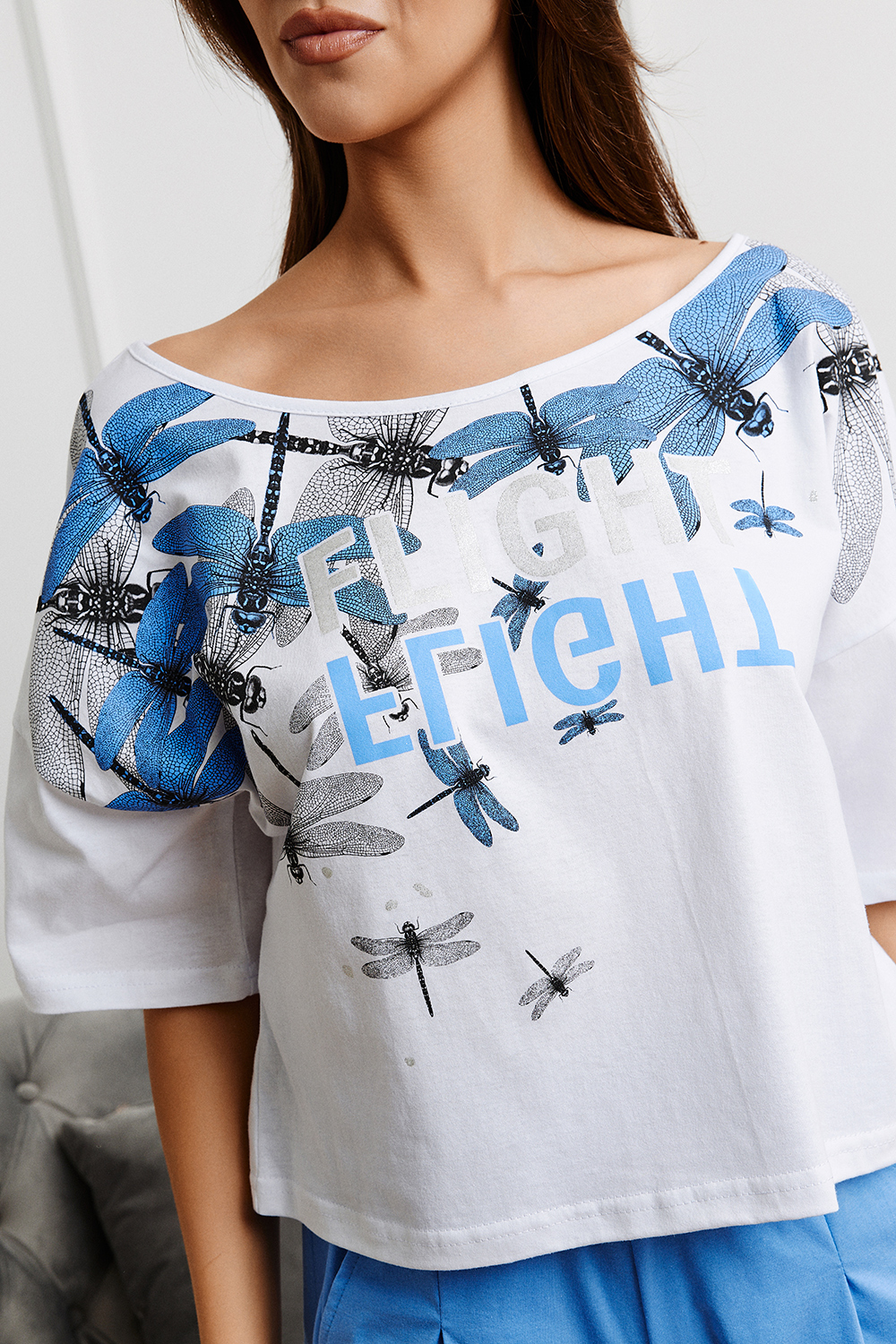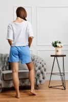 Костюм состоит из укороченной футболки "оверсайз" и шорт. Футболка с округлой горловиной. Рукав короткий. Горловина обработана бейкой из основного полотна. Шорты на поясе, с боковыми карманами и лампасами. В верхней части передних половинок по шву притачивания пояса расположены складки. В нижней части боковых швов обработаны разрезы.