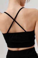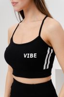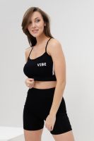 Комплект состоит из топа и шорт-велосипедок. Топ на тонких бретелях, с округлой горловиной на полочке. Вдоль боковых швов на полочке расположены отделочные лампасы. В верхней части спинки расположены перекрещенные бретели. Верх спинки собран на резинку. Горловина, проймы и бретели обработаны бейкой из основного полотна. Шорты облегающие, длинной выше колена, с завышенной линией талии, сверху на широком эластичном поясе.