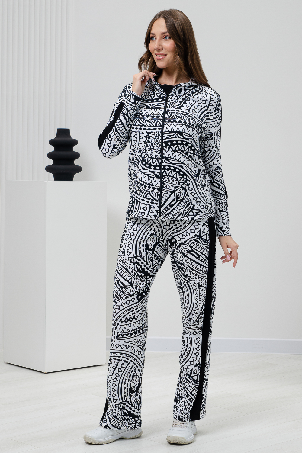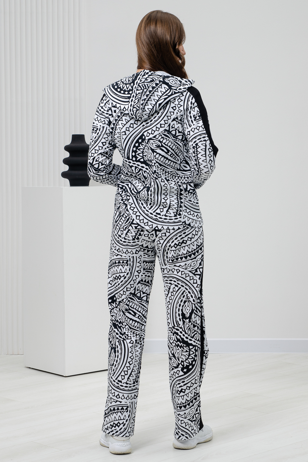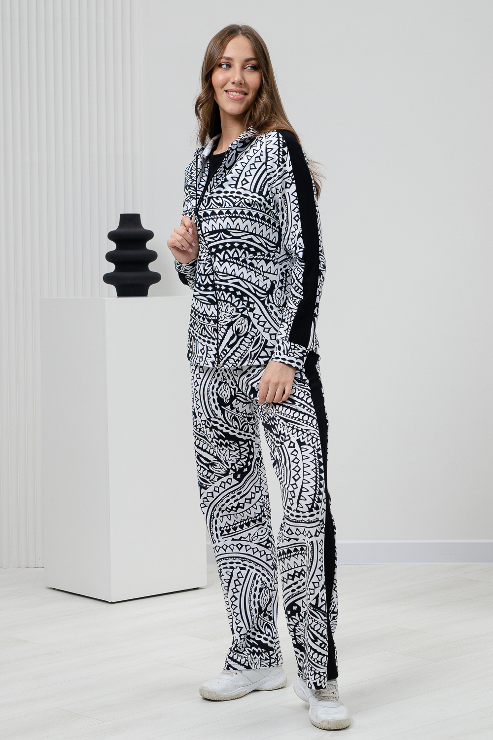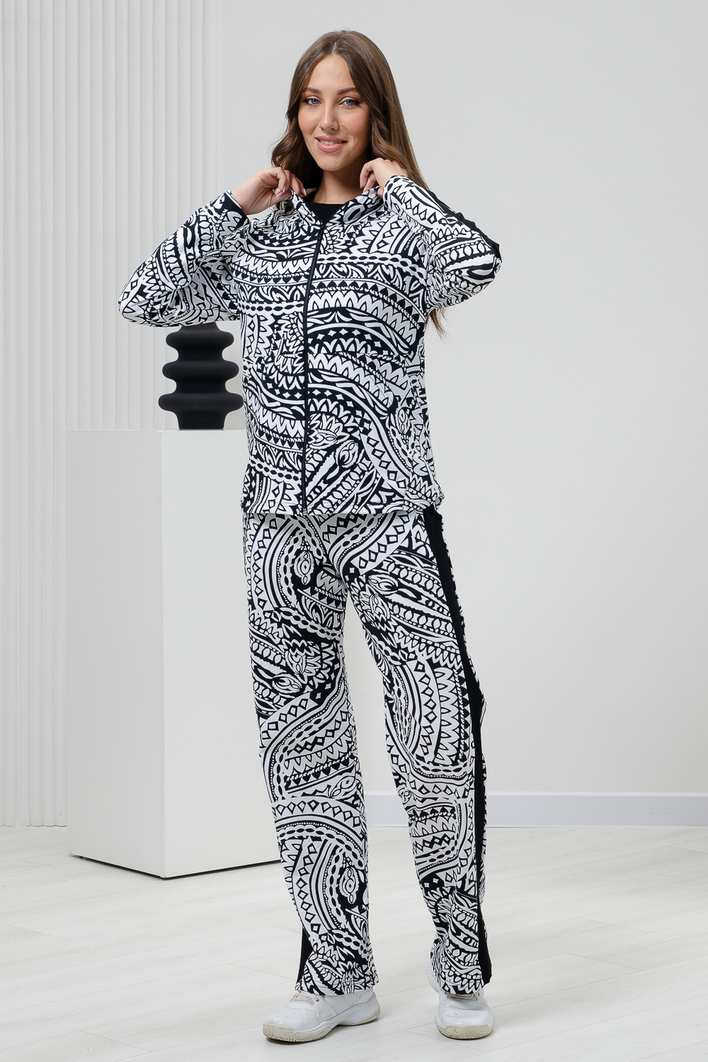 Костюм состоит из толстовки на молнии и брюк. Брюки прямые, на поясе, с боковыми карманами, с лампасами из отделочного полотна вдоль боковых швов. Толстовка прямая, на молнии, с капюшоном, с карманами "кенгуру", длиной до середины бедра. Рукав реглан, длинный, на манжете, с лампасами из отделочного полотна вдоль рукава.