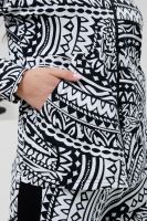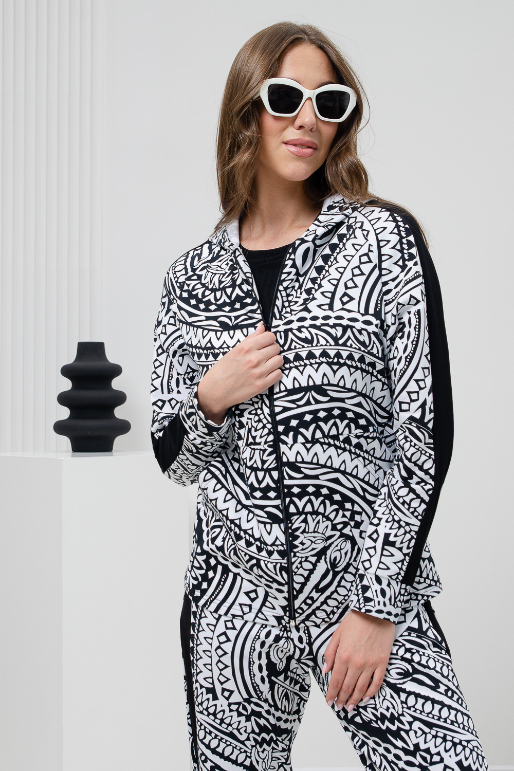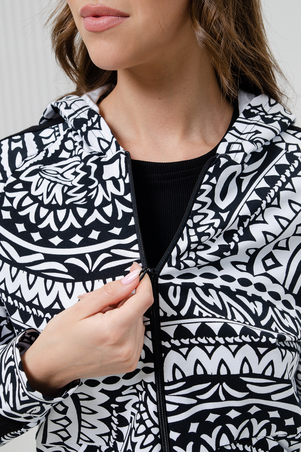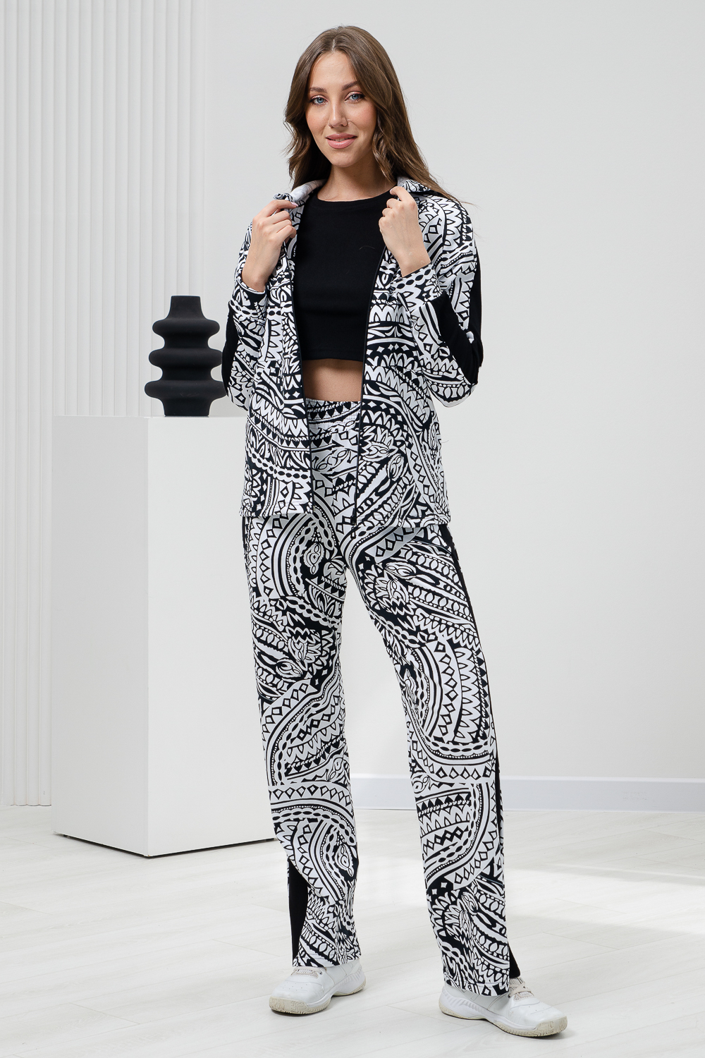 Костюм состоит из толстовки на молнии и брюк. Брюки прямые, на поясе, с боковыми карманами, с лампасами из отделочного полотна вдоль боковых швов. Толстовка прямая, на молнии, с капюшоном, с карманами "кенгуру", длиной до середины бедра. Рукав реглан, длинный, на манжете, с лампасами из отделочного полотна вдоль рукава.