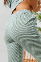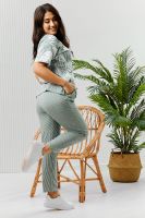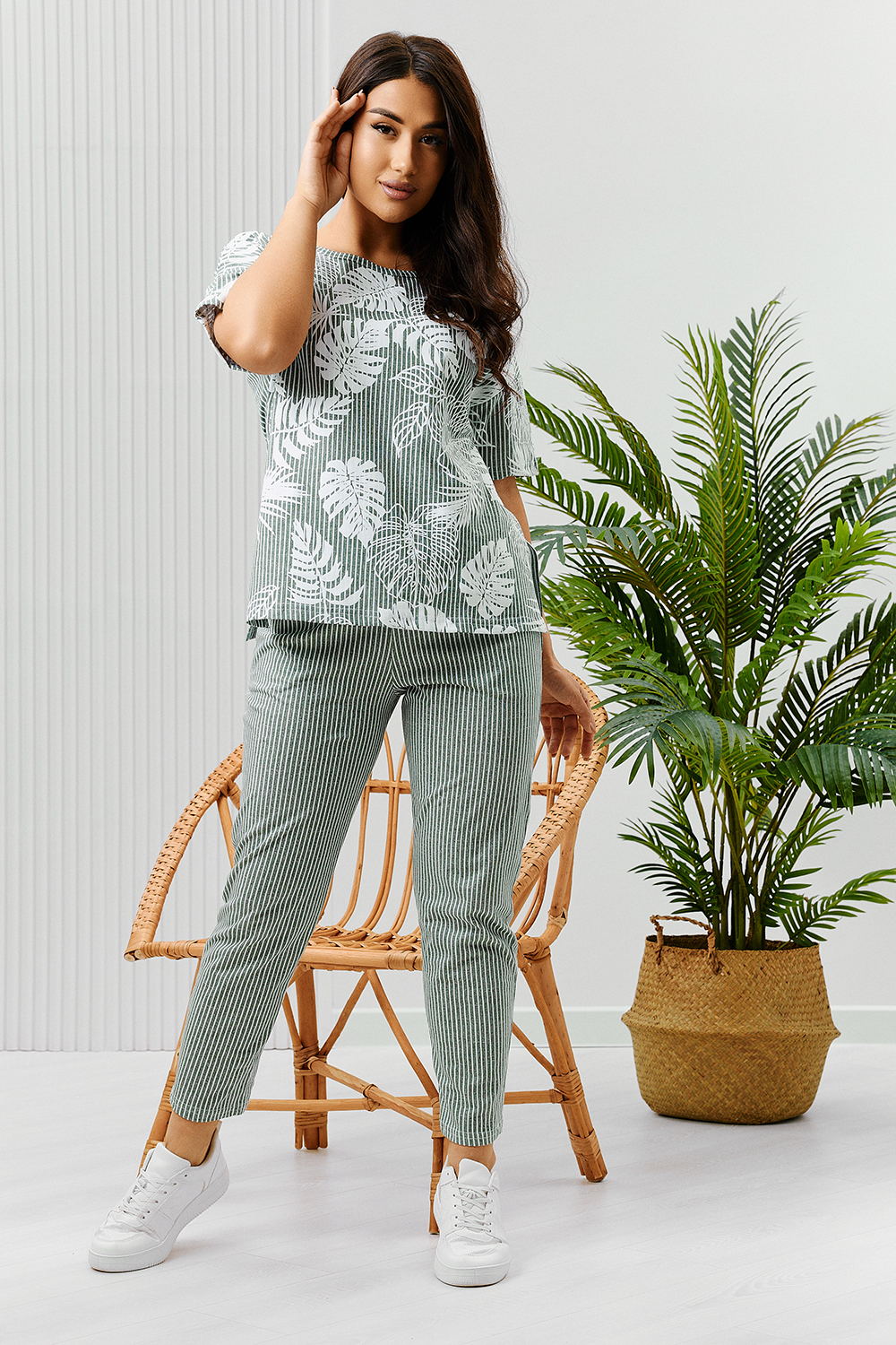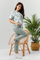 Костюм состоит из туники и брюк. Туника прямого силуэта, с округлой горловиной, длиной до середины бедра. Спинка с кокеткой. В нижней части боковых швов обработаны разрезы. Рукав короткий. Горловина обработана бейкой из основного полотна. Брюки на поясе, с боковыми карманами.