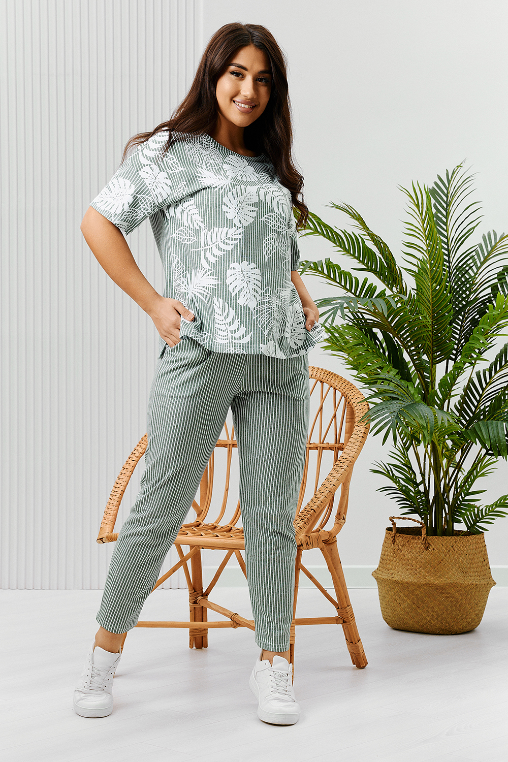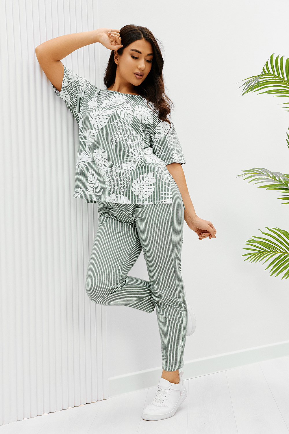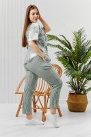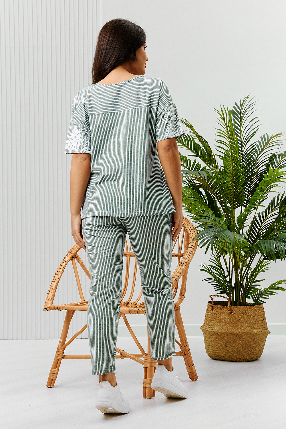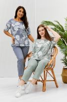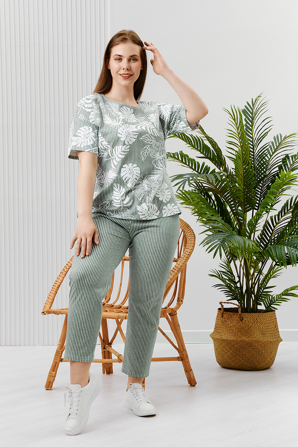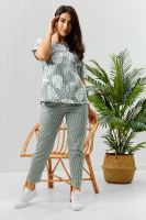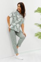 Костюм состоит из туники и брюк. Туника прямого силуэта, с округлой горловиной, длиной до середины бедра. Спинка с кокеткой. В нижней части боковых швов обработаны разрезы. Рукав короткий. Горловина обработана бейкой из основного полотна. Брюки на поясе, с боковыми карманами.