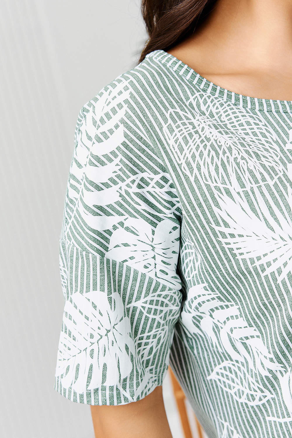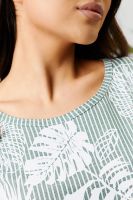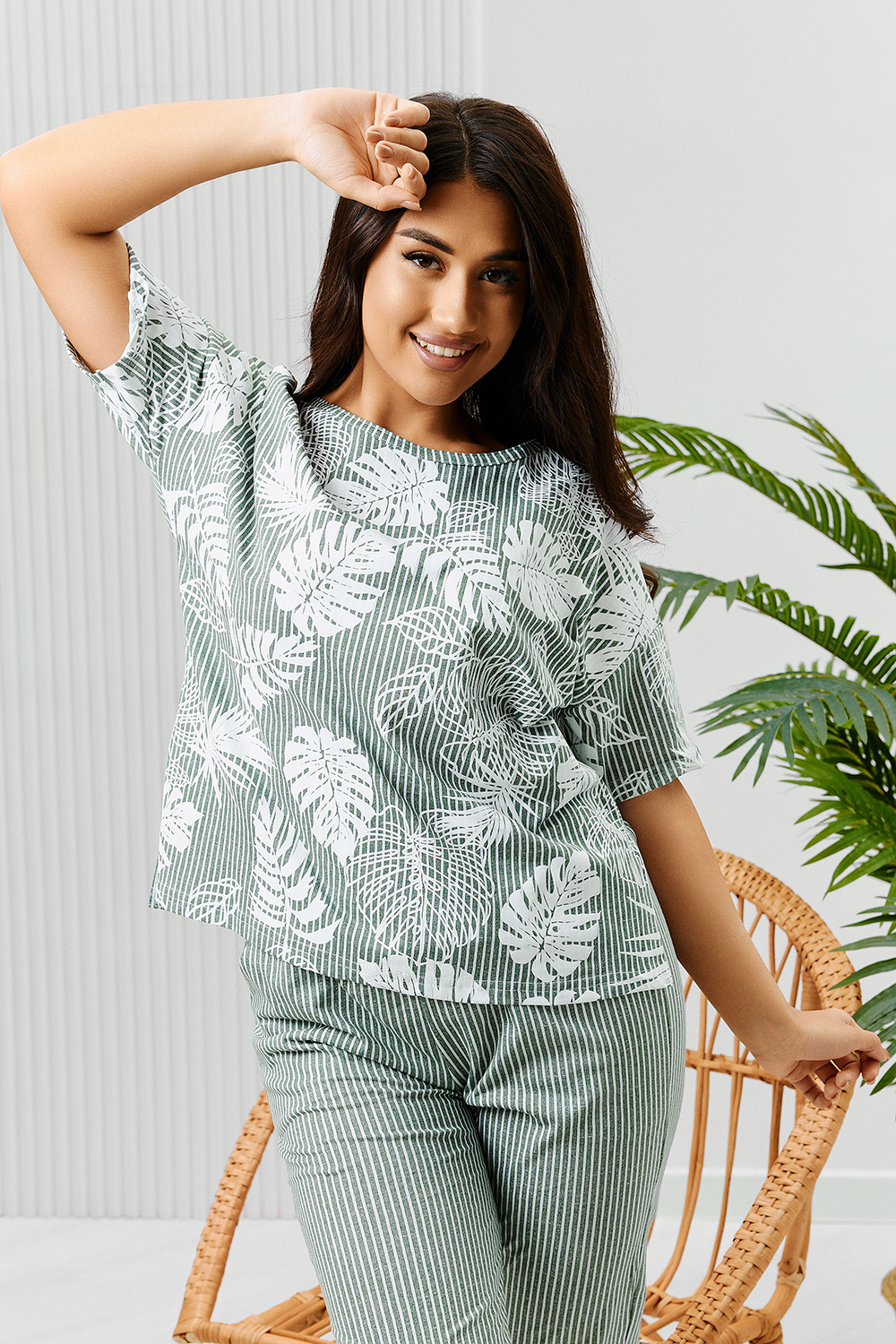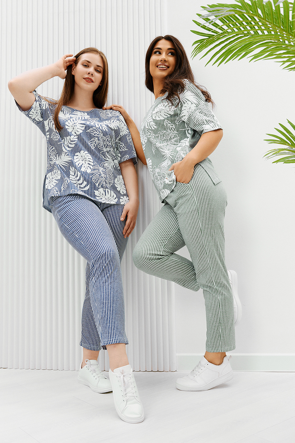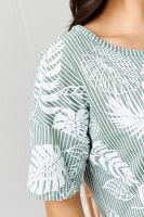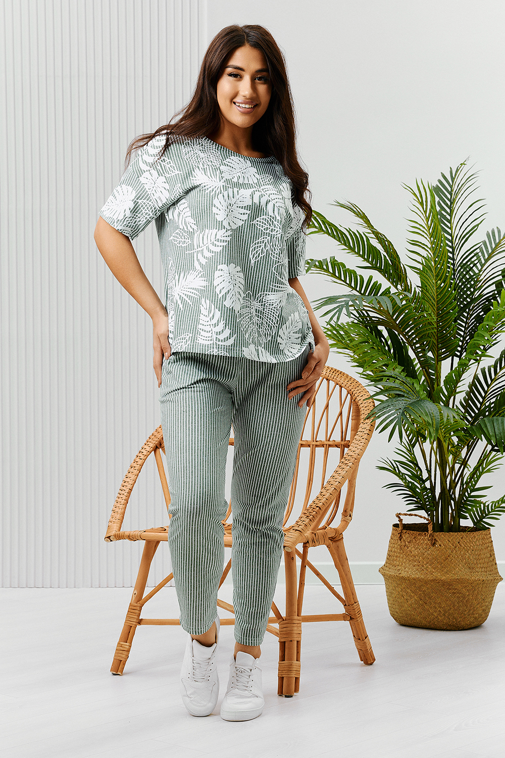 Костюм состоит из туники и брюк. Туника прямого силуэта, с округлой горловиной, длиной до середины бедра. Спинка с кокеткой. В нижней части боковых швов обработаны разрезы. Рукав короткий. Горловина обработана бейкой из основного полотна. Брюки на поясе, с боковыми карманами.