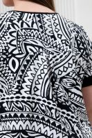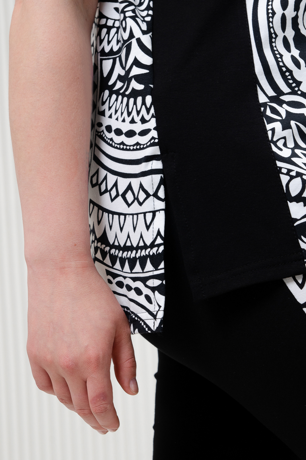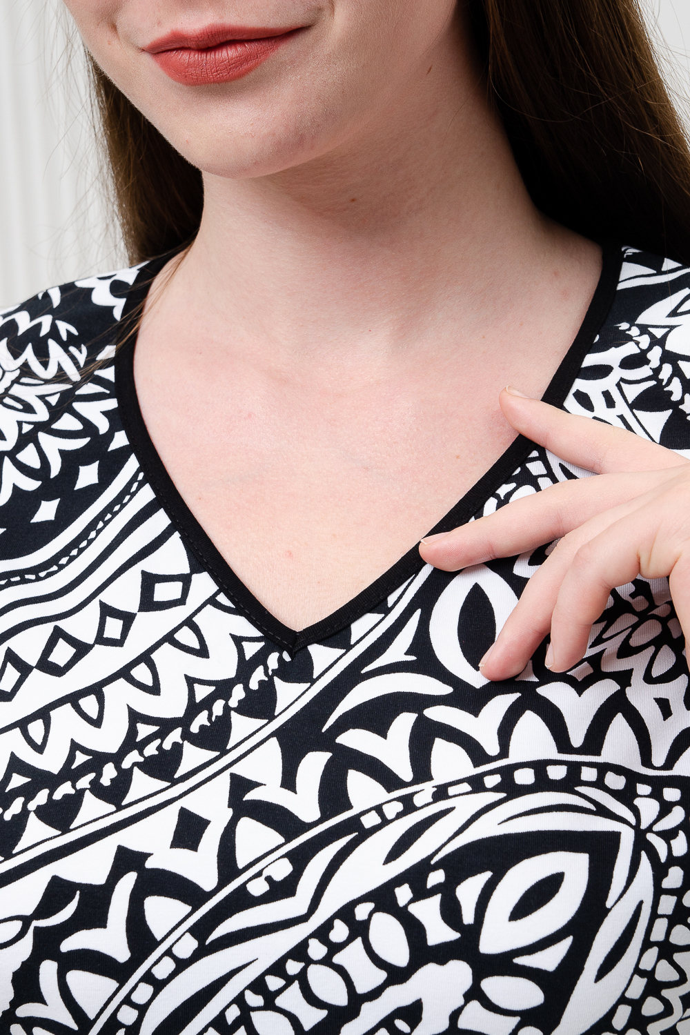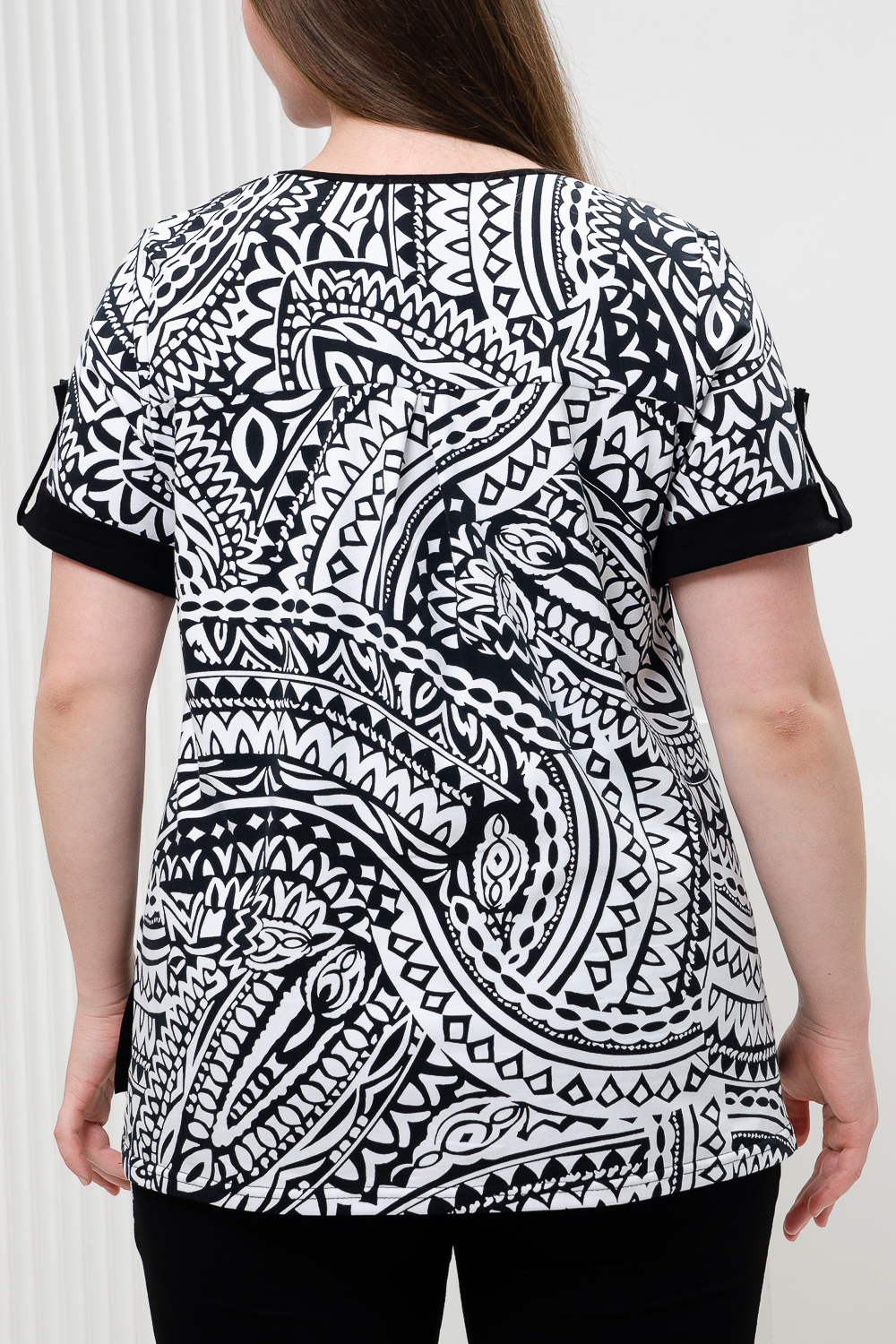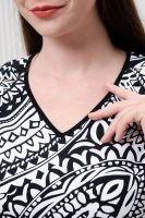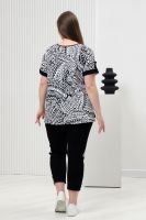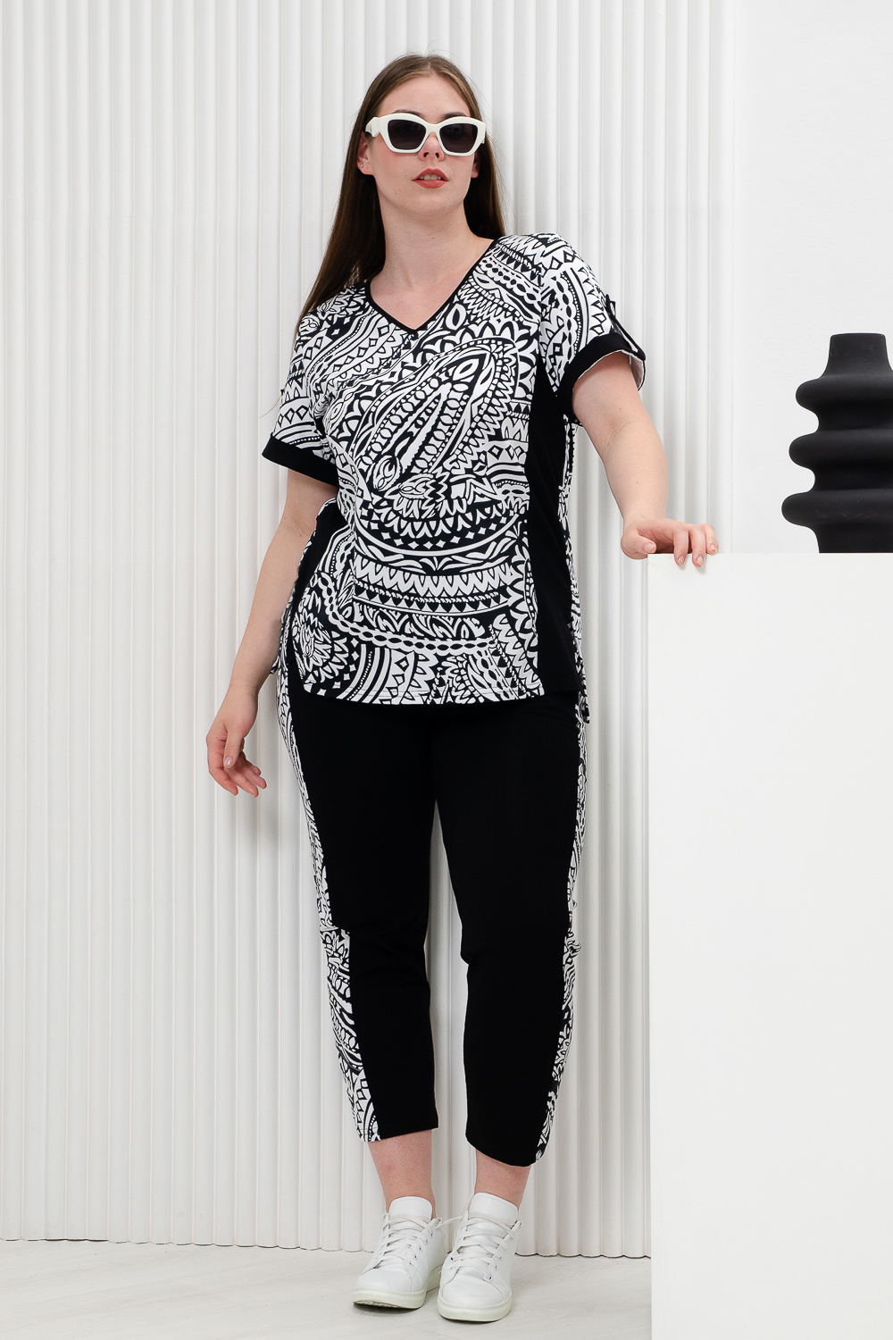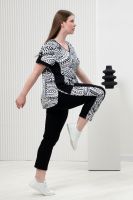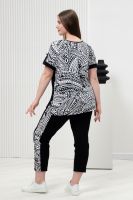 Костюм состоит из туники и брюк. Туника прямого силуэта, с V-образной горловиной, с боковыми вставками из отделочного полотна, с разрезами в нижней части боковых швов. Спинка с кокеткой, удлиненная. Рукав втачной, короткий, с манжетом и хлястом с пуговицей. Горловина обработана бейкой из отделочного полотна. Брюки на поясе, с боковыми карманами, с лампасами из отделочного полотна вдоль боковых швов.