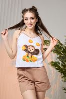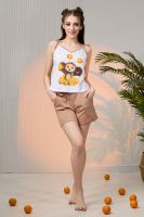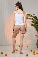 Комплект состоит из майки и шорт. Майка на тонких бретелях, с V-образной горловиной на полочке. Горловина и бретели обработаны бейкой из отделочного полотна. Шорты прямые, с карманами, на поясе.