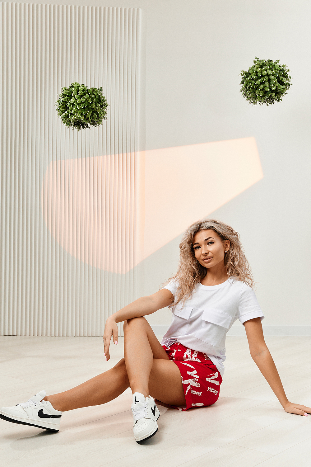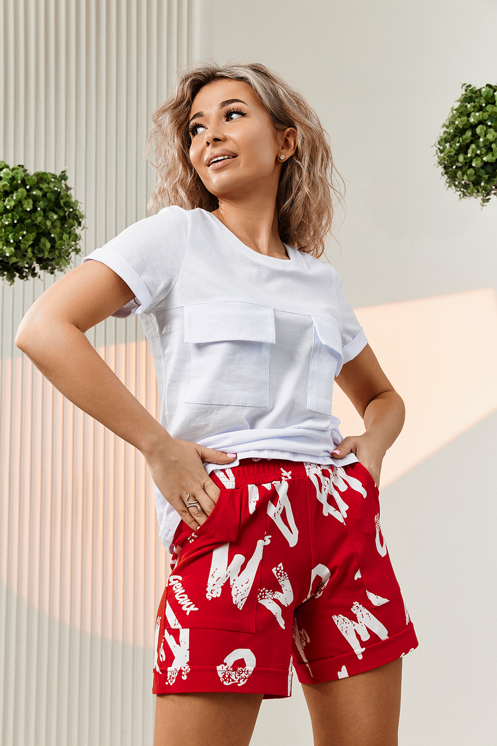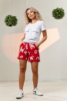Футболка прямого силуэта, с округлой горловиной, длиной до середины бедра. Рукав втачной, короткий, с отворотом. На полочке расположены накладные карманы с клапаном. Горловина обработана обтачкой из эластичного полотна. Шорты прямые, свободные, на поясе, с боковыми накладными карманами, с манжетами.