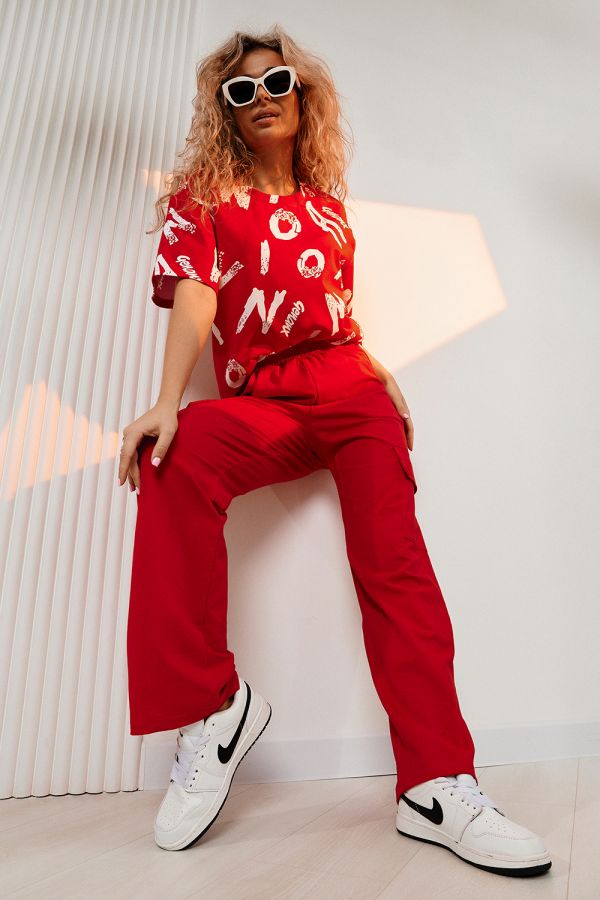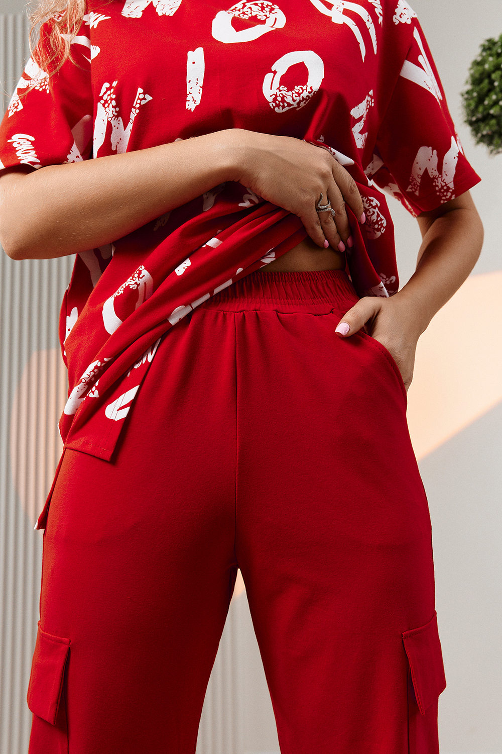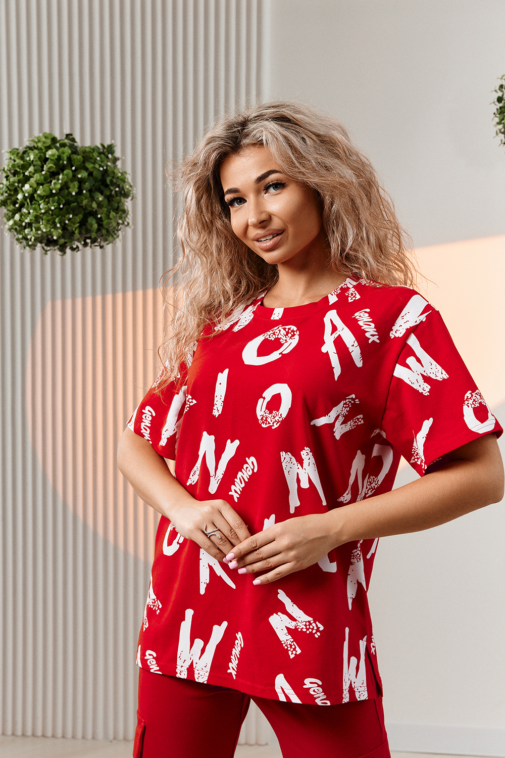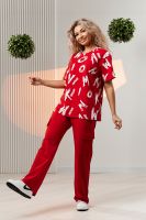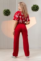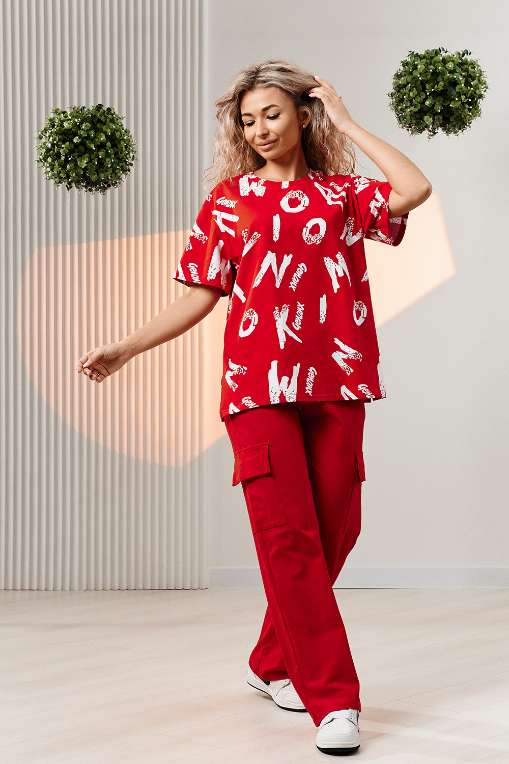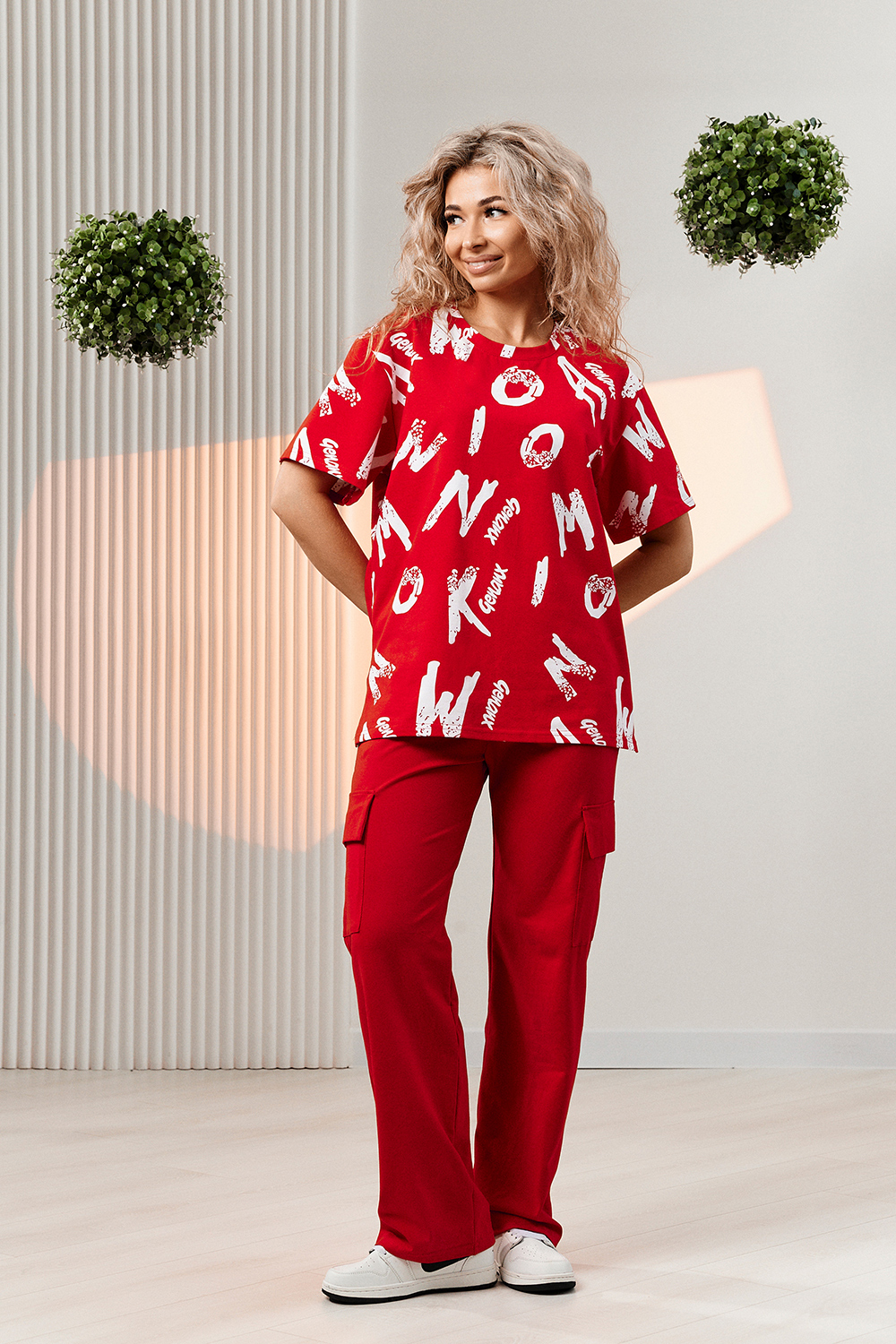 Костюм состоит из футболки и брюк. Футболка прямая, свободная, с округлой горловиной. В нижней части боковых швов футболки обработаны разрезы. Рукав короткий. Горловина обработана обтачкой из основного полотна. Брюки прямые, на поясе, с боковыми карманами, с накладными карманами и клапанами по боковым швам.