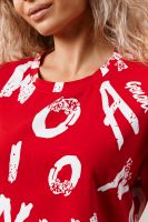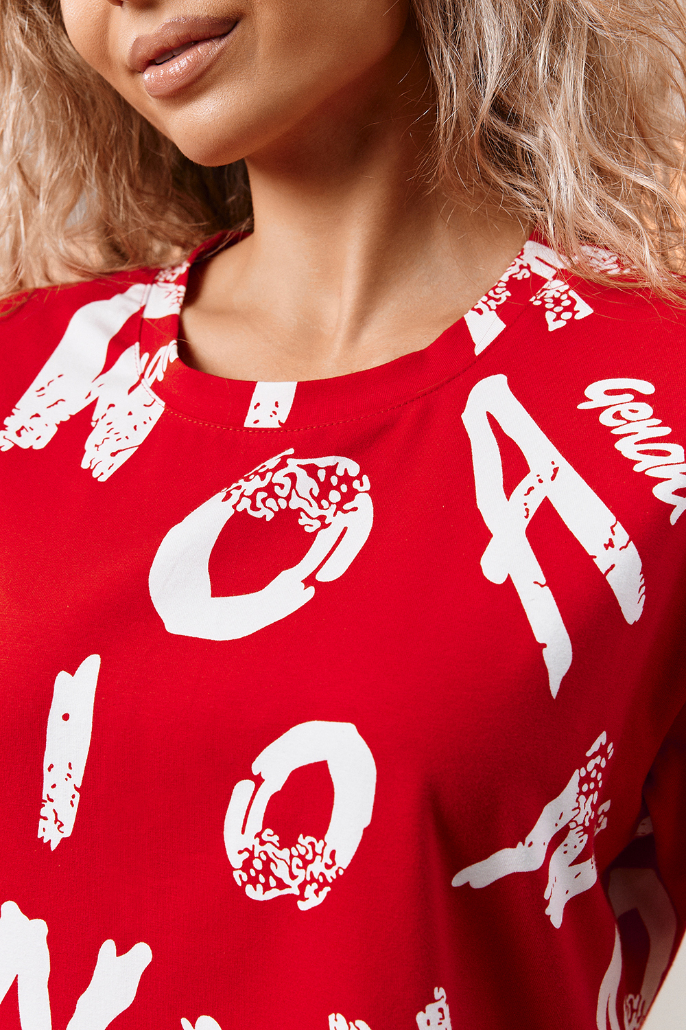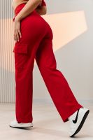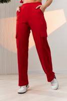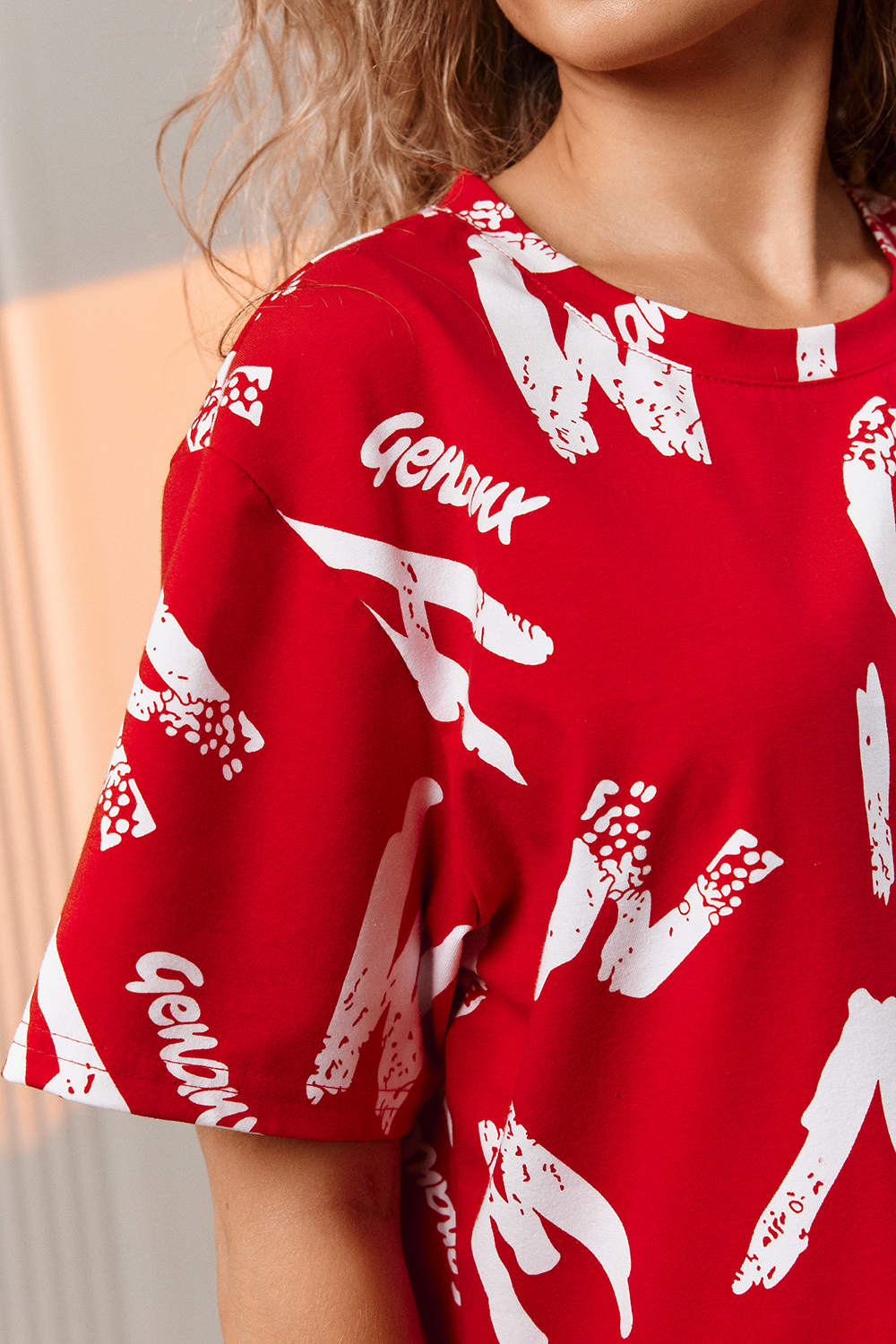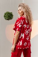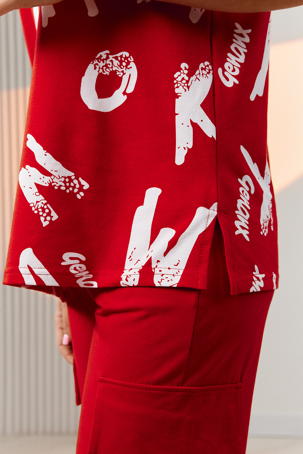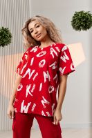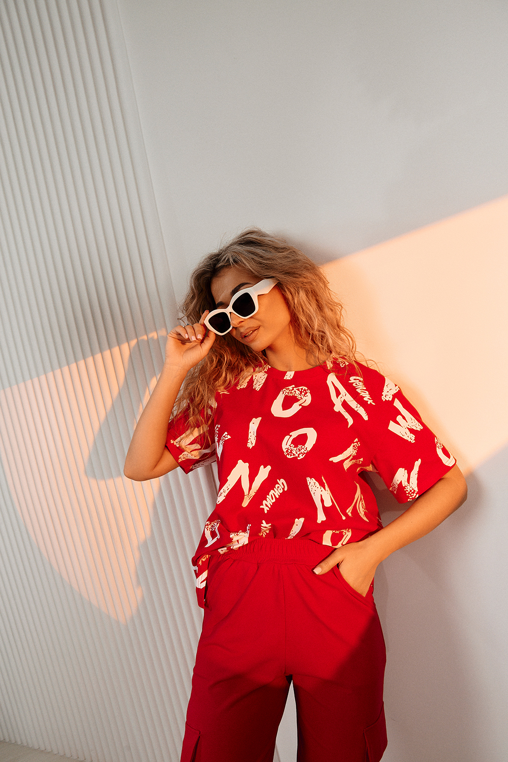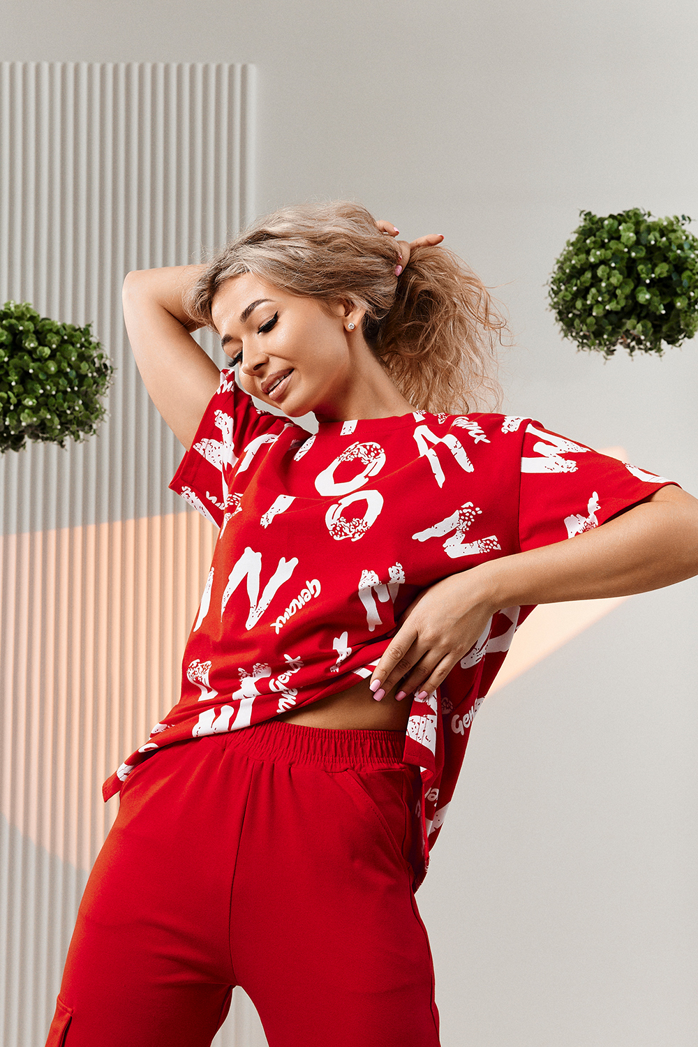 Костюм состоит из футболки и брюк. Футболка прямая, свободная, с округлой горловиной. В нижней части боковых швов футболки обработаны разрезы. Рукав короткий. Горловина обработана обтачкой из основного полотна. Брюки прямые, на поясе, с боковыми карманами, с накладными карманами и клапанами по боковым швам.