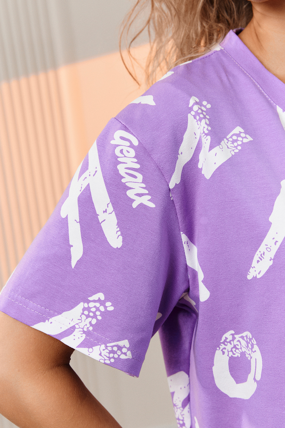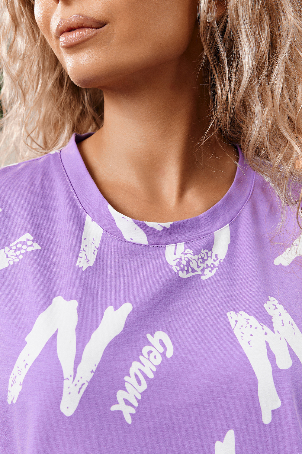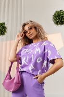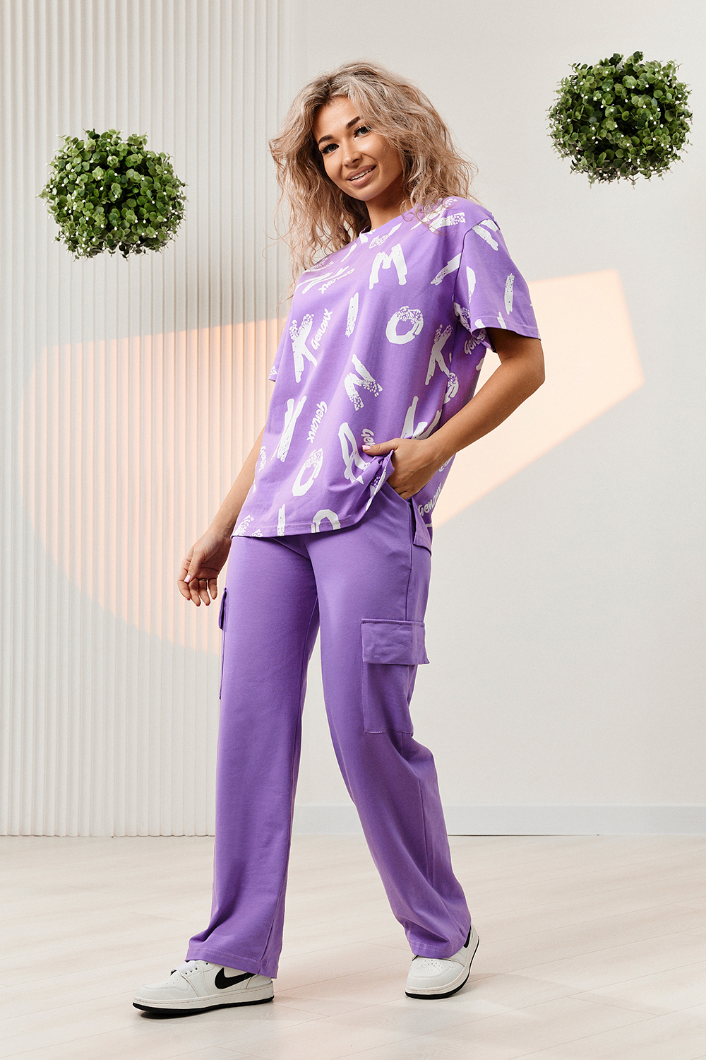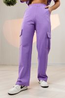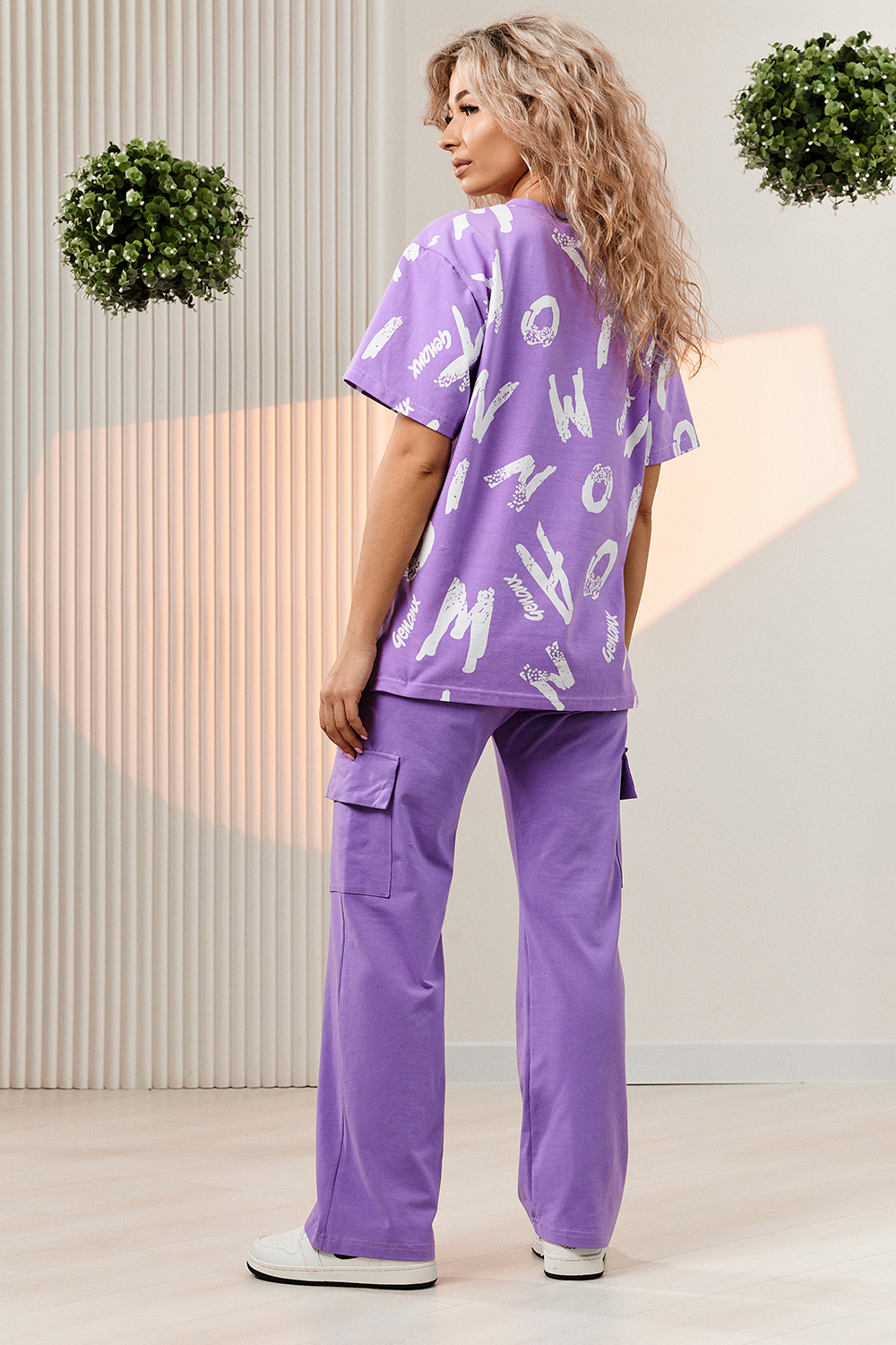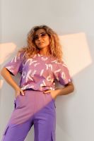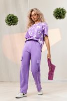 Костюм состоит из футболки и брюк. Футболка прямая, свободная, с округлой горловиной. В нижней части боковых швов футболки обработаны разрезы. Рукав короткий. Горловина обработана обтачкой из основного полотна. Брюки прямые, на поясе, с боковыми карманами, с накладными карманами и клапанами по боковым швам.
