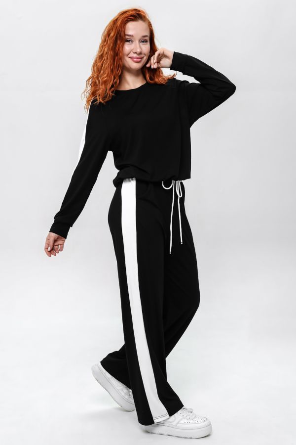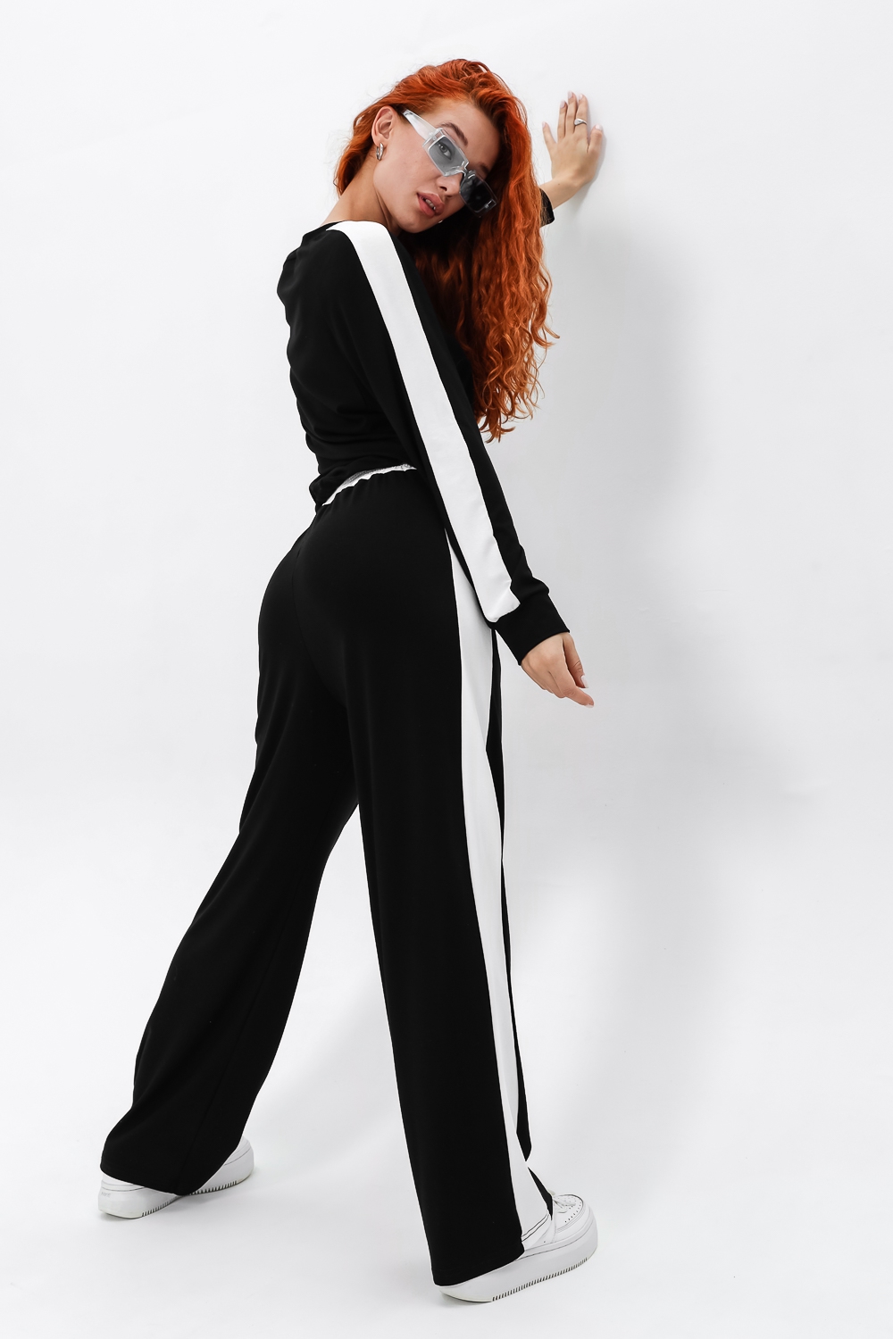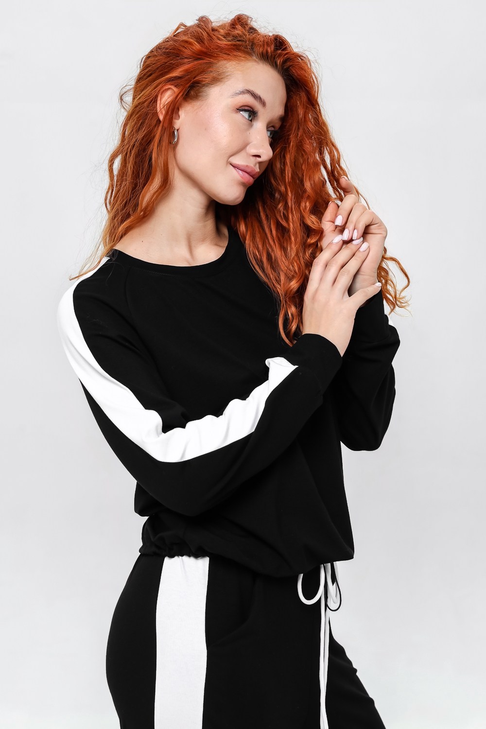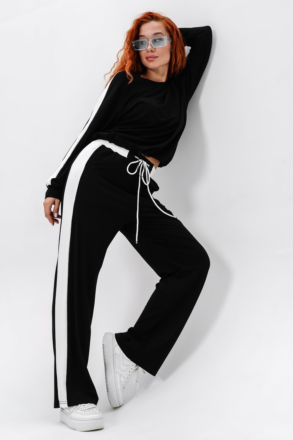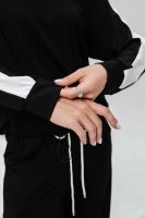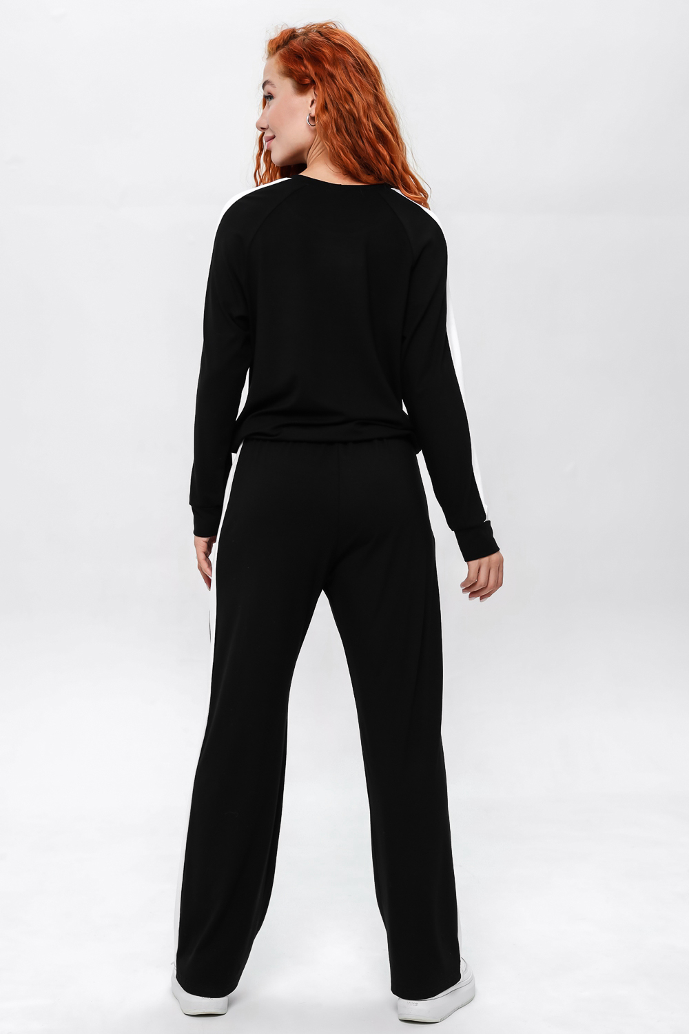 Костюм состоит из туники и брюк. Туника прямая, с округлой горловиной, с резинкой по низу. Рукав реглан, длинный, с лампасом из отделочного полотна вдоль рукава, на манжете. Горловина обработана обтачкой из основного полотна. Брюки прямые, на поясе, с боковыми карманами, с лампасами из отделочного полотна вдоль боковых швов.