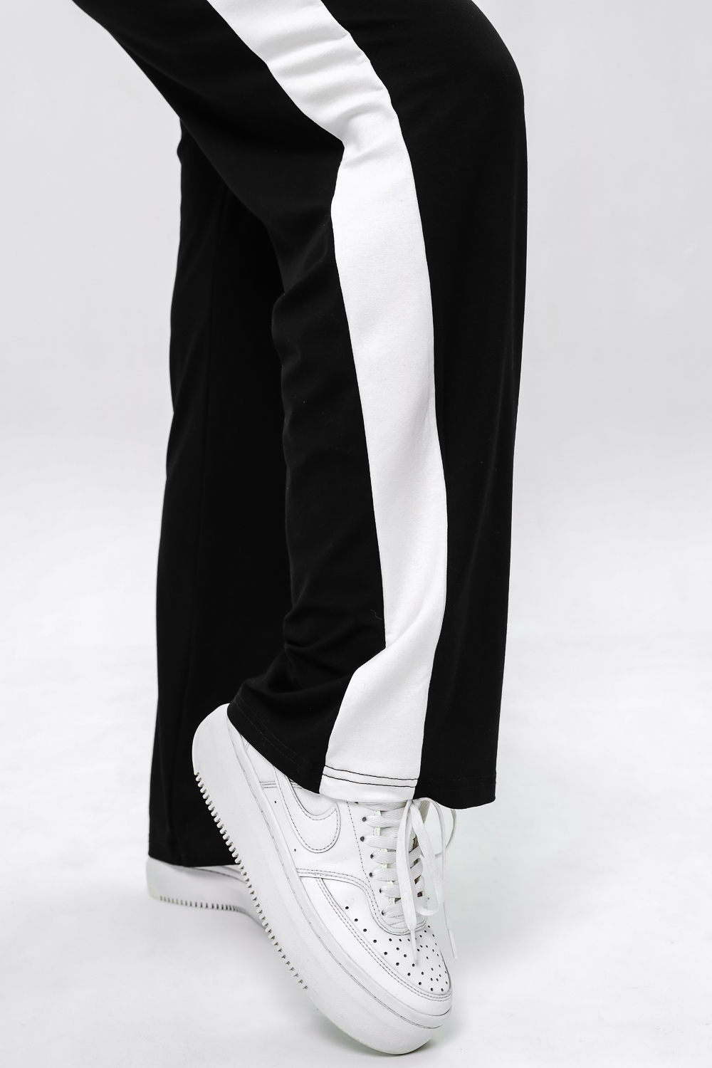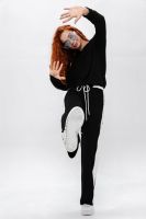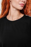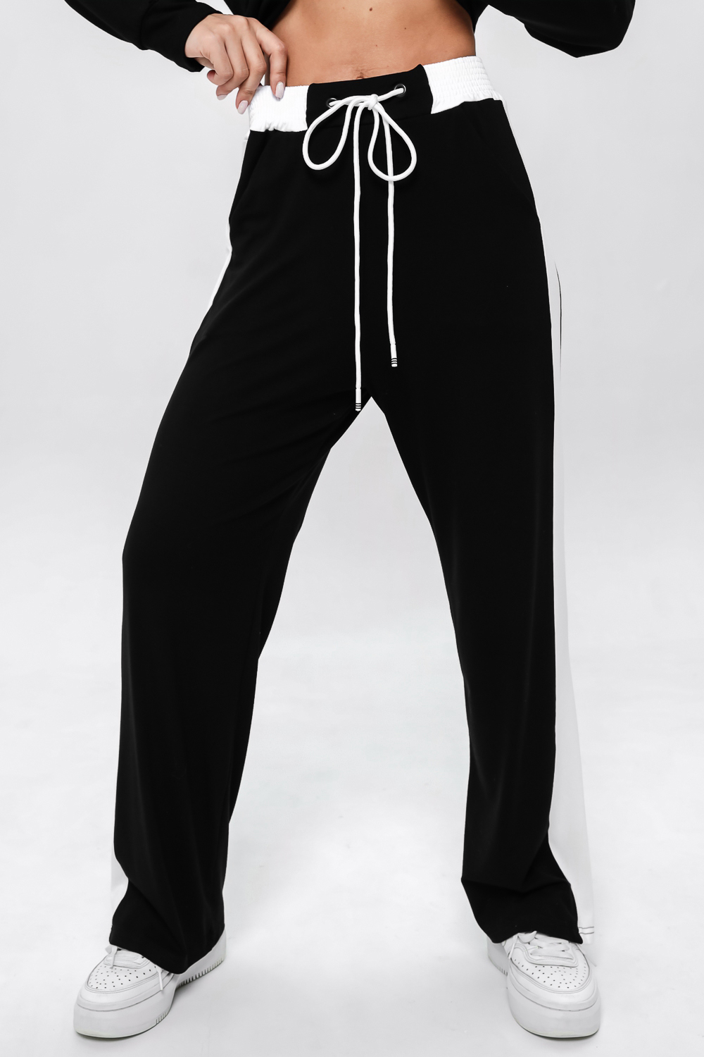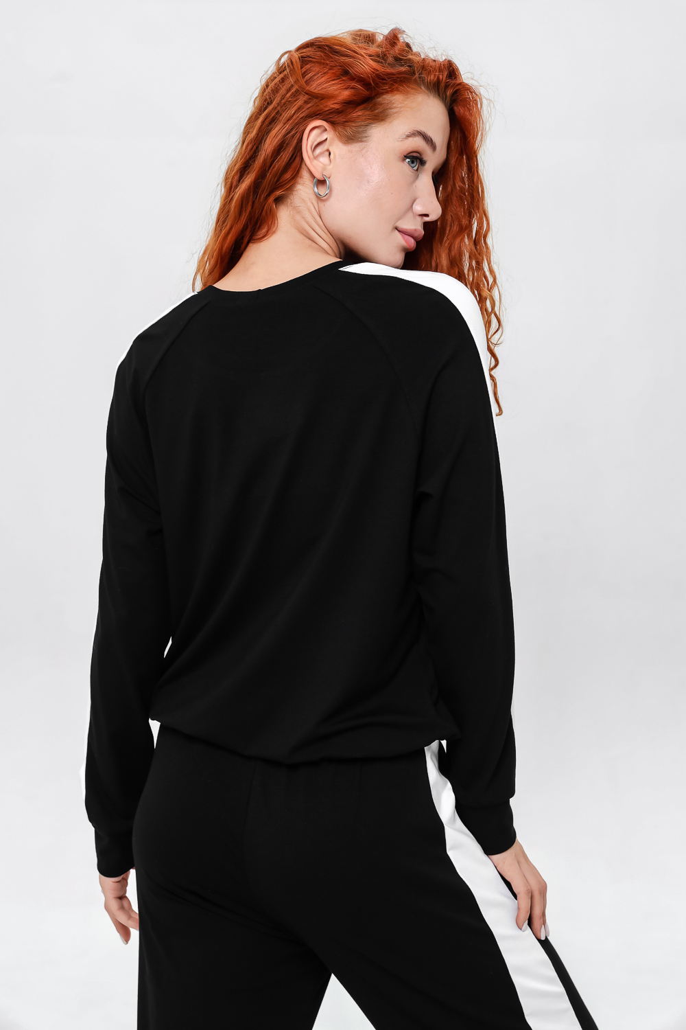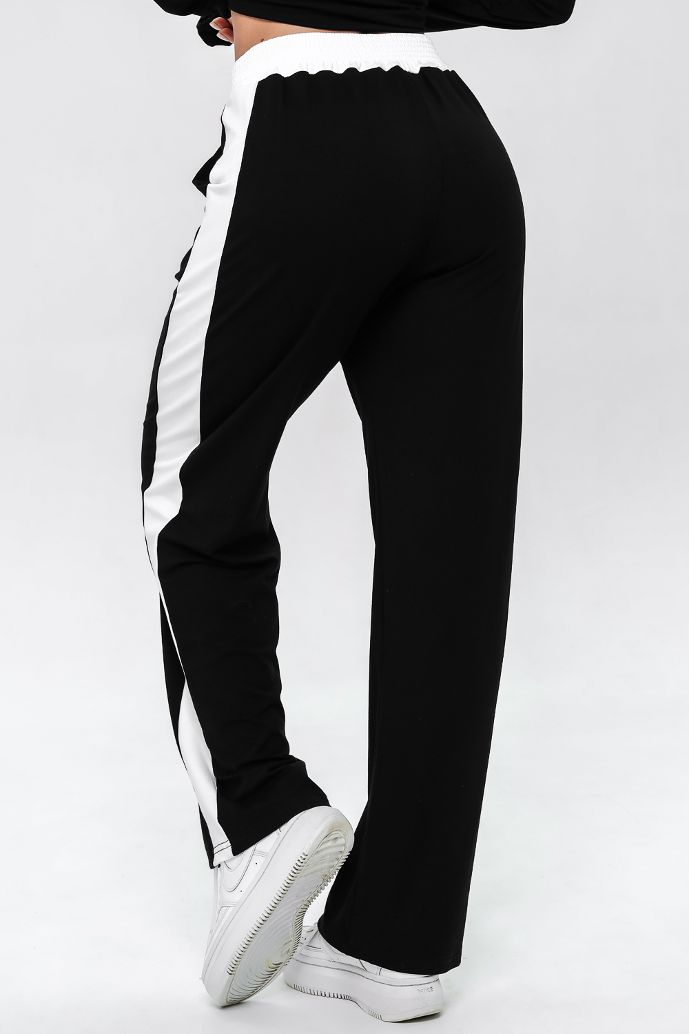 Костюм состоит из туники и брюк. Туника прямая, с округлой горловиной, с резинкой по низу. Рукав реглан, длинный, с лампасом из отделочного полотна вдоль рукава, на манжете. Горловина обработана обтачкой из основного полотна. Брюки прямые, на поясе, с боковыми карманами, с лампасами из отделочного полотна вдоль боковых швов.