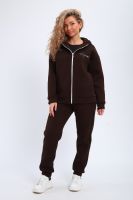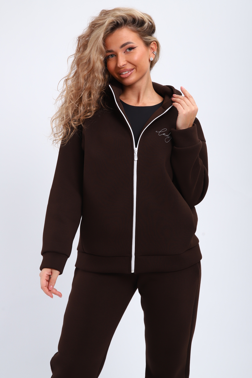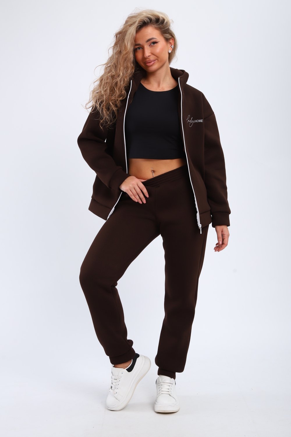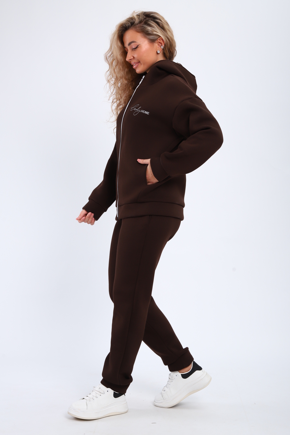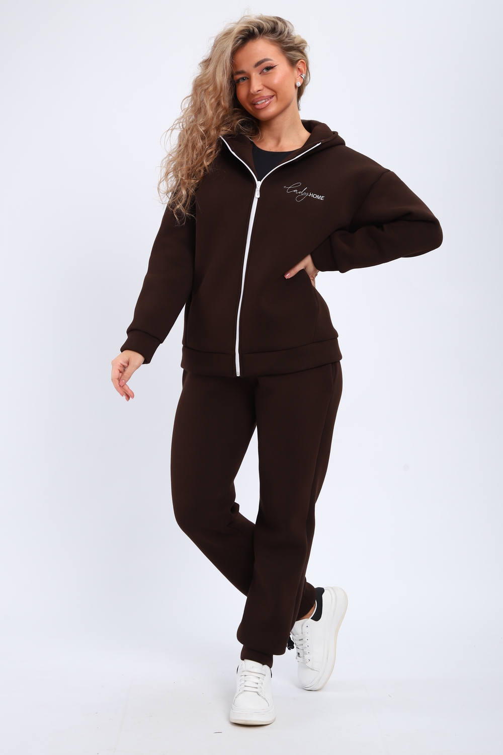 Женский костюм из футера 3-х нитки с начесом. Костюм состоит из толстовки и брюк. Толстовка свободная на молнии с капюшоном, на полочке оригинальная вышивка Lady HOME, по боковому шву в шве карман. Толстовка со спущенным рукавом на манжете. Брюки свободные. По боковому шву карман в шве, низ брюк на манжете. Пояс обработан на поясной машине, что делает брюки практичными при носке – резинка не скручивается. Костюм теплый, удобный, комфортный. Идеальное решение для повседневной носки в прохладную погоду!
