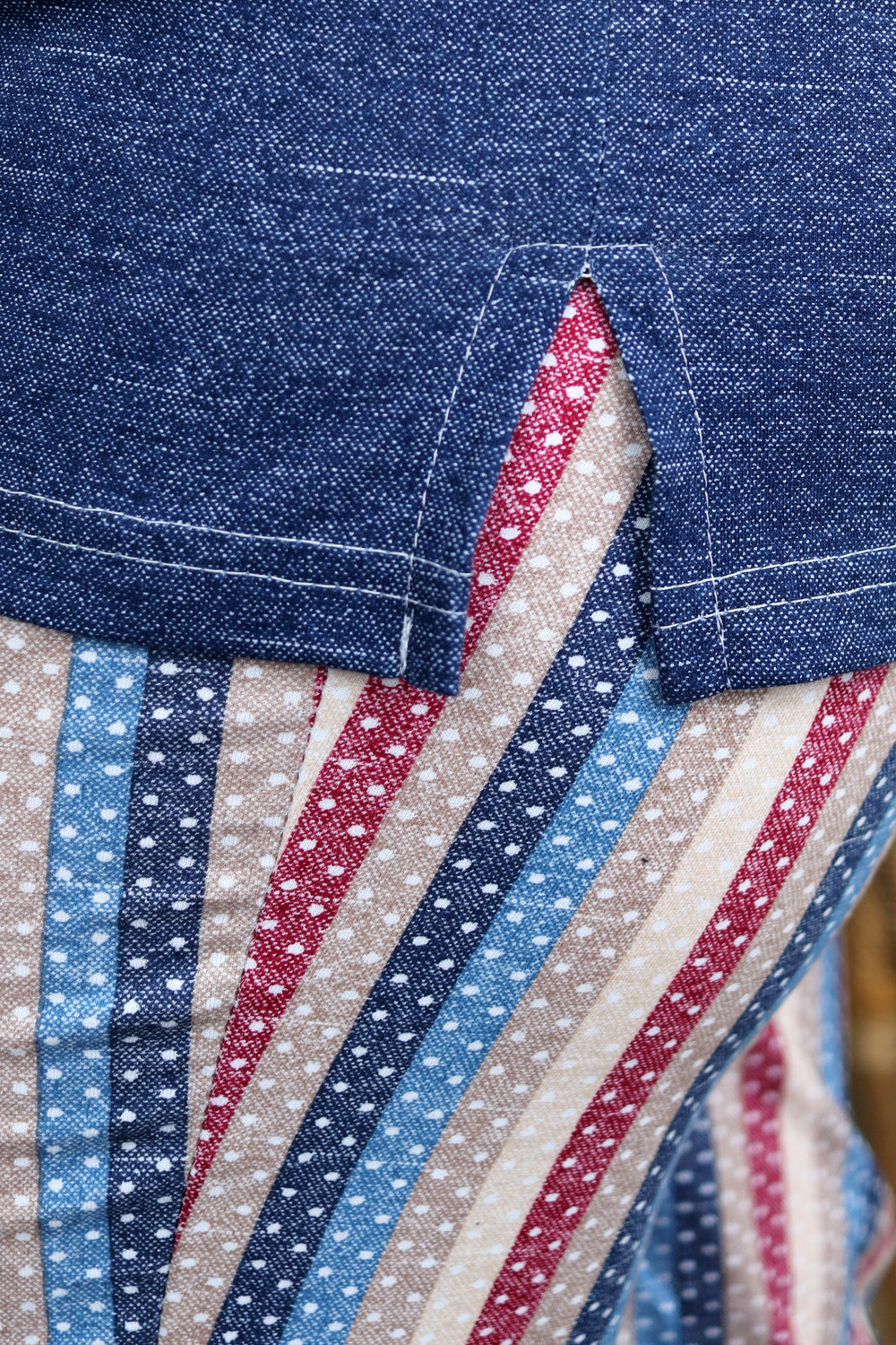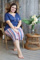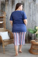 Костюм женский: туника и бриджи. Туника полуприлегающего силуэта с фигурным Y-образным вырезом. Рукав короткий цельнокроенный со швом. На полочке нагрудный карман с пуговицей, из отделочной ткани в полоску. В боковых швах туники и бриджей небольшие разрезы. Бриджи из ткани в полоску, длина ниже колена, на передних частях внутренние карманы, пояс обработан на многоигольной машине. На модели 52 размер