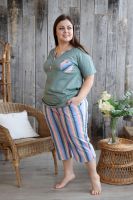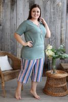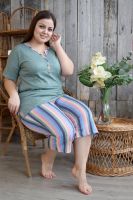 Костюм женский: туника и бриджи. Туника полуприлегающего силуэта с фигурным Y-образным вырезом. Рукав короткий цельнокроенный со швом. На полочке нагрудный карман с пуговицей, из отделочной ткани в полоску. В боковых швах туники и бриджей небольшие разрезы. Бриджи из ткани в полоску, длина ниже колена, на передних частях внутренние карманы, пояс обработан на многоигольной машине. На модели 52 размер