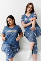 Костюм женский: туника и брюки. Туника прямого силуэта, вырез Y-образный. Полочка несколько короче спинки, сбоку разрезы. На полочке принт. Рукав не цельный, два хляста, расположенные через расстояние друг от друга, втачаны в боковые части рукава. Брюки свободные, "бананы", внизу передней и задней части по две встречные складки, манжеты. В брюках удобные внутренние карманы, пояс выполнен на многоигольной машине.