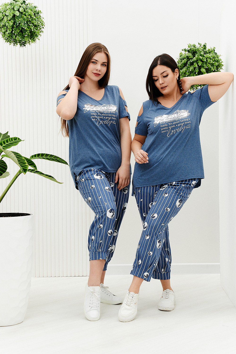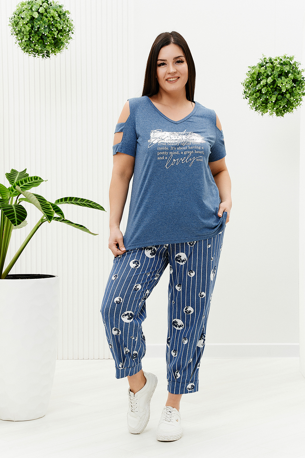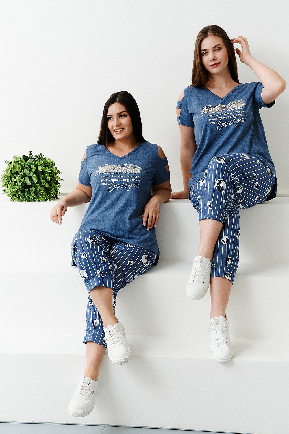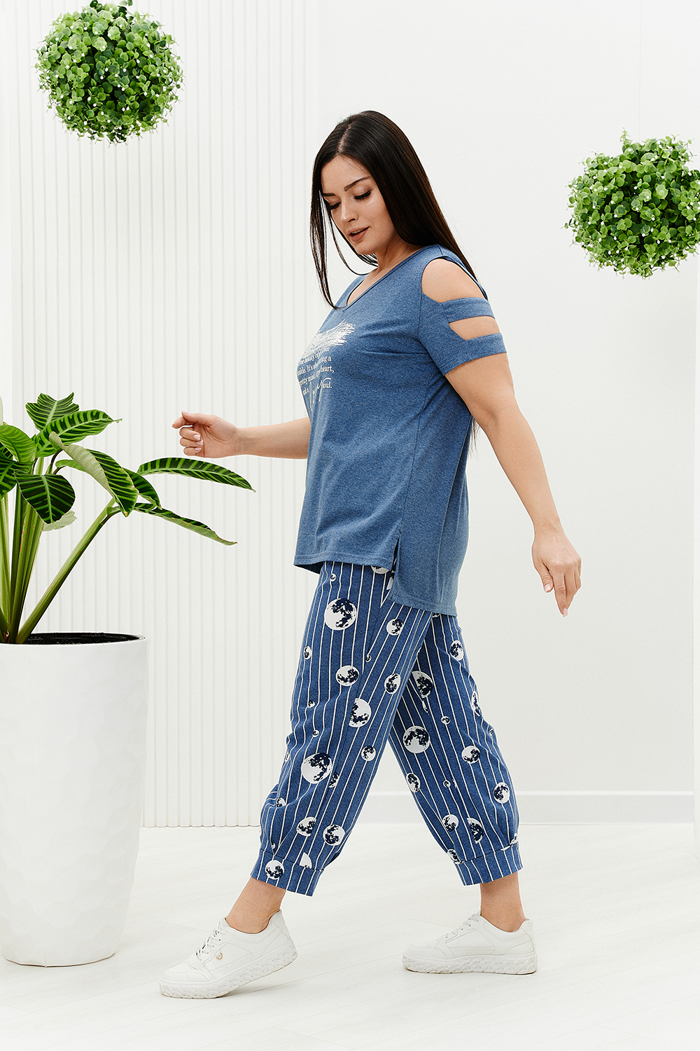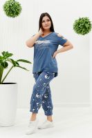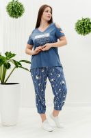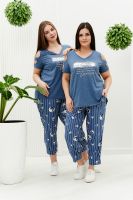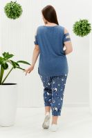 Костюм женский: туника и брюки. Туника прямого силуэта, вырез Y-образный. Полочка несколько короче спинки, сбоку разрезы. На полочке принт. Рукав не цельный, два хляста, расположенные через расстояние друг от друга, втачаны в боковые части рукава. Брюки свободные, "бананы", внизу передней и задней части по две встречные складки, манжеты. В брюках удобные внутренние карманы, пояс выполнен на многоигольной машине.