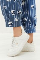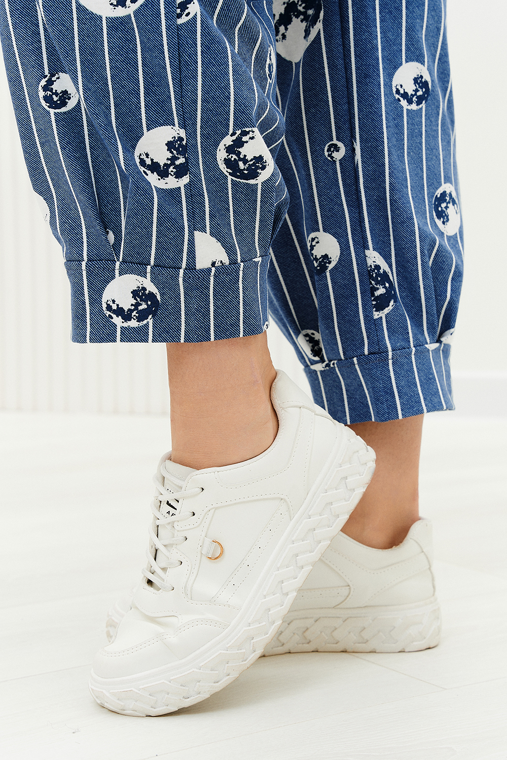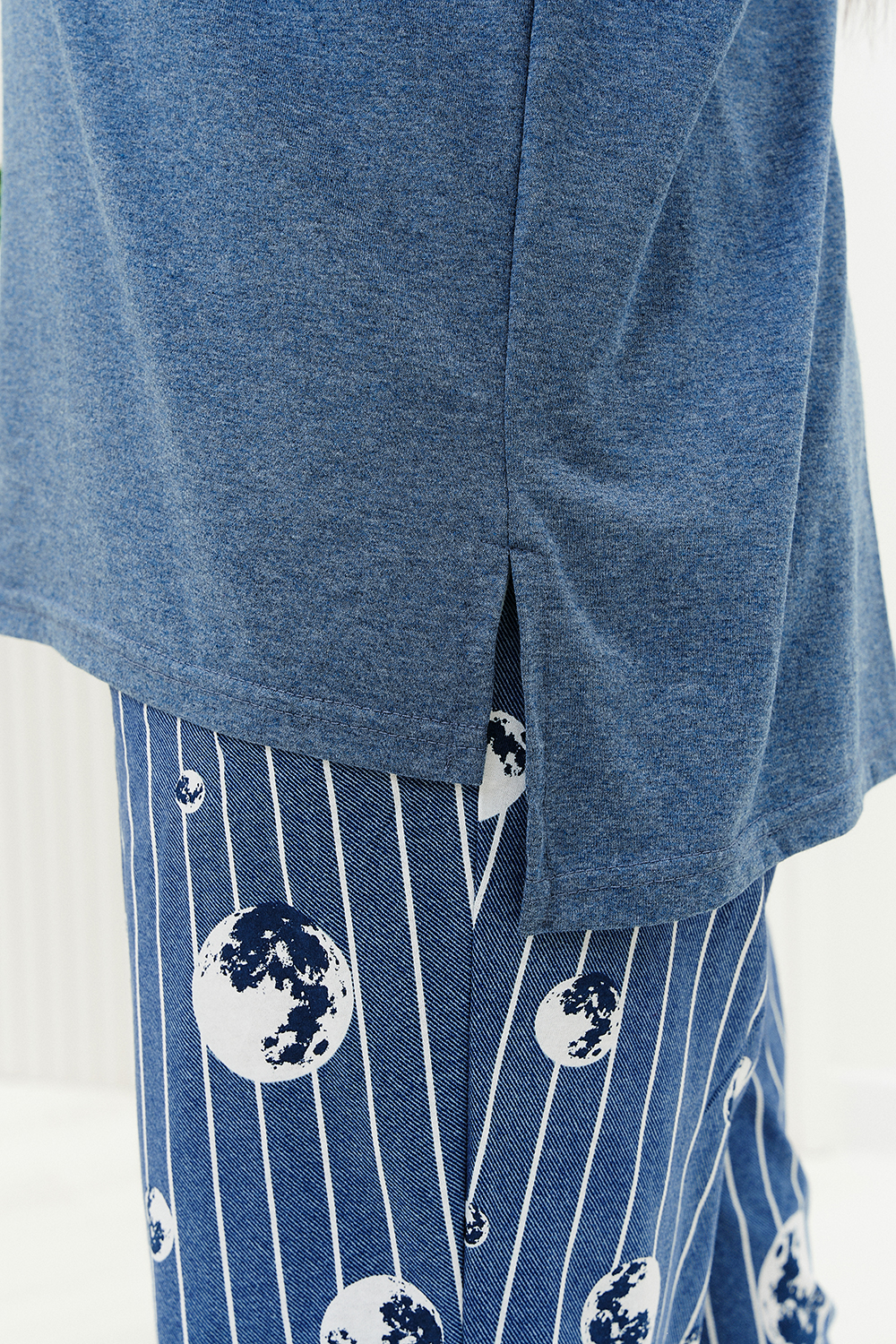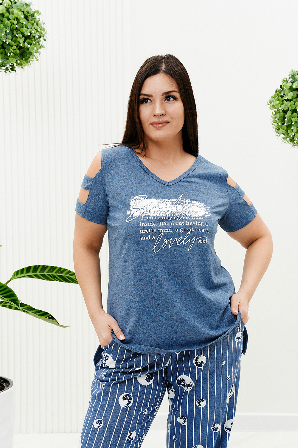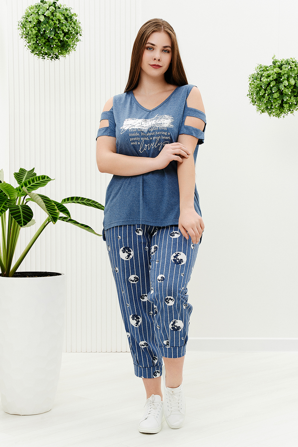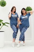 Костюм женский: туника и брюки. Туника прямого силуэта, вырез Y-образный. Полочка несколько короче спинки, сбоку разрезы. На полочке принт. Рукав не цельный, два хляста, расположенные через расстояние друг от друга, втачаны в боковые части рукава. Брюки свободные, "бананы", внизу передней и задней части по две встречные складки, манжеты. В брюках удобные внутренние карманы, пояс выполнен на многоигольной машине.