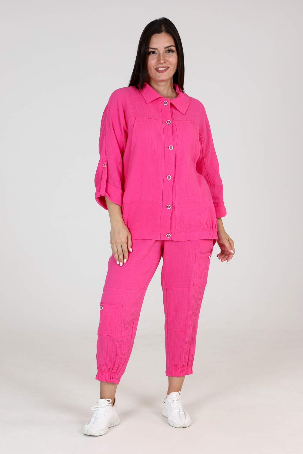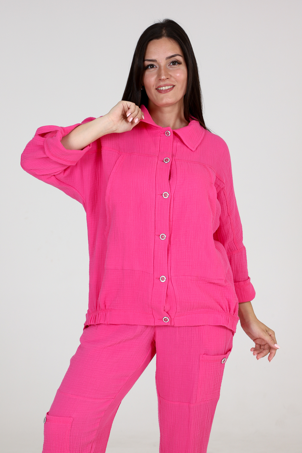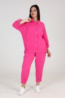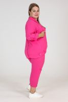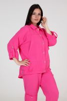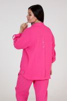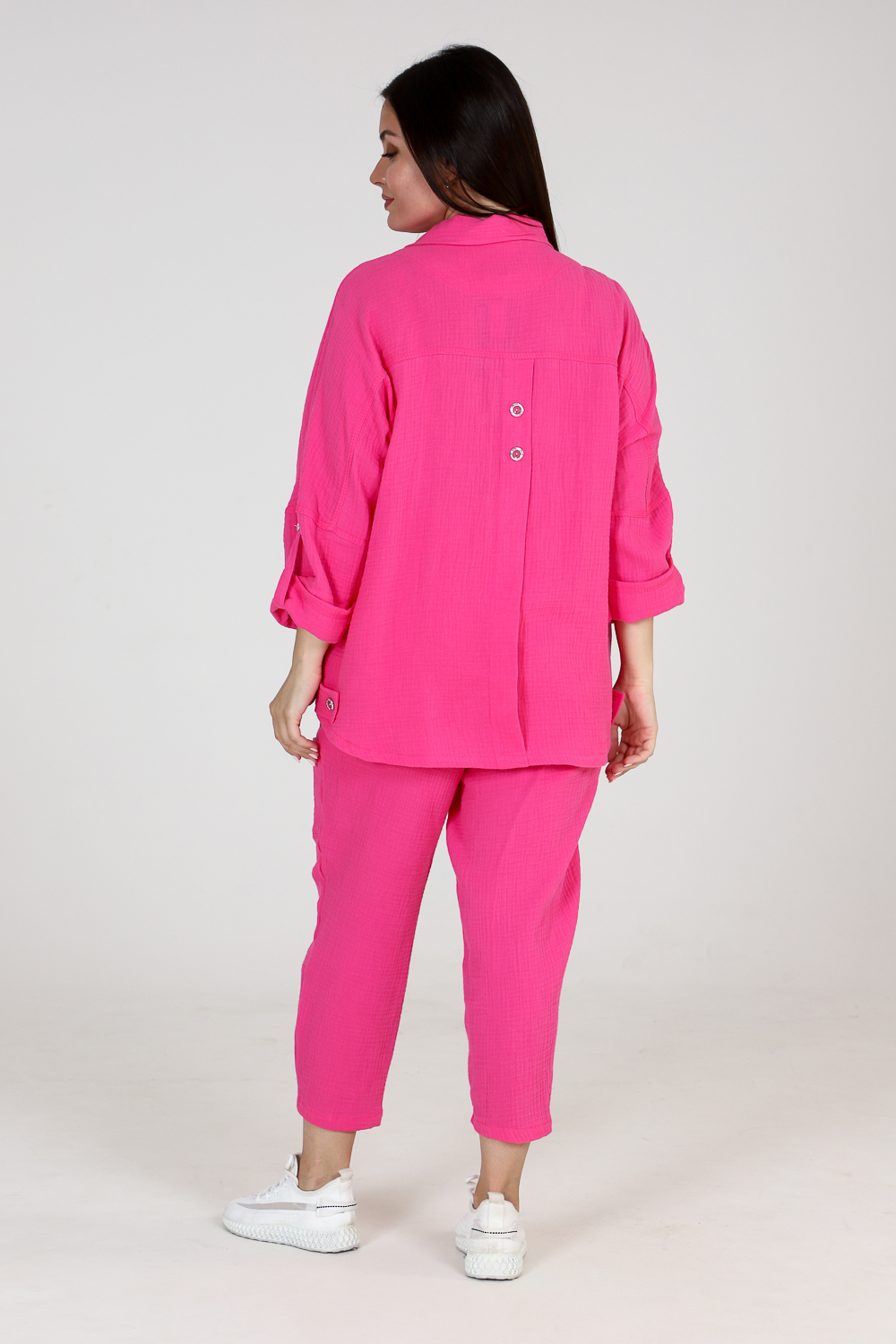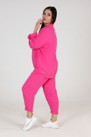 Костюм женский: Куртка и брюки. Куртка прямого силуэта, воротник втачной, на полочке кокетка и накладной карман типа "кенгуру", застежка на планке на петли - пуговицы (петли с глазком). Рукав цельнокроенный со швом с манжетой и хлястом. Внизу полочки пояс, сбоку пояса резинка. На спинке кокетка, по центру декоративная складка с двумя пуговицами. Внизу бокового две декоративные паты с пуговицами. Брюки свободные по бедрам, внизу передние половинки брюк собраны на резинку. Передняя часть брюк состоит из трех частей. В верхней части внутренние накладные карманы. Накладной карман на верхней левой и средней правой частях брюк. Пояс выполнен на многоигольной машине.