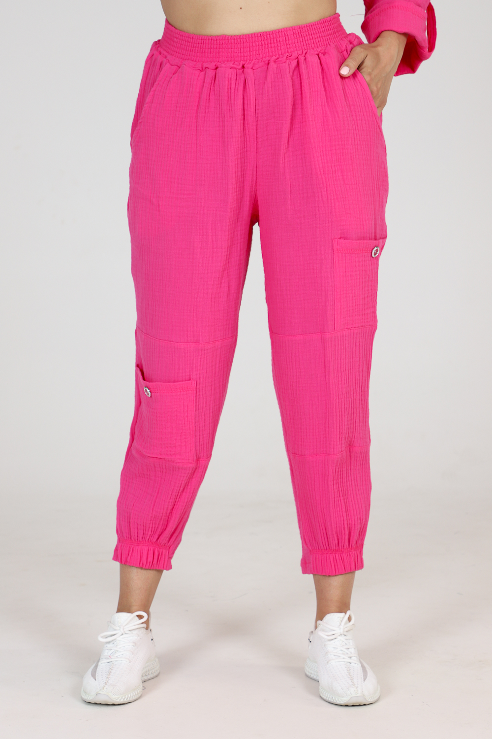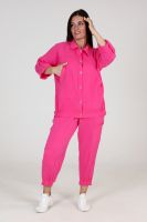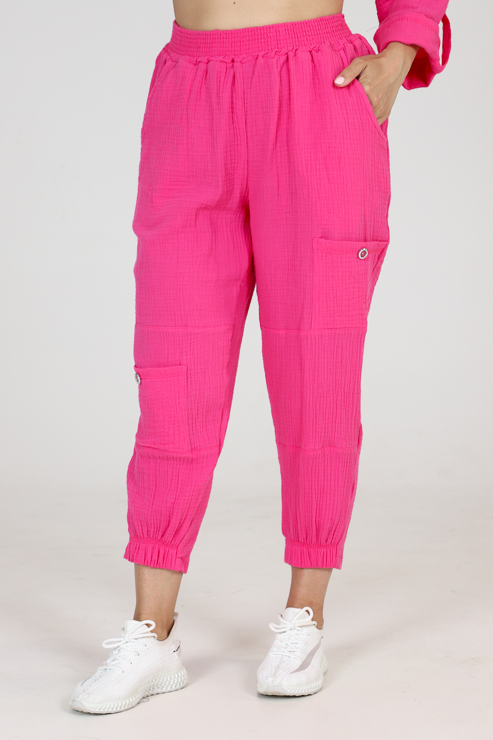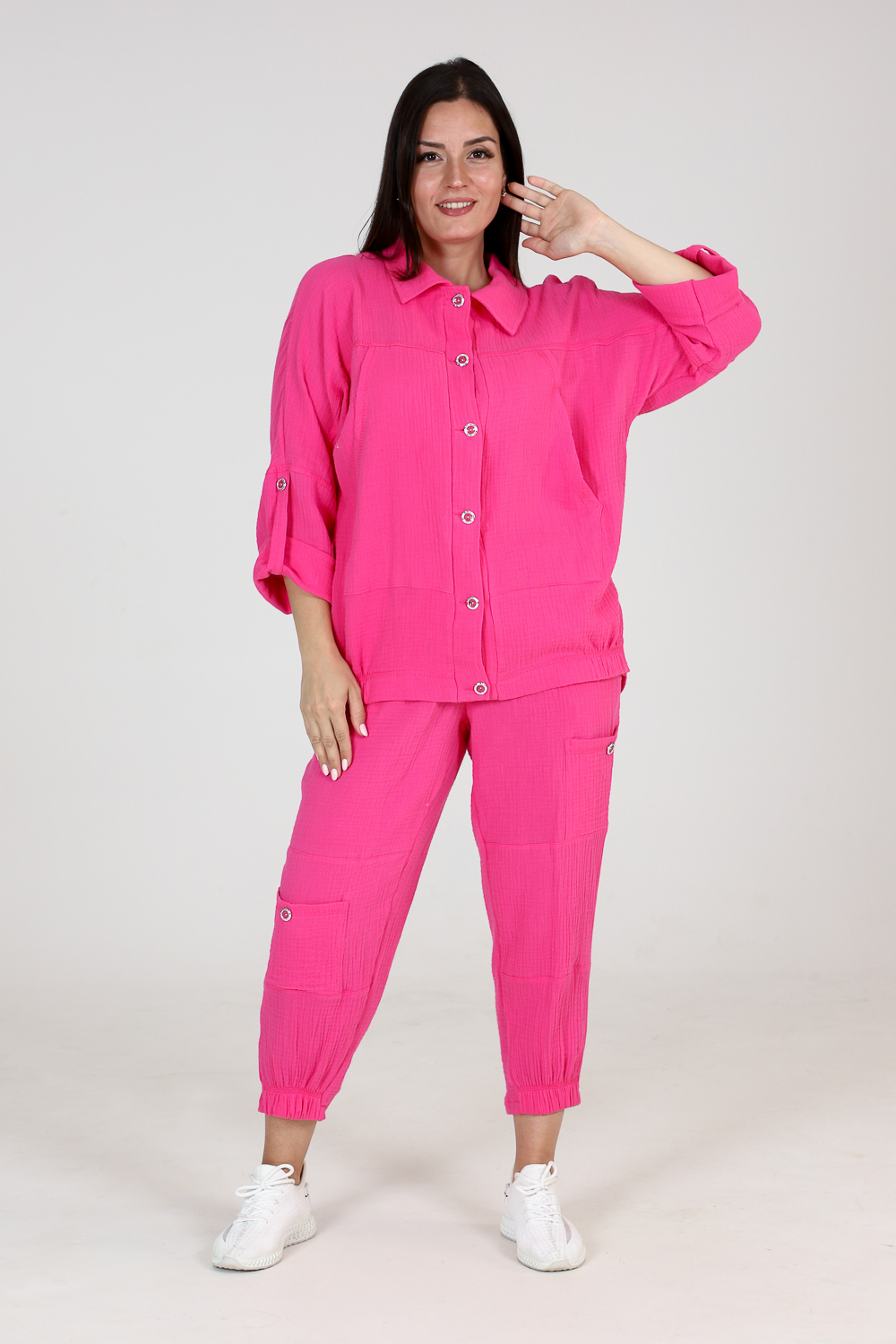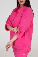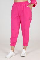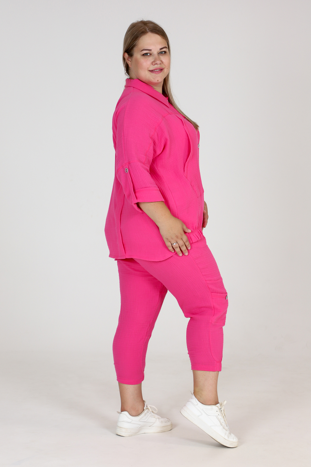 Костюм женский: Куртка и брюки. Куртка прямого силуэта, воротник втачной, на полочке кокетка и накладной карман типа "кенгуру", застежка на планке на петли - пуговицы (петли с глазком). Рукав цельнокроенный со швом с манжетой и хлястом. Внизу полочки пояс, сбоку пояса резинка. На спинке кокетка, по центру декоративная складка с двумя пуговицами. Внизу бокового две декоративные паты с пуговицами. Брюки свободные по бедрам, внизу передние половинки брюк собраны на резинку. Передняя часть брюк состоит из трех частей. В верхней части внутренние накладные карманы. Накладной карман на верхней левой и средней правой частях брюк. Пояс выполнен на многоигольной машине.