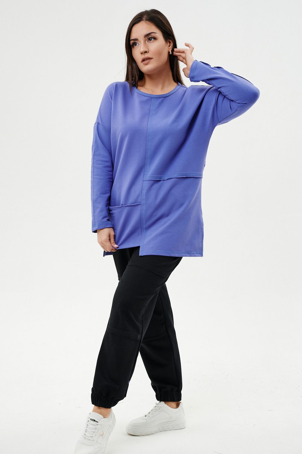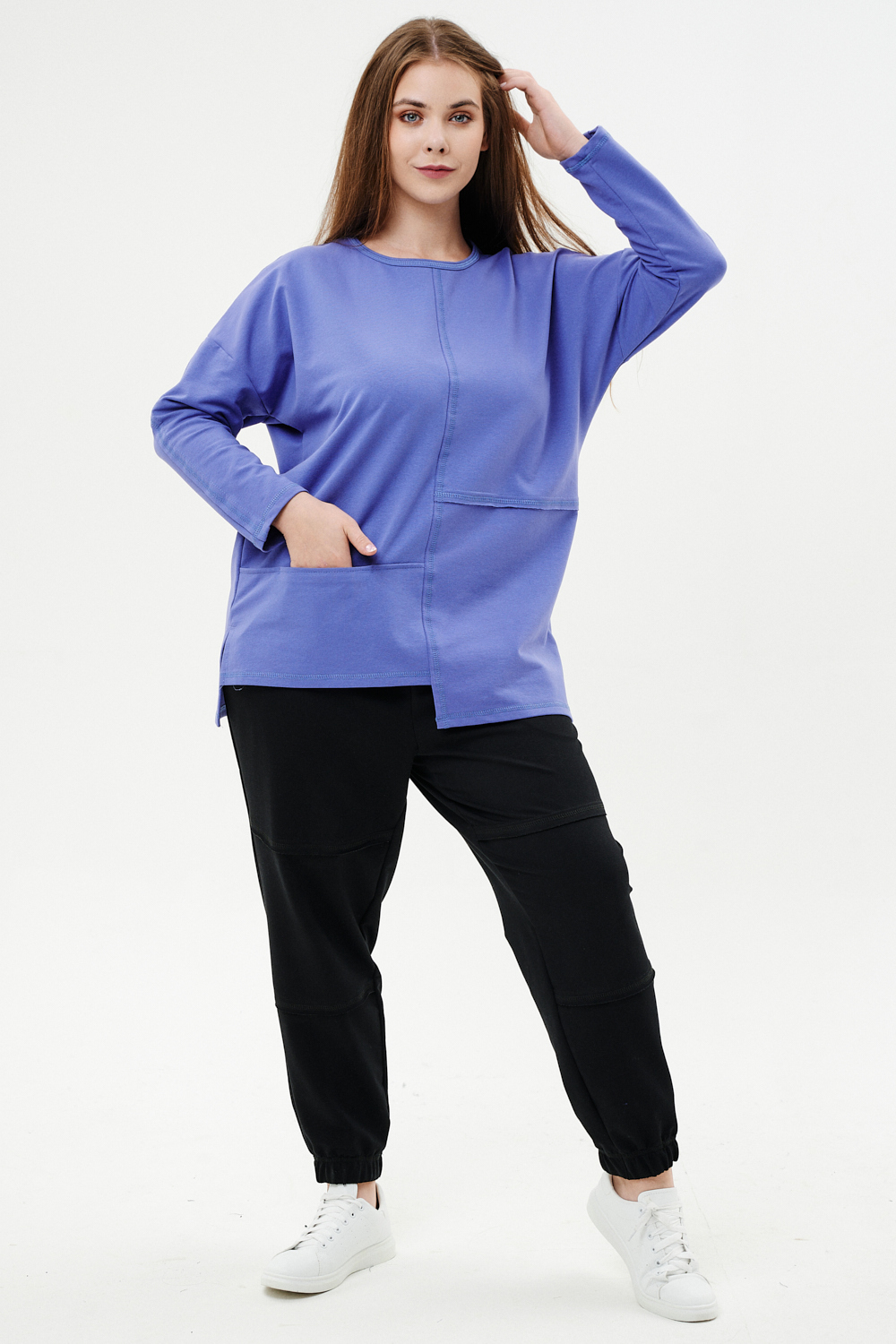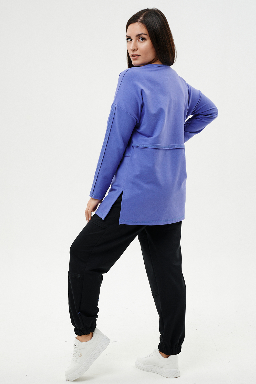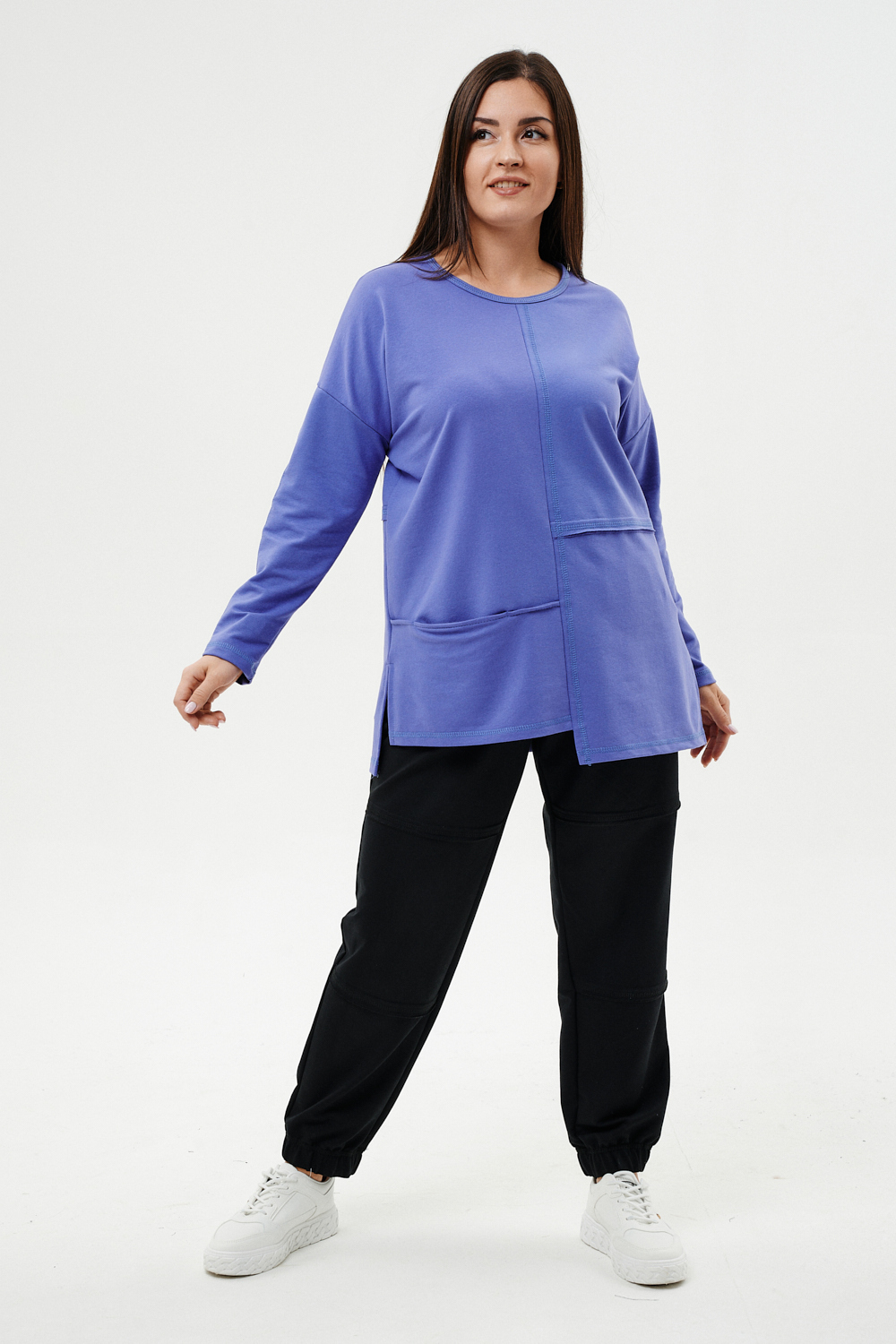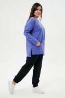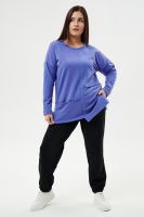 Костюм женский: туника и брюки. Туника прямого силуэта, горловина круглая, рукав длинный, цельнокроеный со швом., состоит из передней и задней частей. Полочка из четырех частей: на правой части внутренний горизонтальный карман в шве, на левой горизонтальный шов с открытыми срезами, аналогичный шов на спинке и на передней части брюк. В боковых швах разрезы. Брюки свободные по бедрам, зауженные к низу, на передней части брюк внутренние карманы. Пояс выполнен на многоигольной машине.