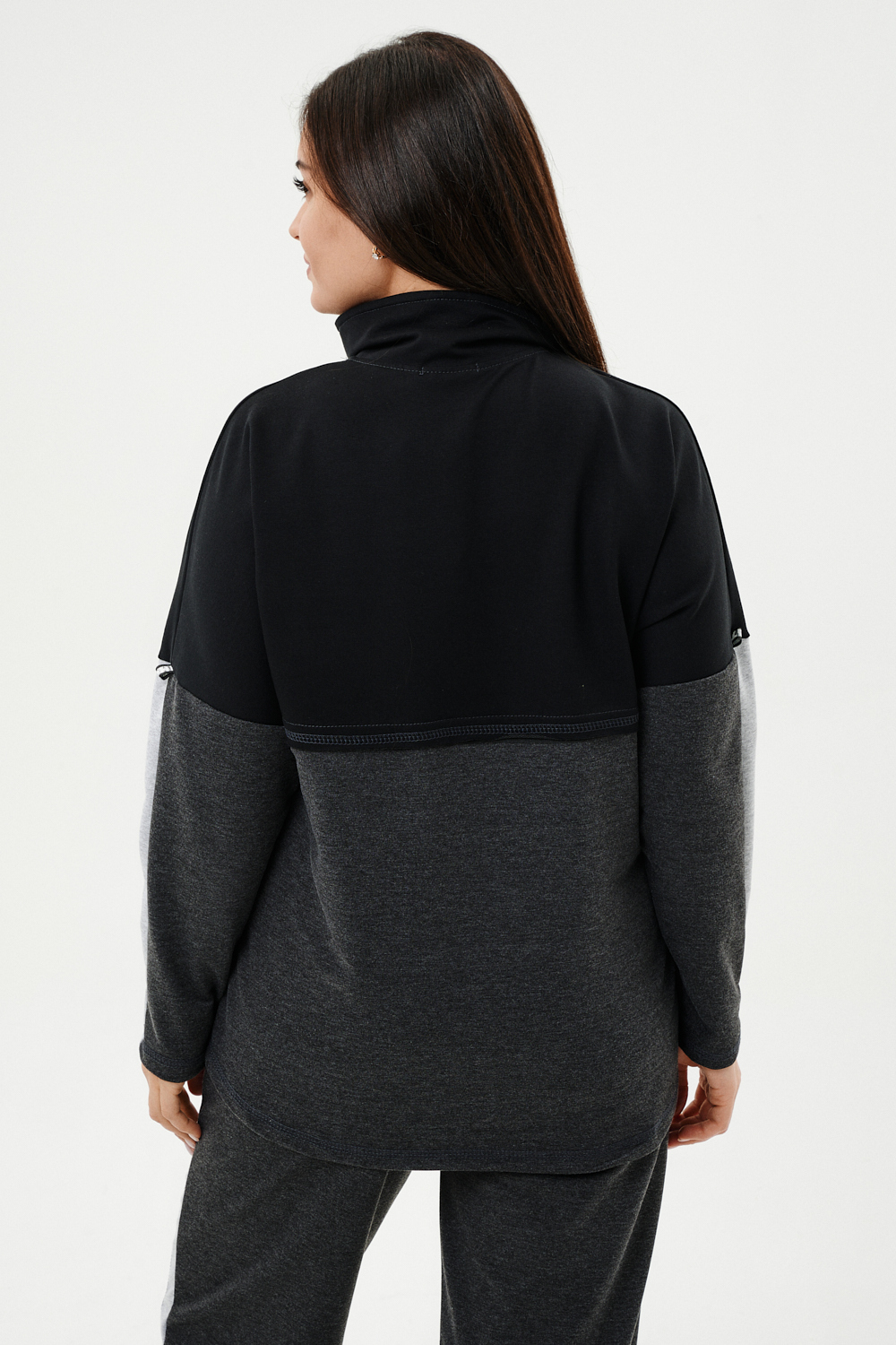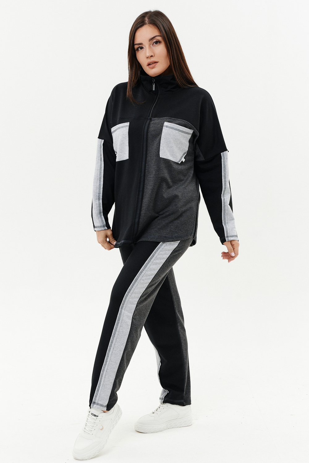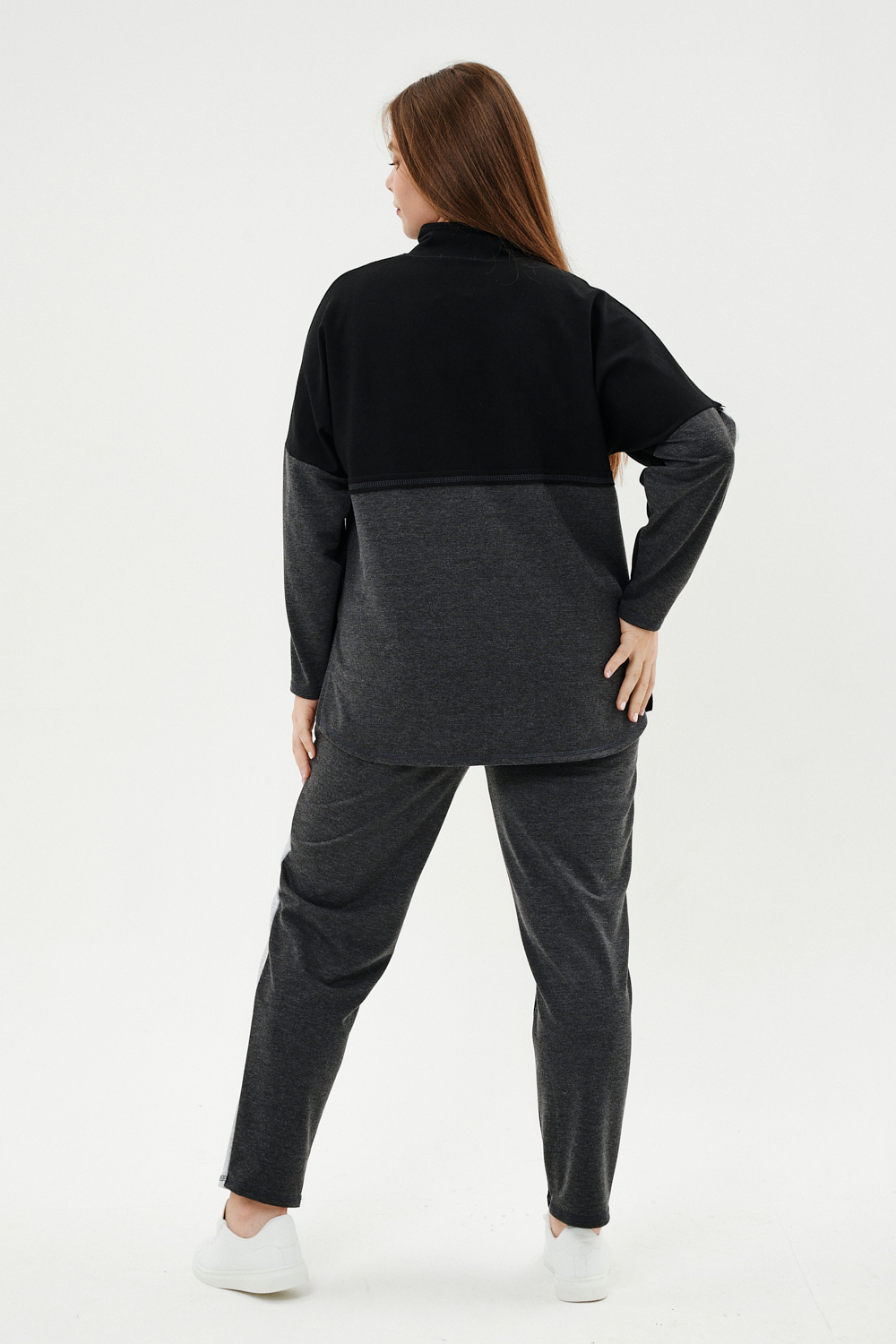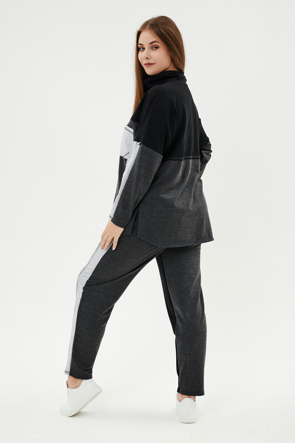 Костюм женский: толстовка и брюки. Толстовка прямого силуэта, брюки свободные по бедрам, зауженные к низу. Рукав цельнокроенный со швом. Воротник-стойка застегивается на тесьму-молнию. В костюме удачно сочетается однотонный футер с меланжированным. На спинке и полочке кокетки. Нагрудные карманы, лампасы на рукавах и брюках из контрастной отделочной ткани. На передних половинках брюк внутренние карманы.