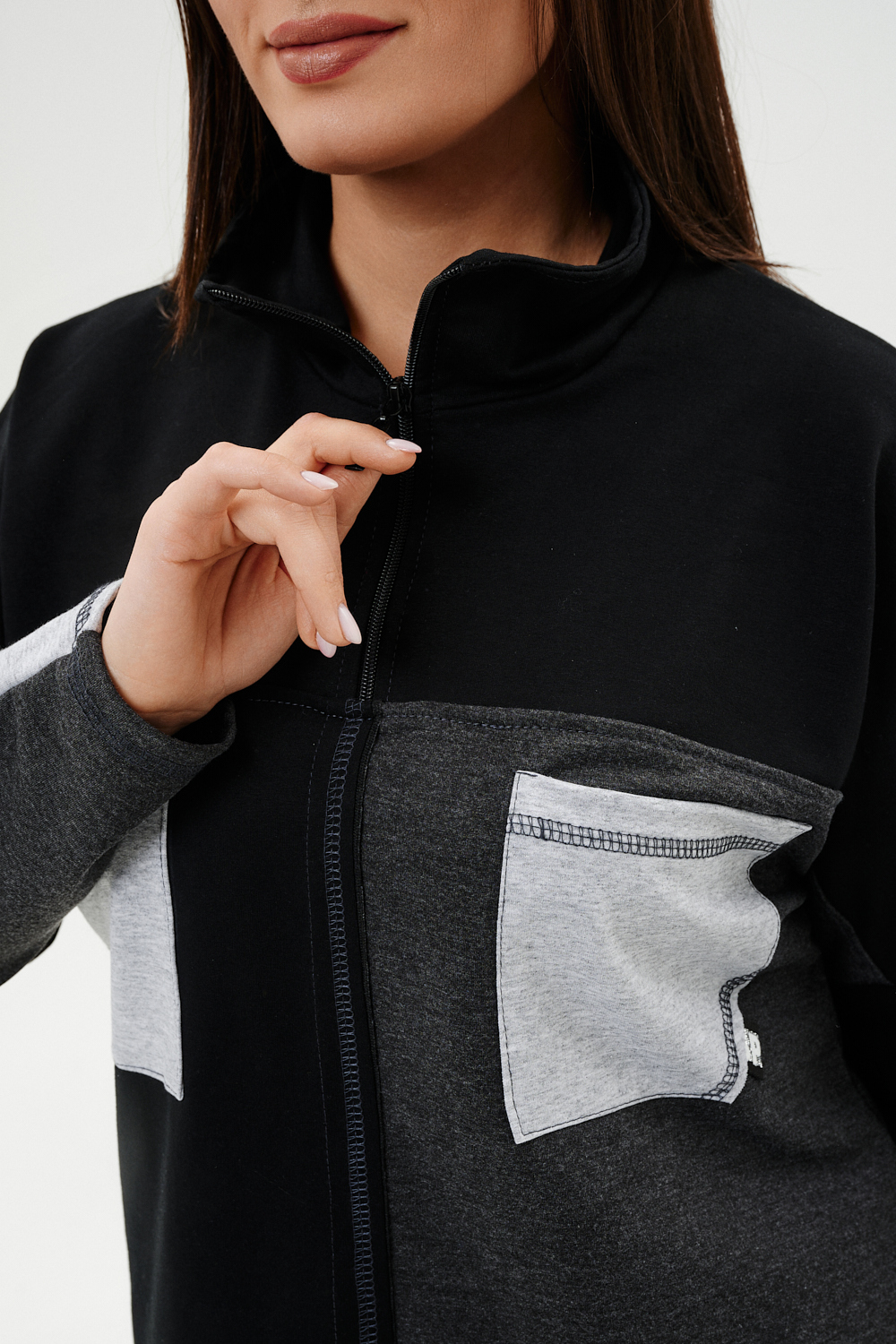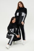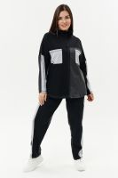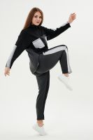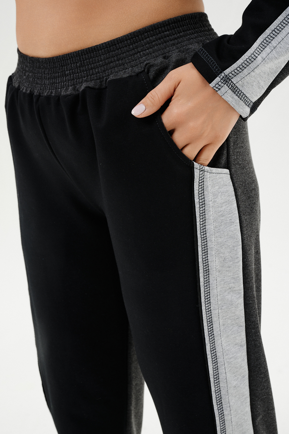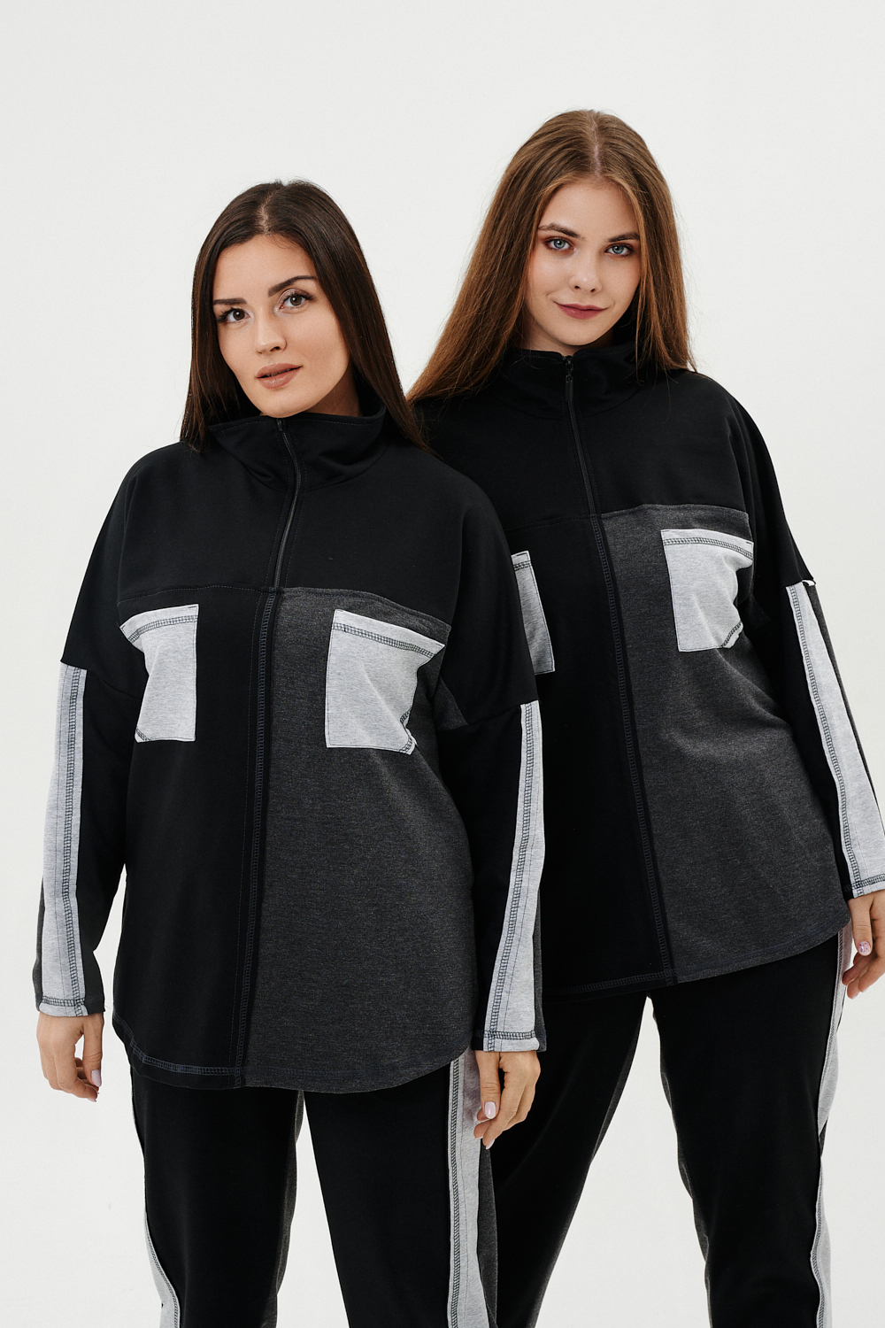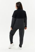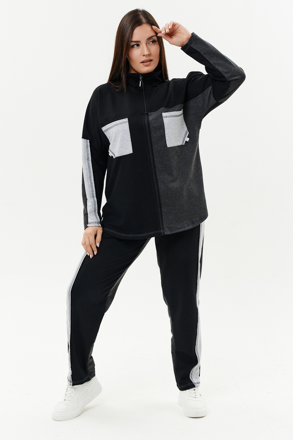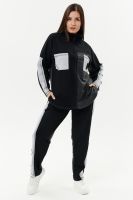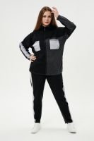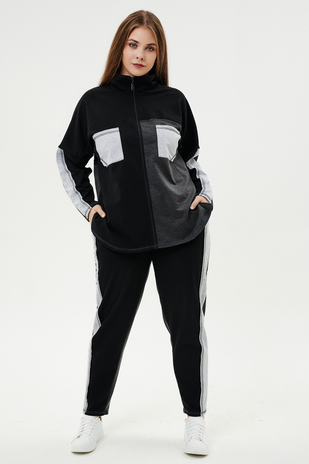 Костюм женский: толстовка и брюки. Толстовка прямого силуэта, брюки свободные по бедрам, зауженные к низу. Рукав цельнокроенный со швом. Воротник-стойка застегивается на тесьму-молнию. В костюме удачно сочетается однотонный футер с меланжированным. На спинке и полочке кокетки. Нагрудные карманы, лампасы на рукавах и брюках из контрастной отделочной ткани. На передних половинках брюк внутренние карманы.