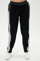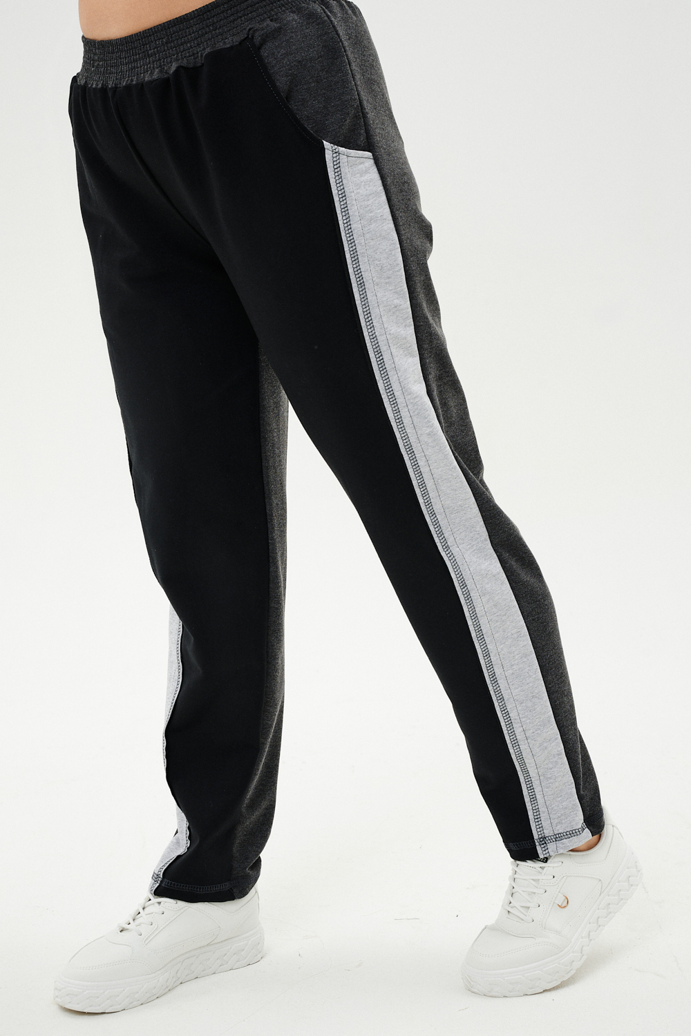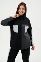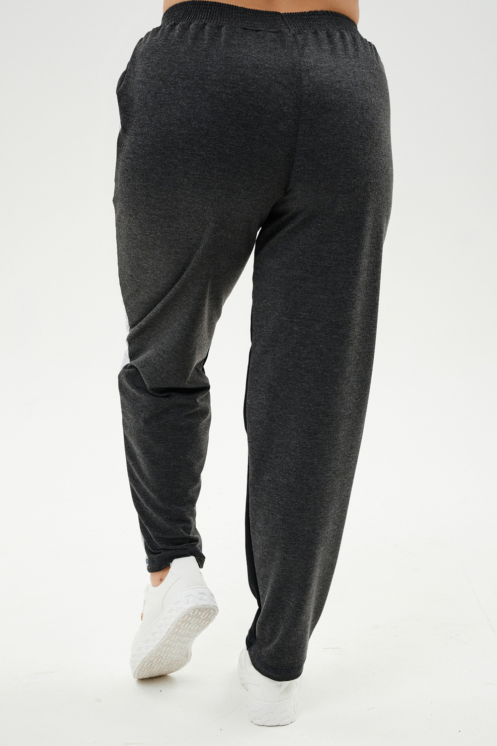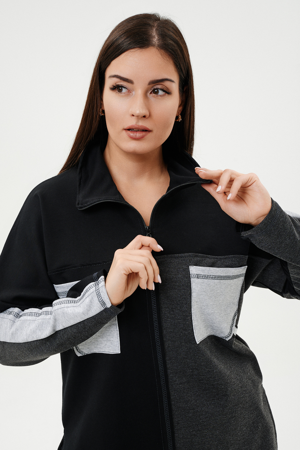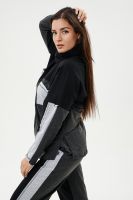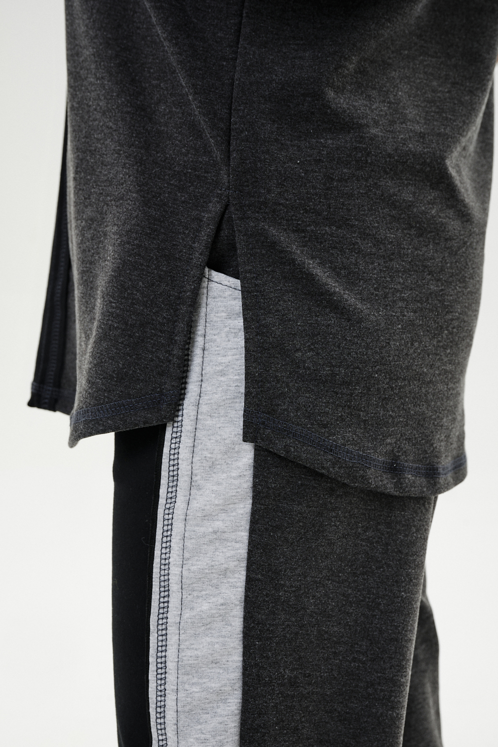 Костюм женский: толстовка и брюки. Толстовка прямого силуэта, брюки свободные по бедрам, зауженные к низу. Рукав цельнокроенный со швом. Воротник-стойка застегивается на тесьму-молнию. В костюме удачно сочетается однотонный футер с меланжированным. На спинке и полочке кокетки. Нагрудные карманы, лампасы на рукавах и брюках из контрастной отделочной ткани. На передних половинках брюк внутренние карманы.