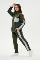 Костюм женский: толстовка и брюки. Толстовка прямого силуэта, брюки свободные по бедрам, зауженные к низу. Рукав цельнокроенный со швом. Воротник-стойка застегивается на тесьму-молнию. В костюме удачно сочетается однотонный футер с меланжированным. На спинке и полочке кокетки. Нагрудные карманы, лампасы на рукавах и брюках из контрастной отделочной ткани. На передних половинках брюк внутренние карманы.