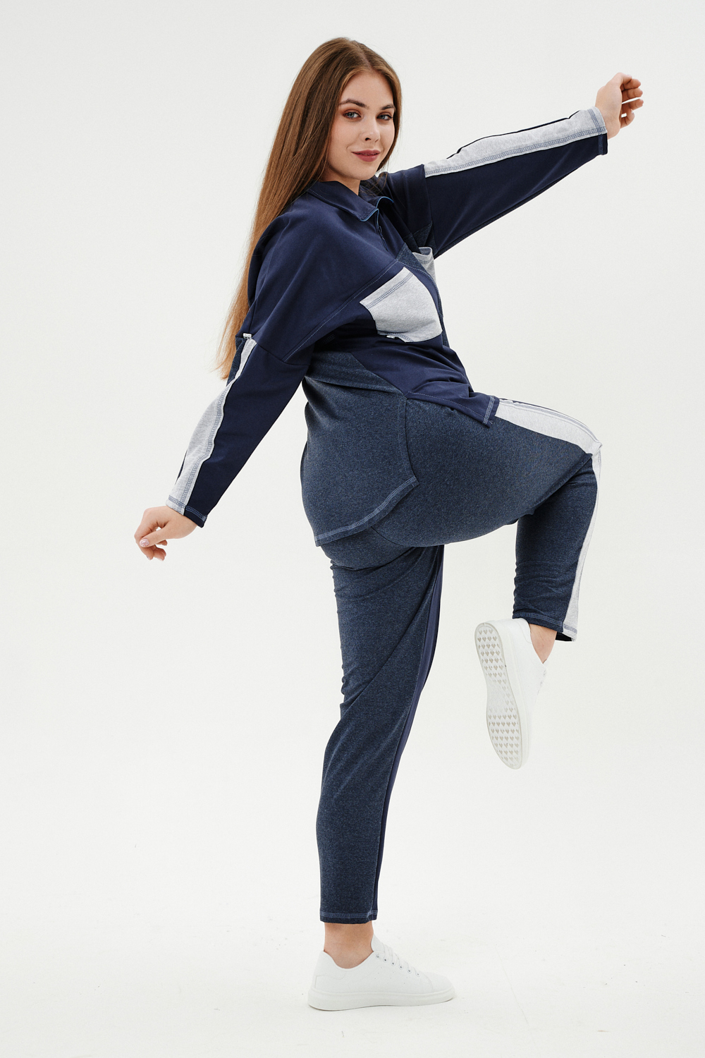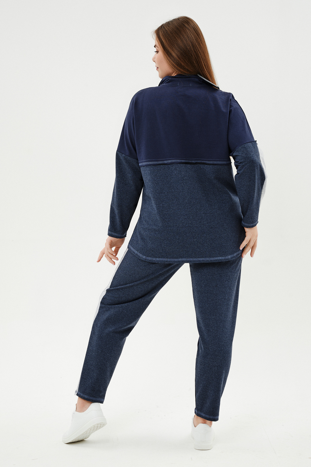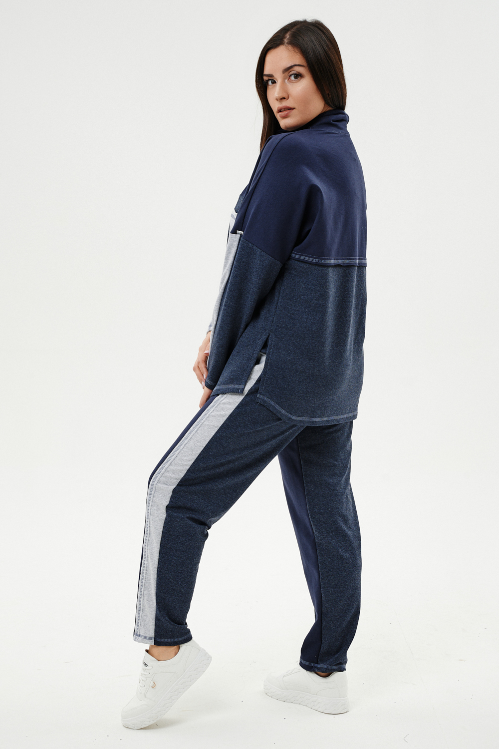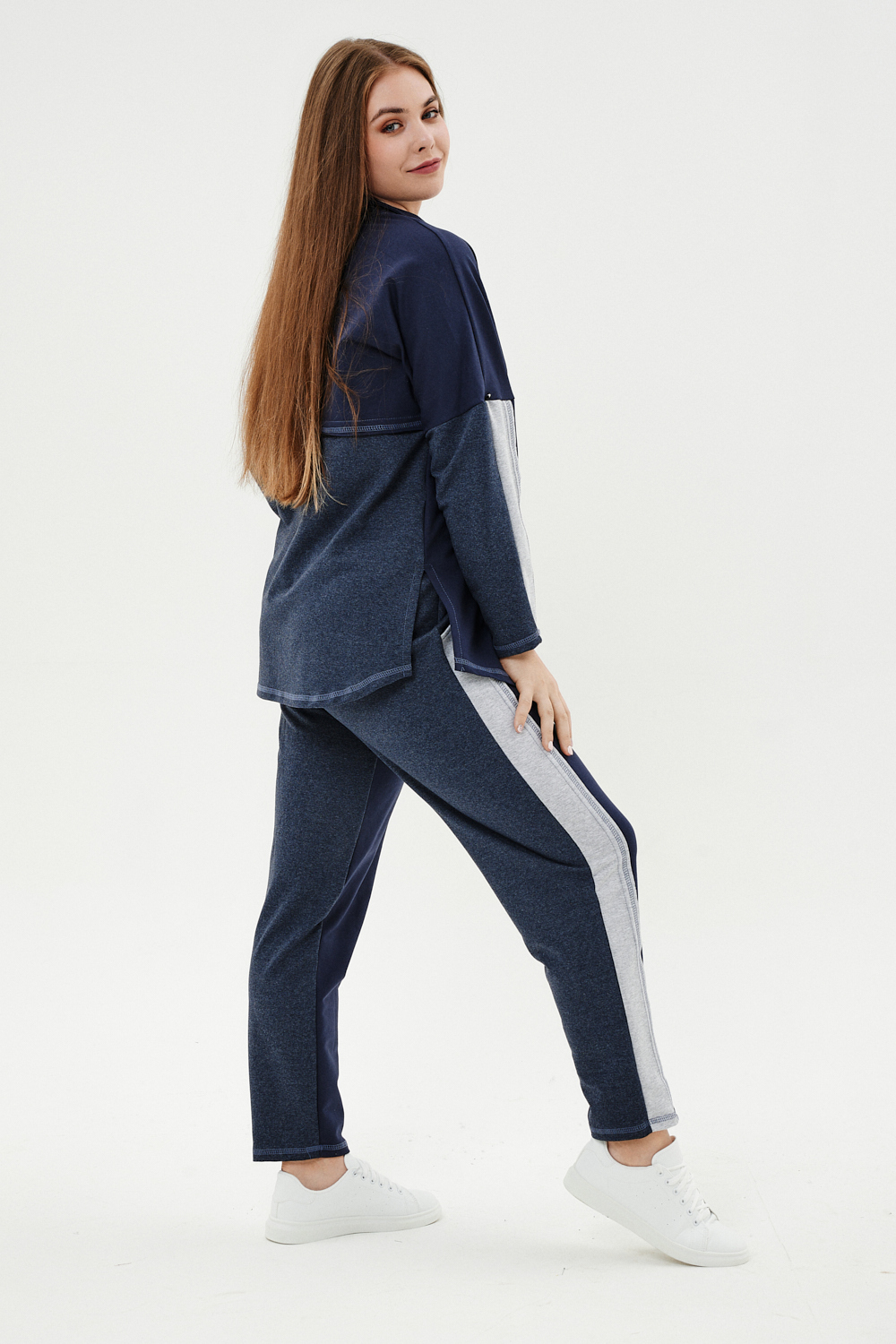 Костюм женский: толстовка и брюки. Толстовка прямого силуэта, брюки свободные по бедрам, зауженные к низу. Рукав цельнокроенный со швом. Воротник-стойка застегивается на тесьму-молнию. В костюме удачно сочетается однотонный футер с меланжированным. На спинке и полочке кокетки. Нагрудные карманы, лампасы на рукавах и брюках из контрастной отделочной ткани. На передних половинках брюк внутренние карманы.