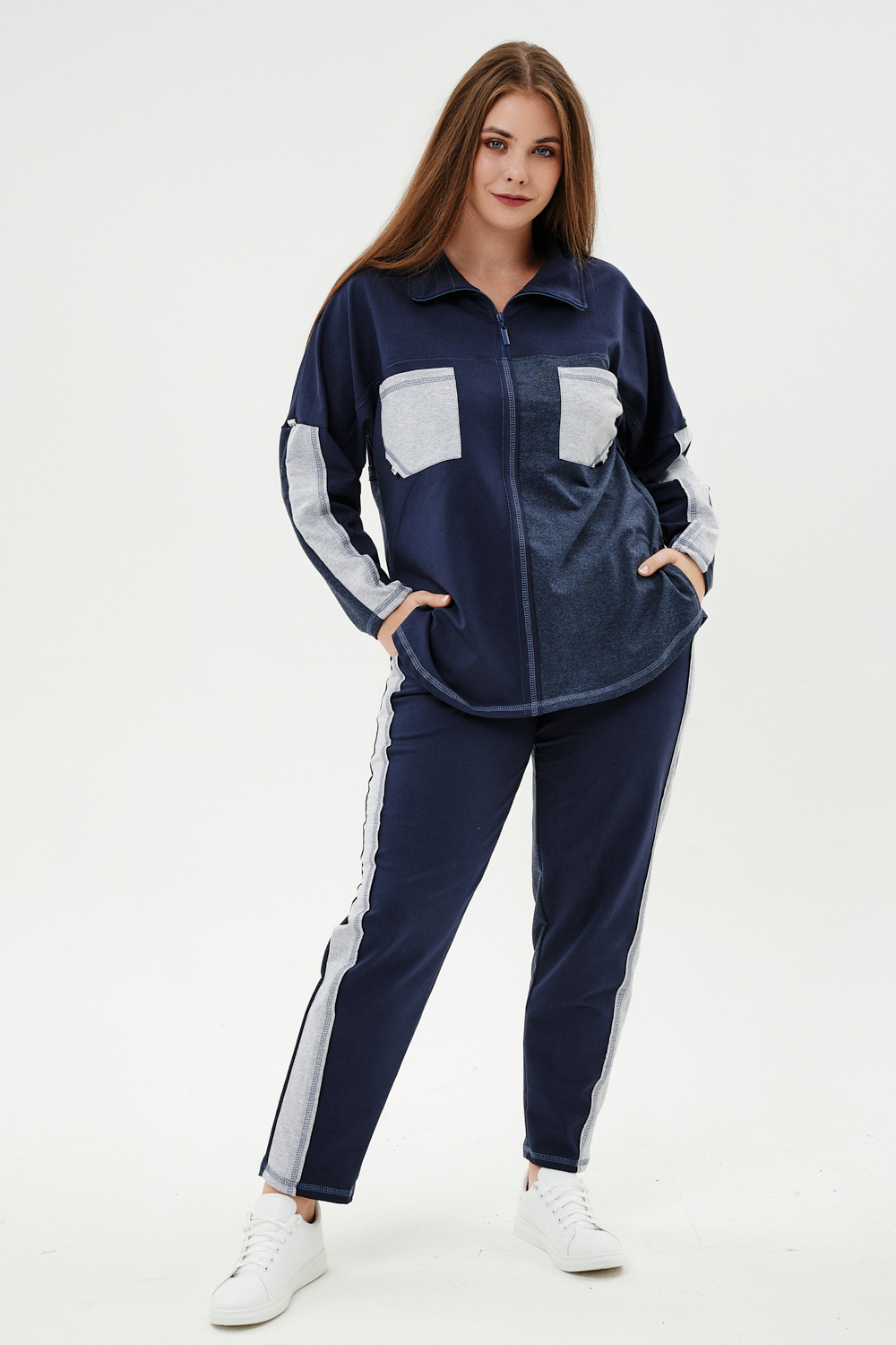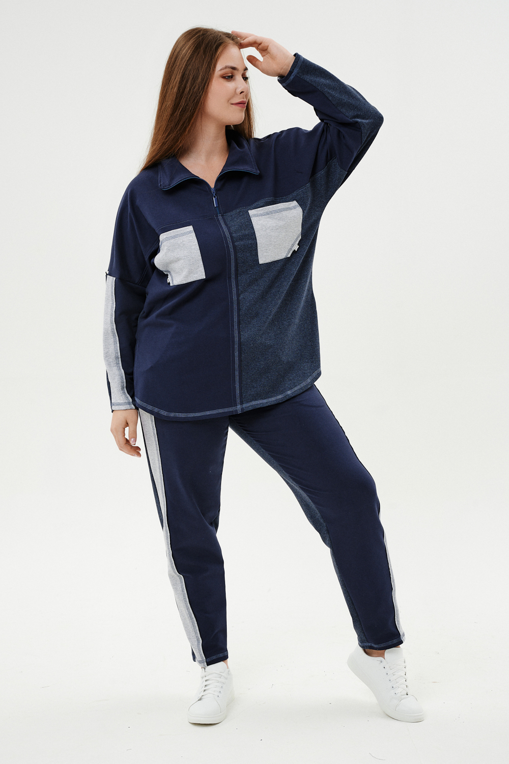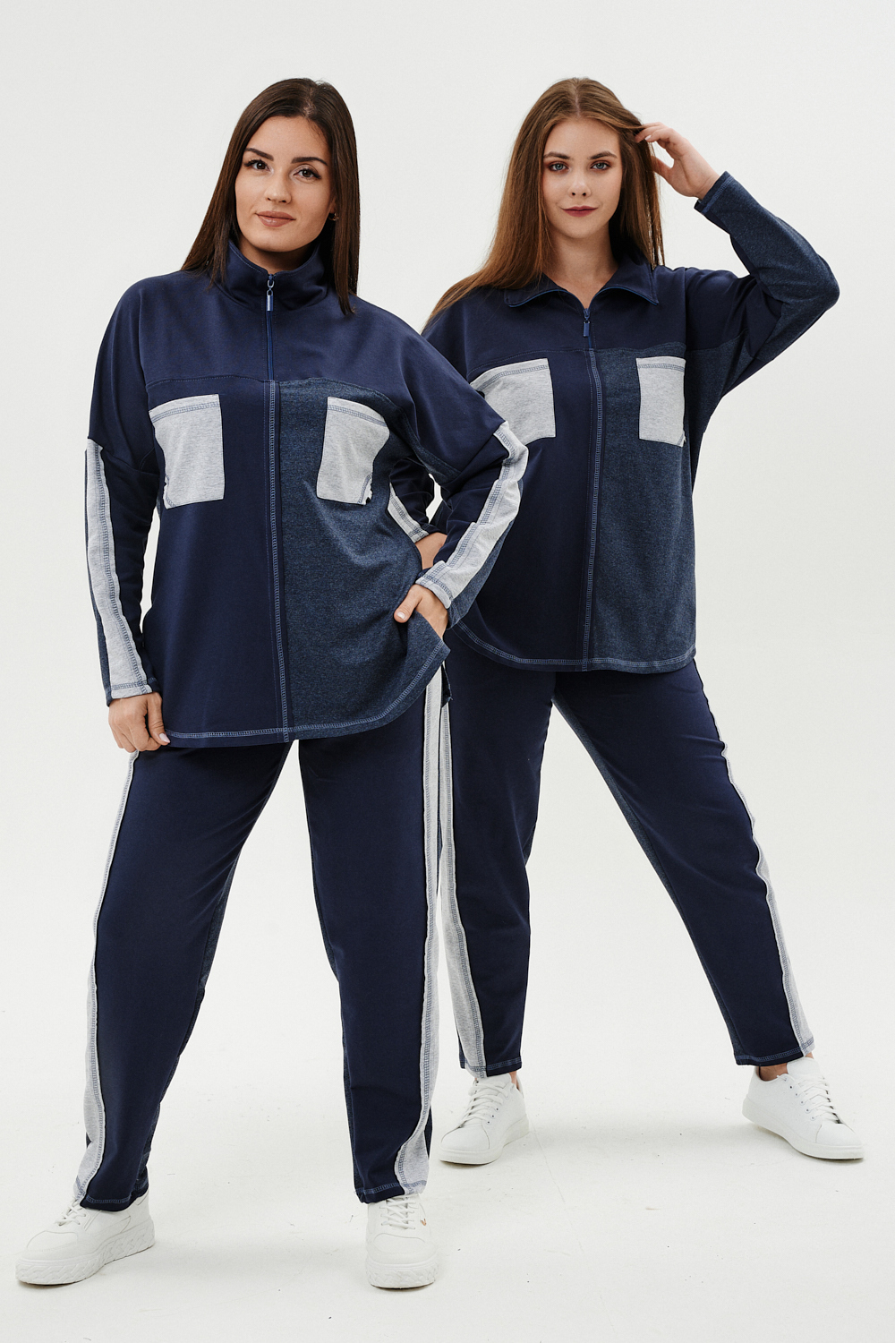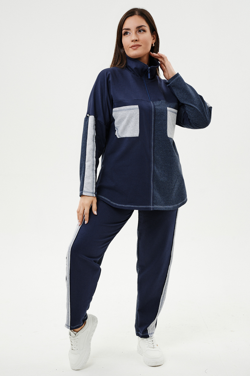 Костюм женский: толстовка и брюки. Толстовка прямого силуэта, брюки свободные по бедрам, зауженные к низу. Рукав цельнокроенный со швом. Воротник-стойка застегивается на тесьму-молнию. В костюме удачно сочетается однотонный футер с меланжированным. На спинке и полочке кокетки. Нагрудные карманы, лампасы на рукавах и брюках из контрастной отделочной ткани. На передних половинках брюк внутренние карманы.